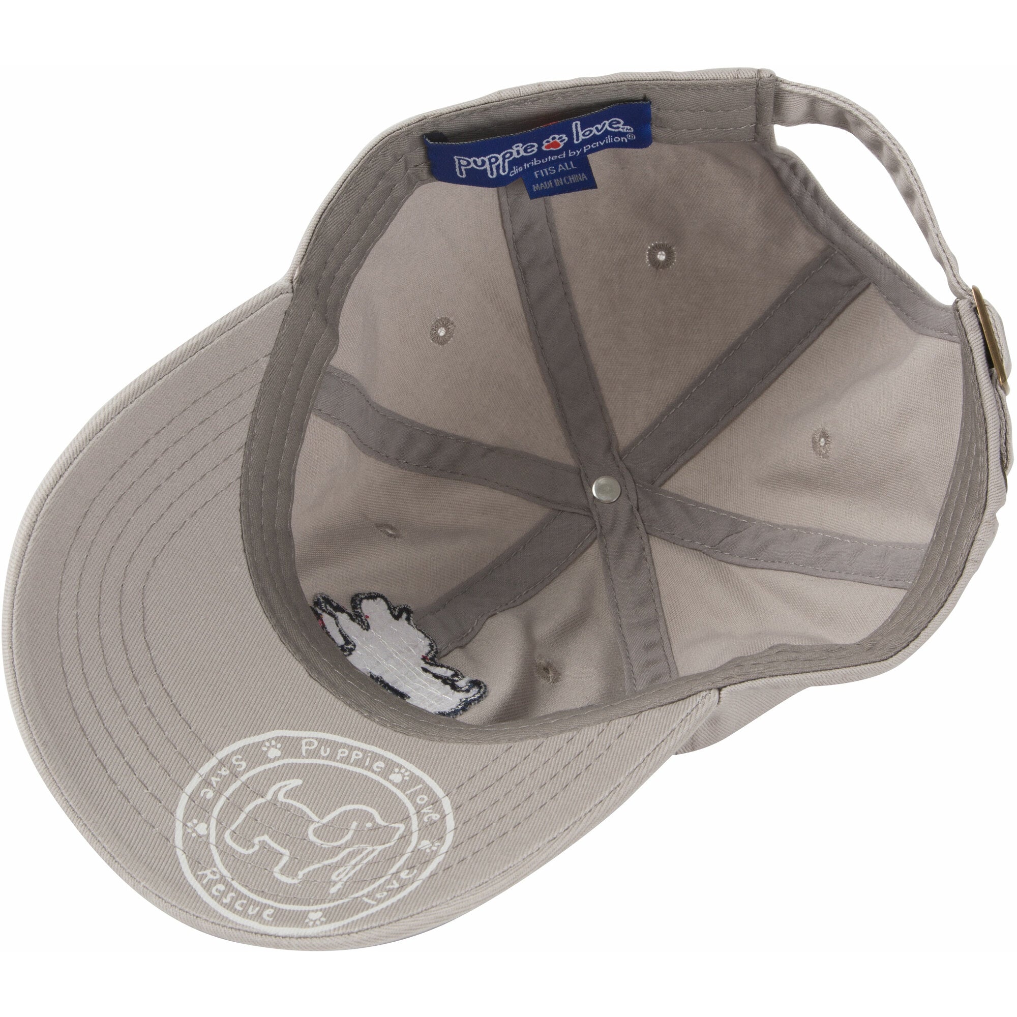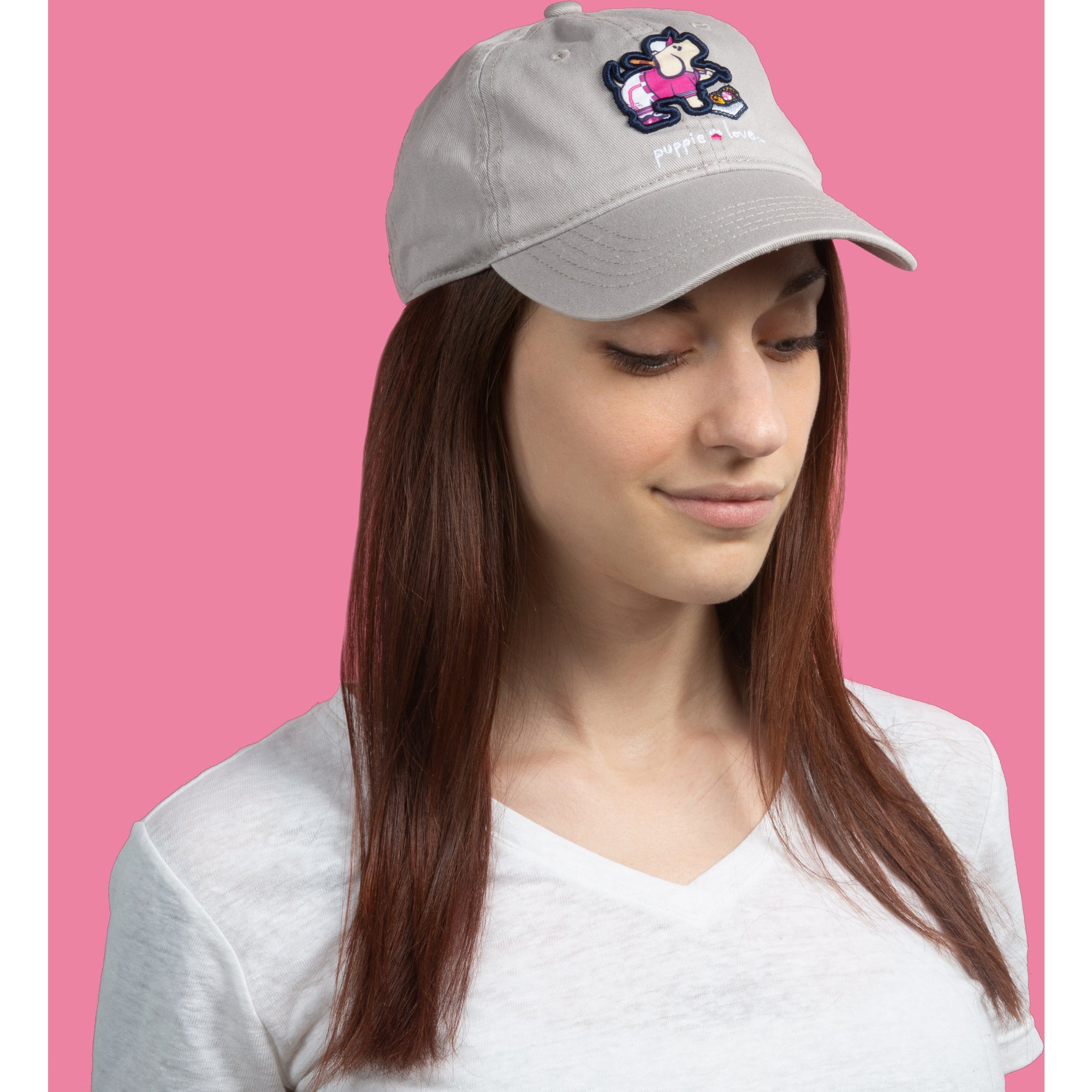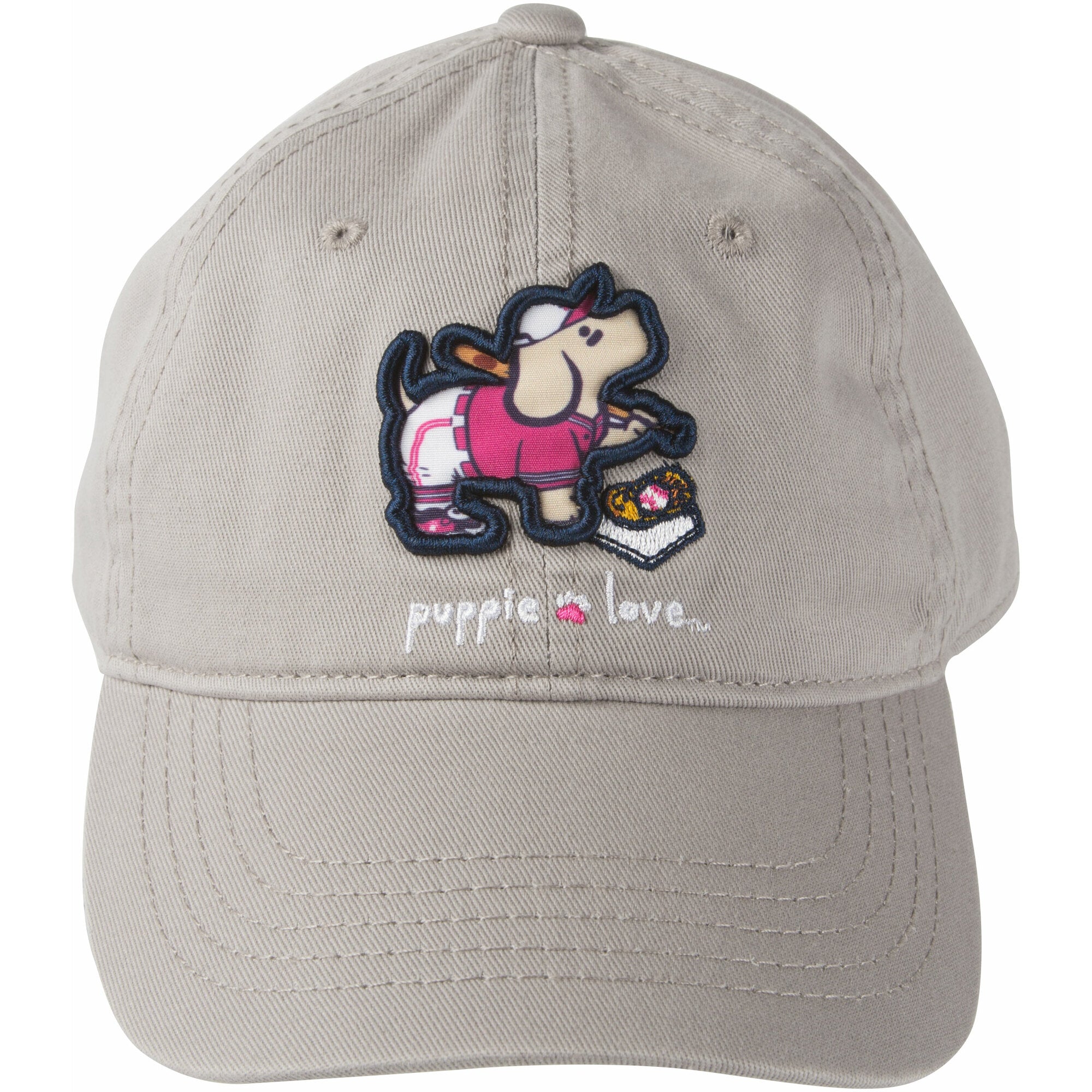 - IN-HOUSE DESIGN: "Puppie Love" text is embroidered on the front of the hat next to a sewn-in puppy patch featuring a bat, clothes, and a glove. The brim features a screen-printed "Puppie Love" logo.