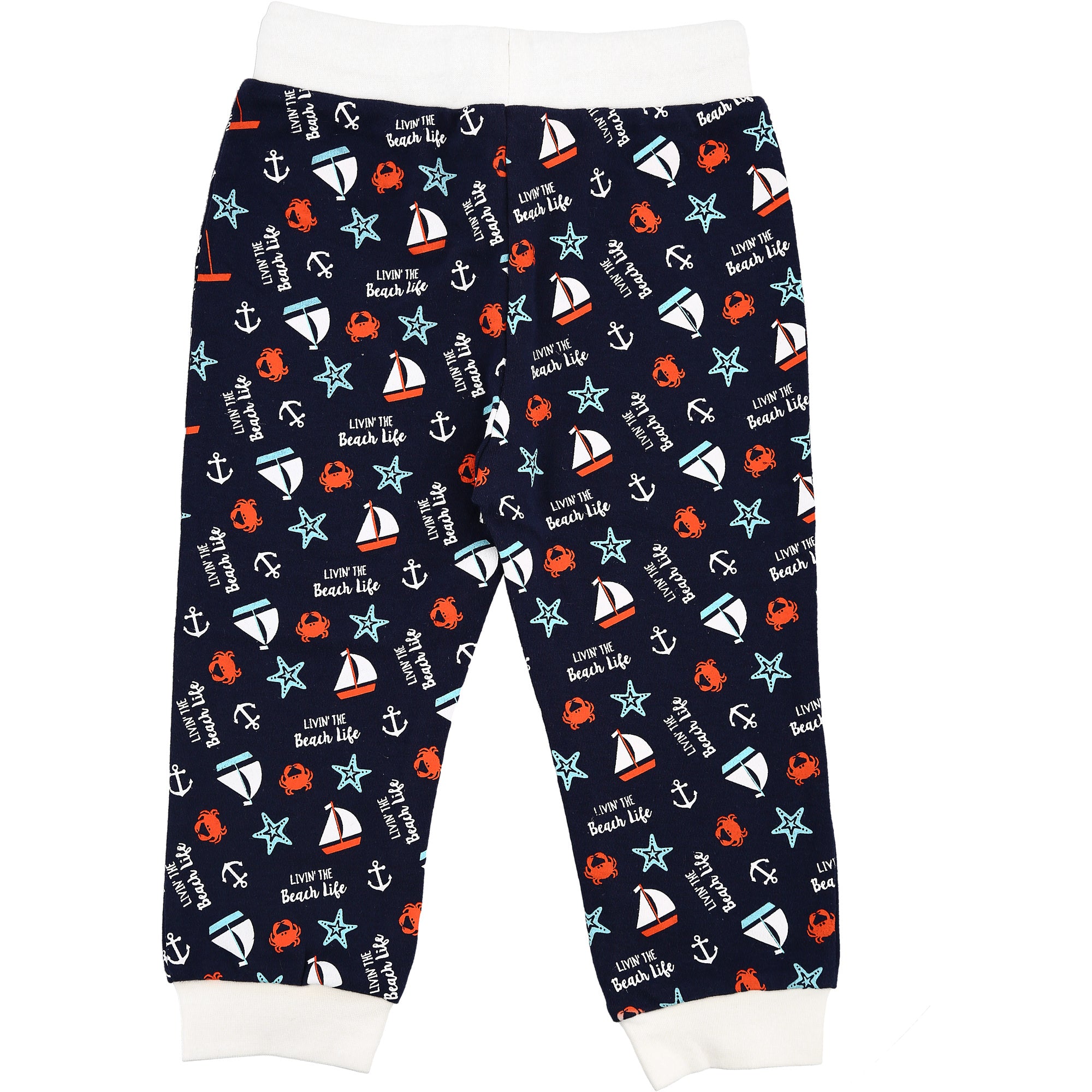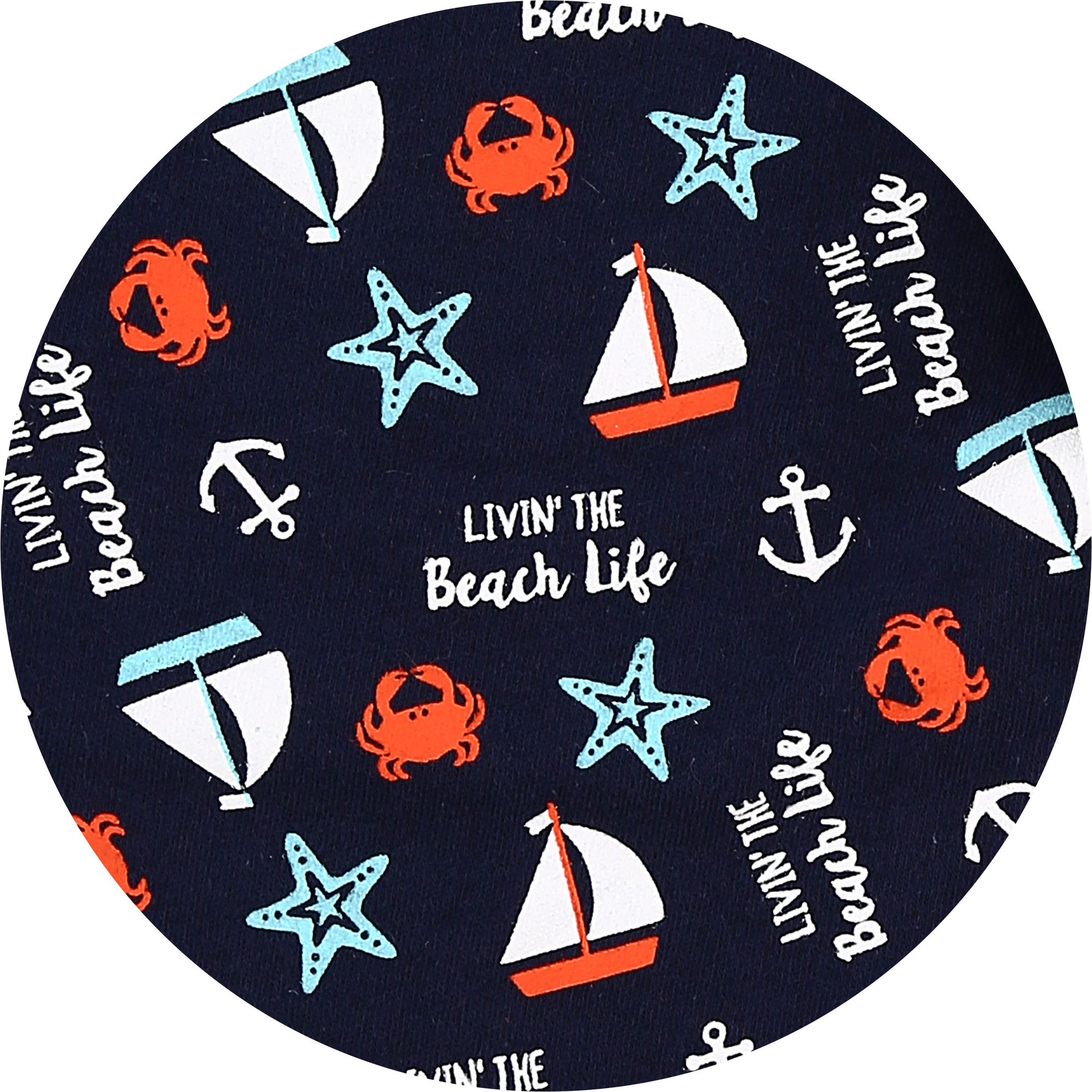 • IN-HOUSE DESIGN: The waistband has a star-shaped embroidered WB background. The red crabs, white anchors, blue starfish, and sale boat patterns accompany a repeating "Livin' The Beach Life" white sentiment.