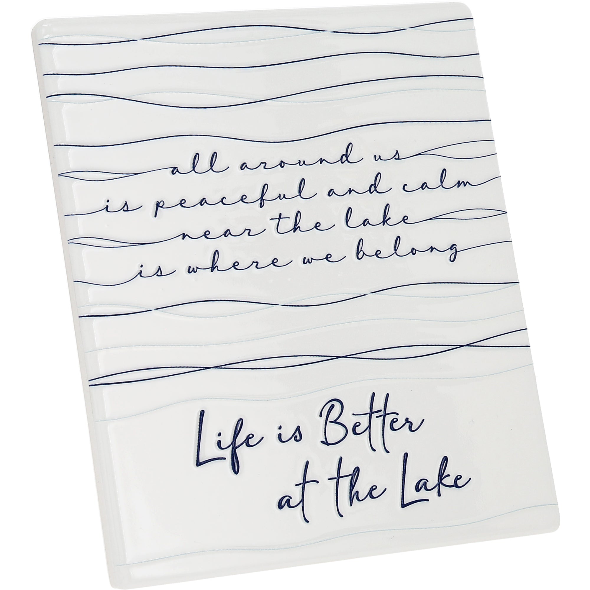 - IN-HOUSE DESIGN: The top half of the plaque features soft blue hand-drawn wave lines and the scripted message: “All around us is peaceful and calm, near the lake is where we belong.” Below, in large raised lettering, the sentiment “Life is Better at the Lake” is printed in deep lake blue. The layered linework gives the plaque dimension and calm coastal vibes.
