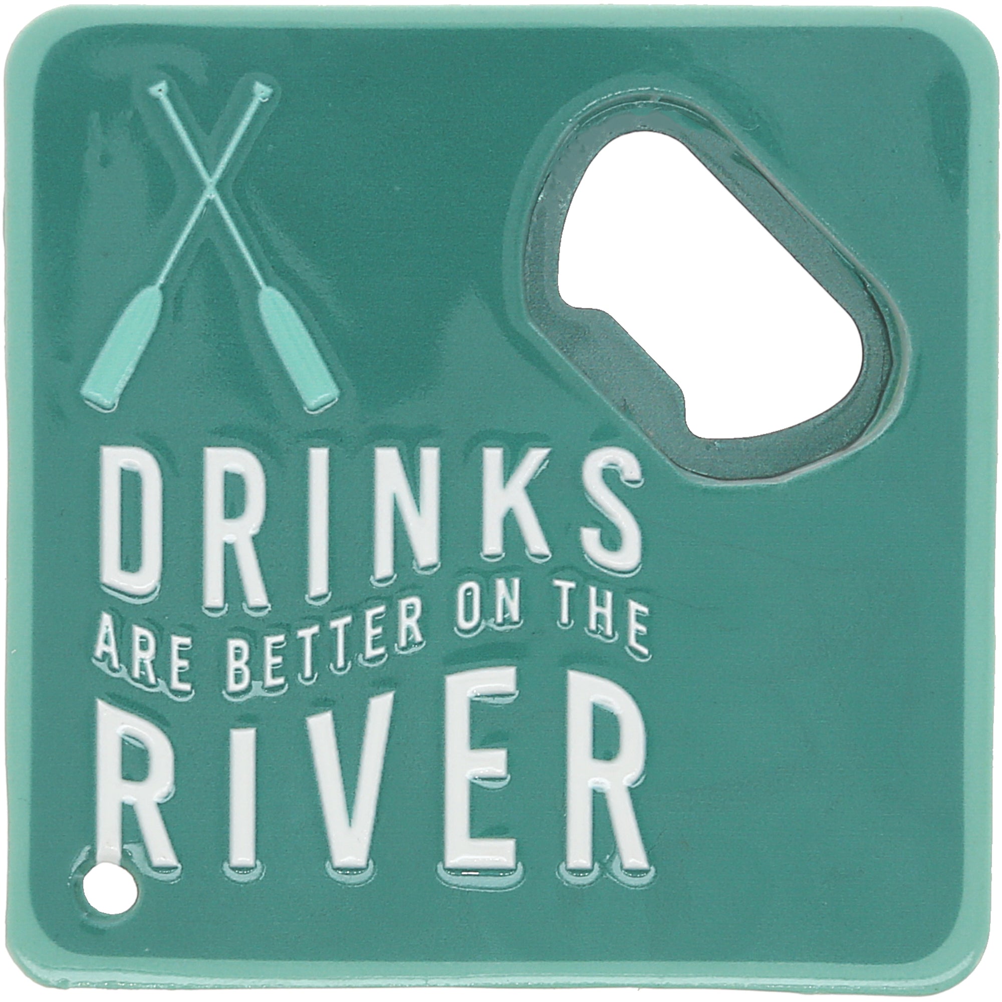 - IN-HOUSE DESIGN: Featuring crossed paddle artwork and bold white text reading “Drinks Are Better on the River,” this We People design channels calm, current-inspired tones of deep teal and blue-green. The raised details add dimension and grip, complementing the sleek metallic opener accent for a refined yet casual river aesthetic.