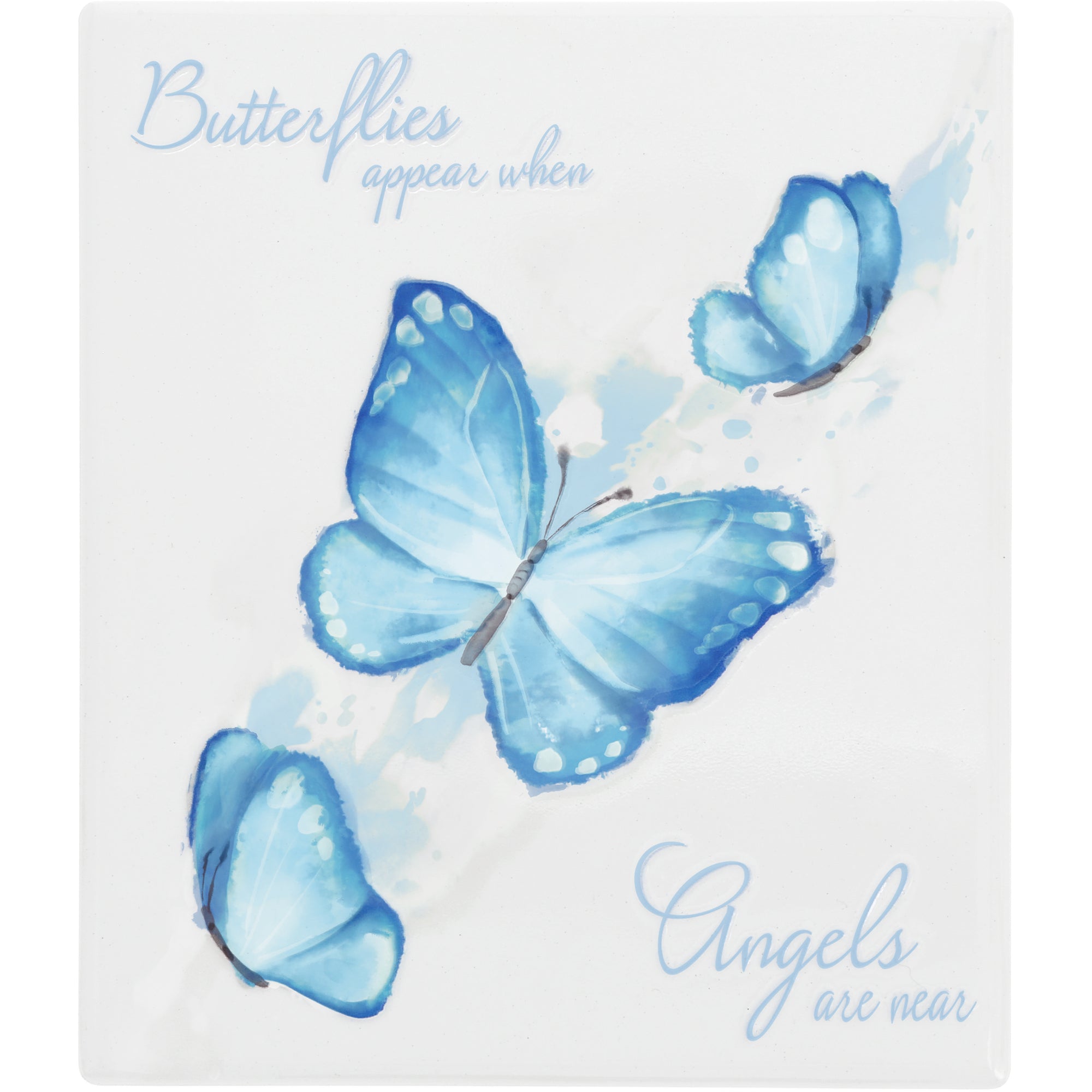 - PREMIUM QUALITY: This 4.75" x 5.5" easel-back ceramic plaque features a glossy finish with raised and printed butterfly artwork. Designed with calming blue tones and a soft gradient background, it reflects peace and serenity. The sturdy easel back makes it easy to display on any flat surface, while the white die-cut box provides safe packaging for gift-giving.