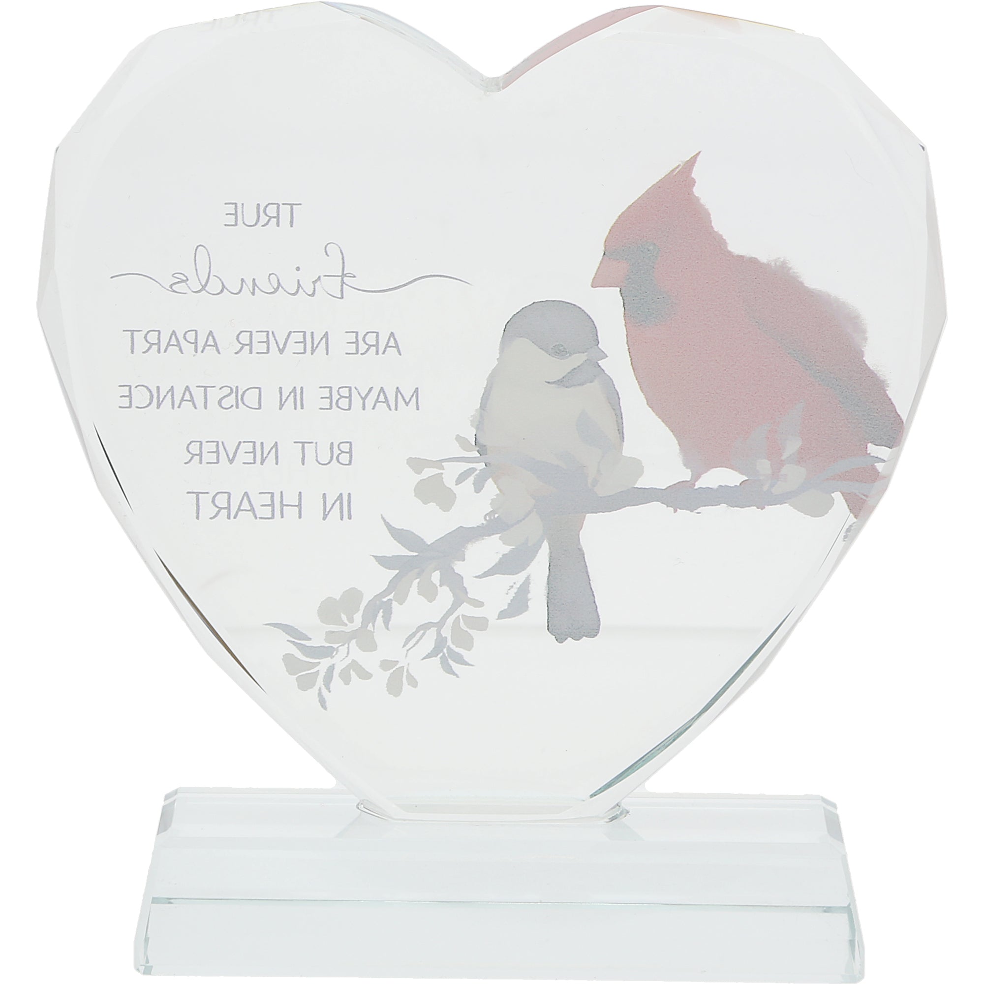 • IN-HOUSE DESIGN: This striking 4" crystal heart plaque features the heartfelt sentiment, "True friends are never apart maybe in distance but never in heart," adorned with exquisite illustrations of a cardinal and chickadee. Crafted with durable crystal, its versatile design effortlessly enhances any home décor, while the radiant finish catches the light beautifully. Perfect for gifting, this plaque celebrates special friendships and serves as a daily reminder of cherished connections, making it an ideal accent for shelves, desks, or mantels in any living space.