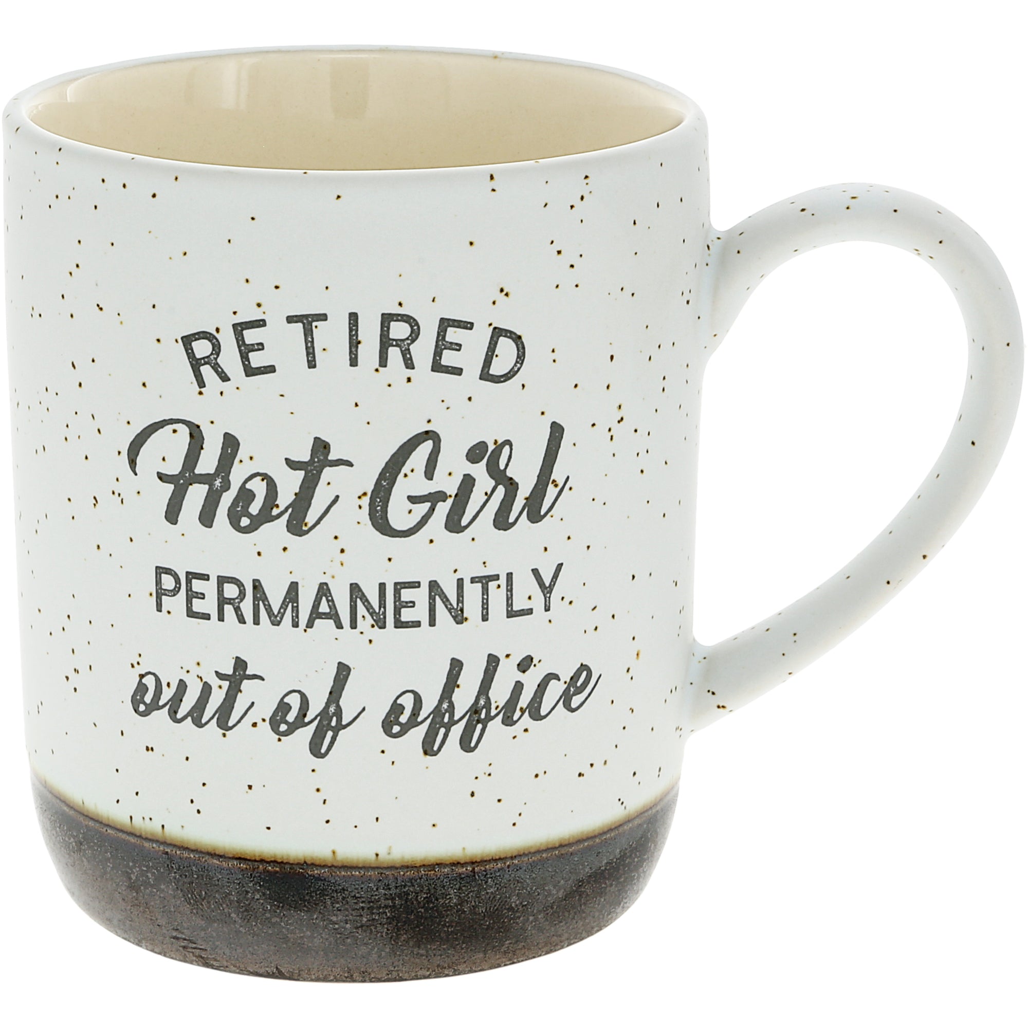 - PREMIUM QUALITY: This 15 oz stoneware mug features smooth, straight cylinder walls, with a glossy cream interior and a unique bronze metallic glaze covering the bottom sixth of the mug. The large, comfortable handle fits almost any hand size. The sentiment "Retired Hot Girl Permanently Out of Office" faces you when held in your right hand and faces outward when held in your left.