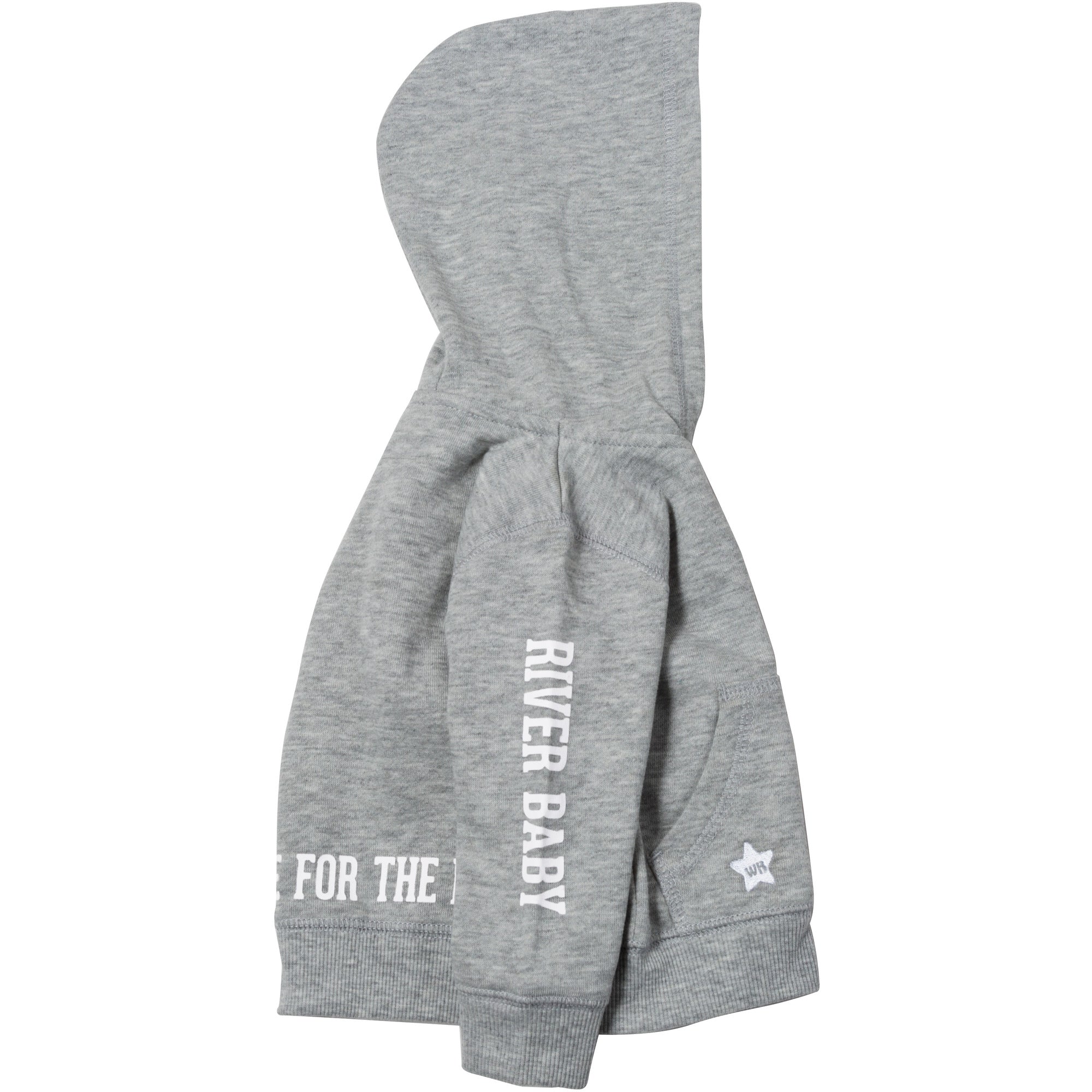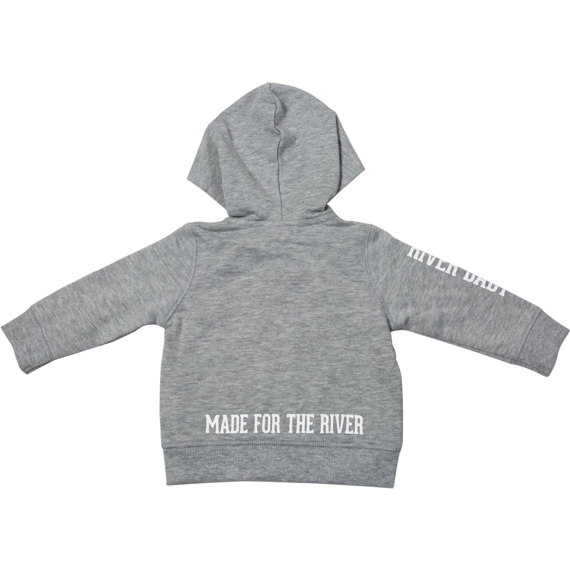 - IN-HOUSE DESIGN: "River Baby" text is printed onto the sleeve, We Baby logo and waves icon are embroidered onto the front of the hoodie, and "Made For The River" text is printed onto the back of the hoodie.