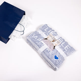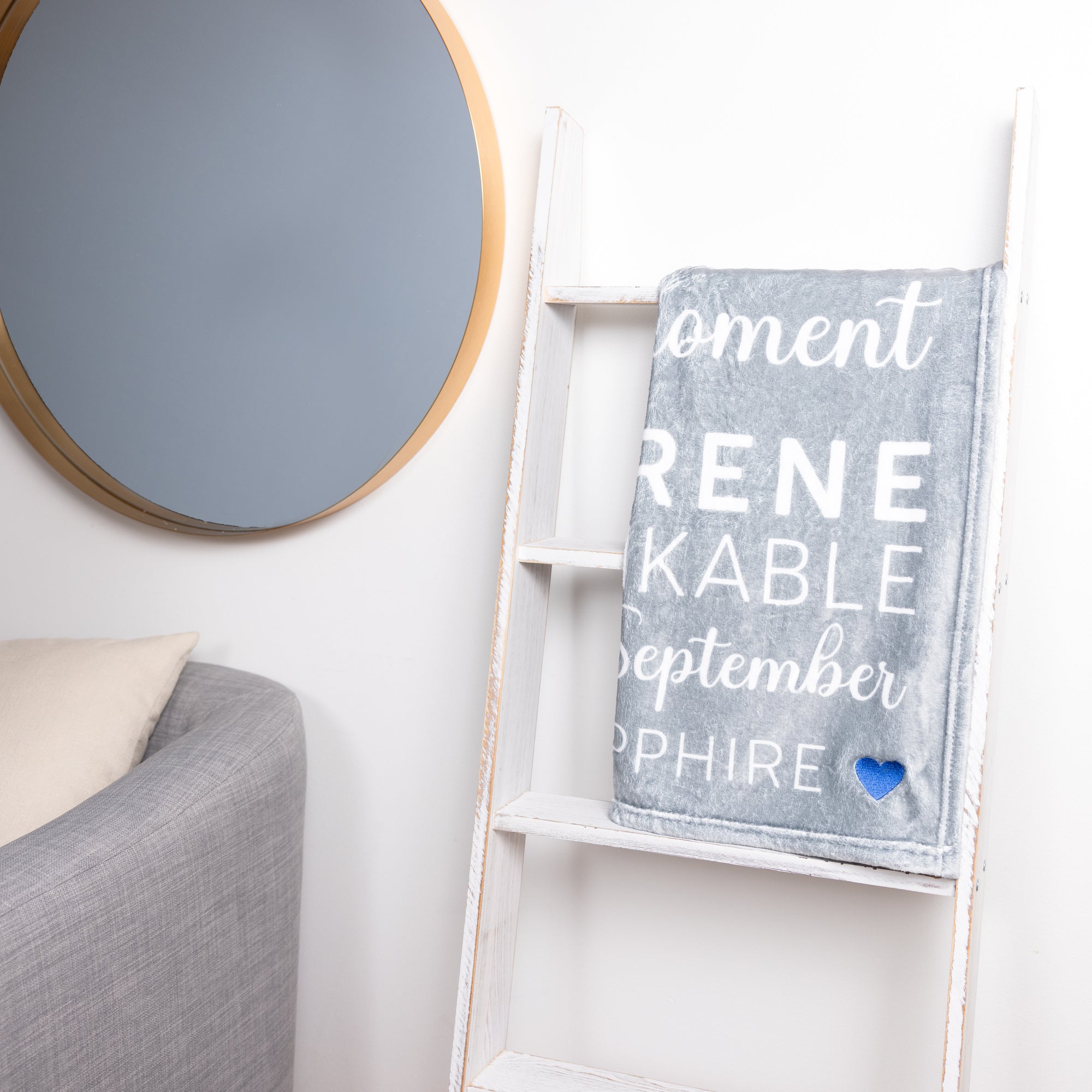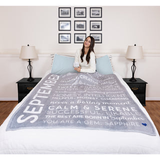 - IN-HOUSE DESIGN: The printed sentiment read "September" down the left side of the blanket along with an "Kind, Loyal, Trustworthy, Careful, Organized, So Clever And Knowledgeable, Confident, Industrious, Reliable, Creative, Patient, Contemplative And So Mindful, Sweet, Charismatic, Artistic, Responsible, A Calming And Soothing Presence, Honest, Intelligent, Helpful, Modest, Charming, Never A Boring Moment, Calm & Serene, Successful, Likable. The Best Are Born In September. You Are A Gem: Sapphire" which consists of a san serif and cursive font combo. The blue heart in the bottom corner of the blanket is embroidered. The reverse side is white only.