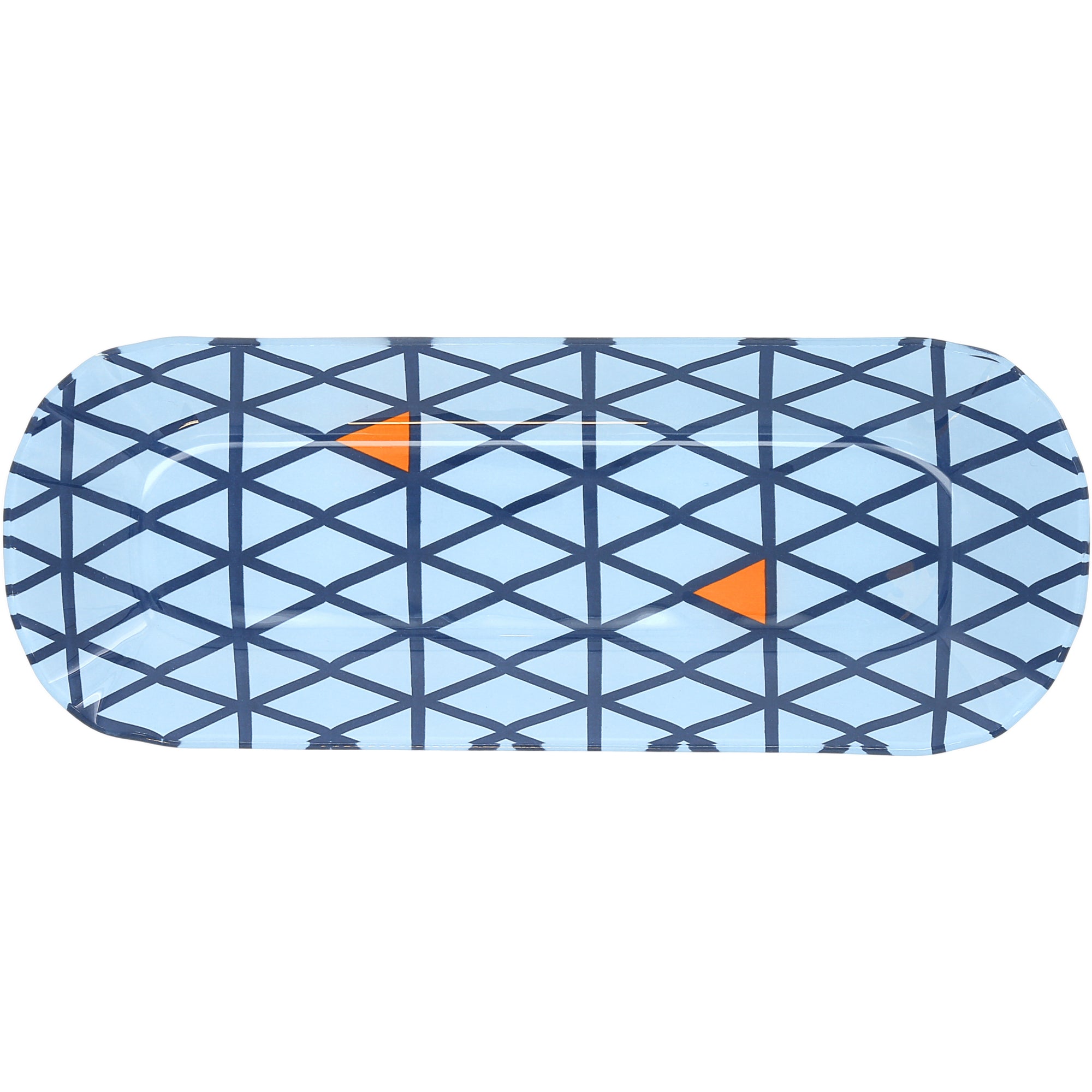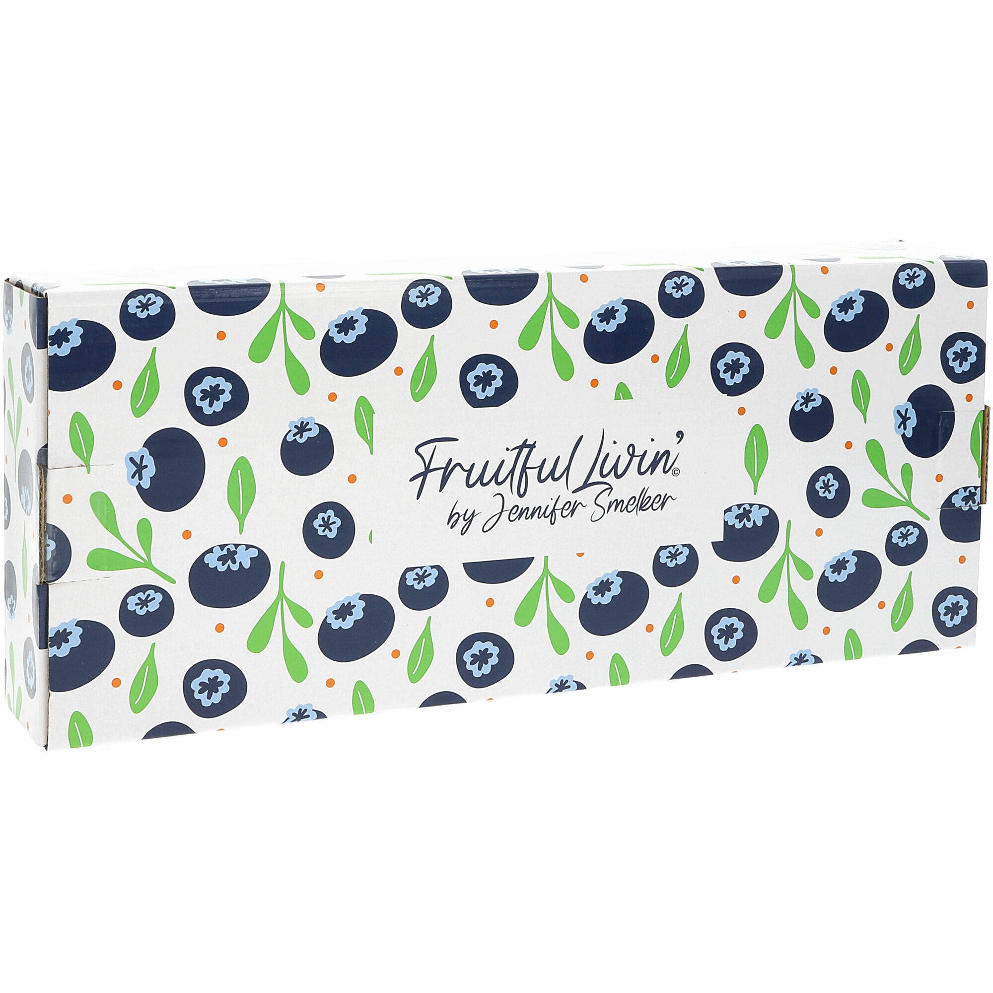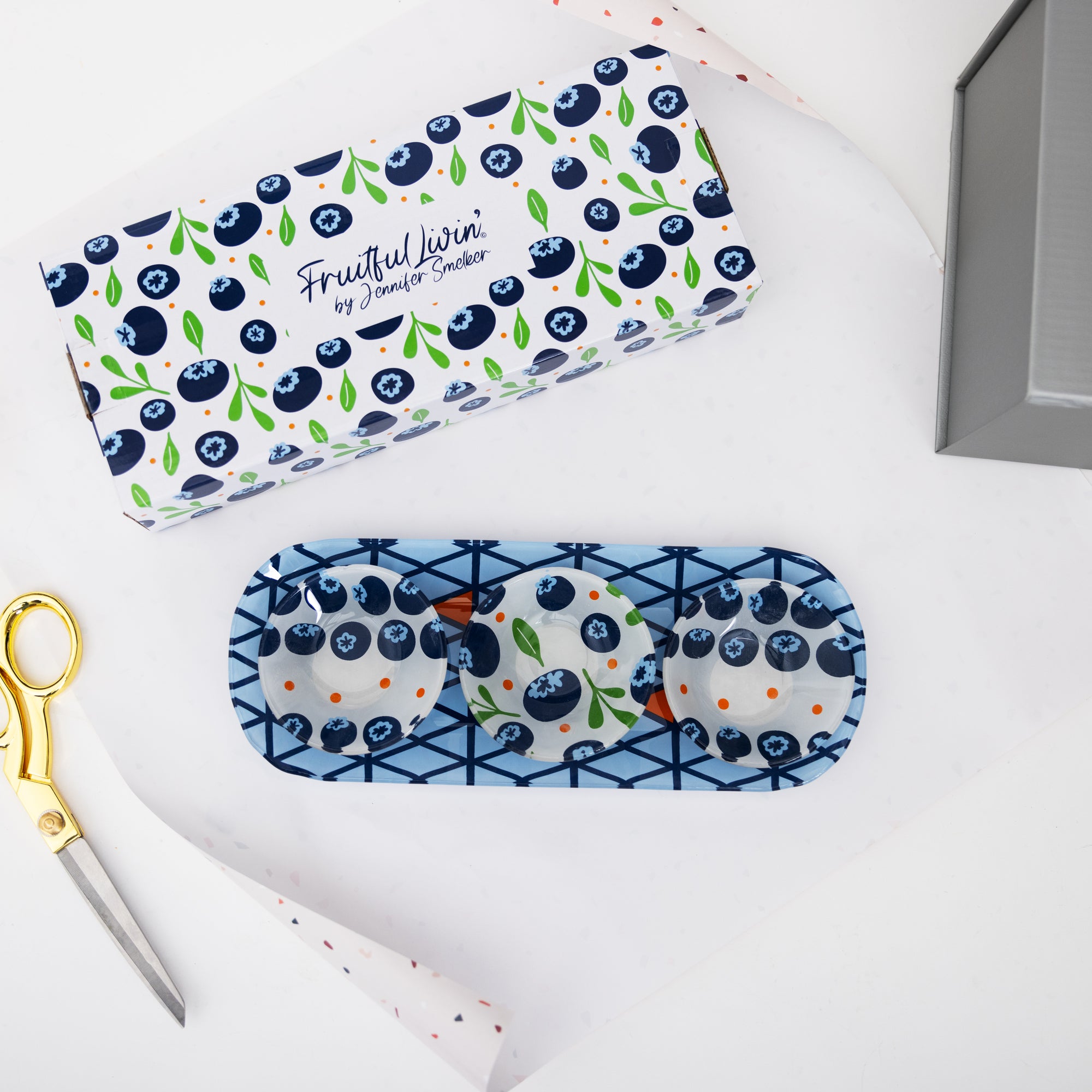 - IN-HOUSE DESIGN: All of the bowls have a white background. One bowl has blueberries and polka dots with greenery, and the other two bowls have multiple blueberry and orange polka dot designs. The tray has a blue/orange background with a darker blue triangle pattern.