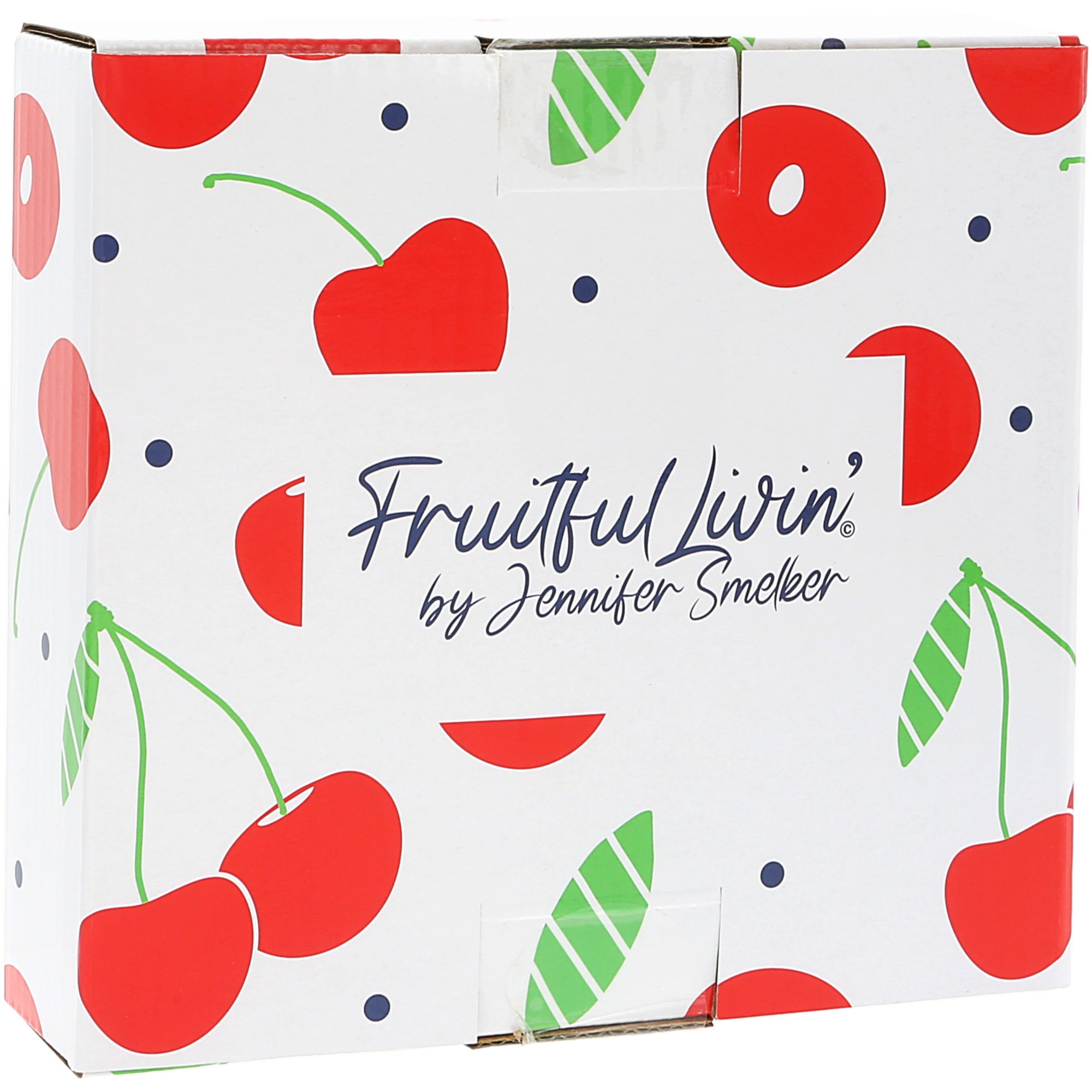 - IN-HOUSE DESIGN: Large and bold green-stemmed red cherries accompany blue polka dots on a white background.