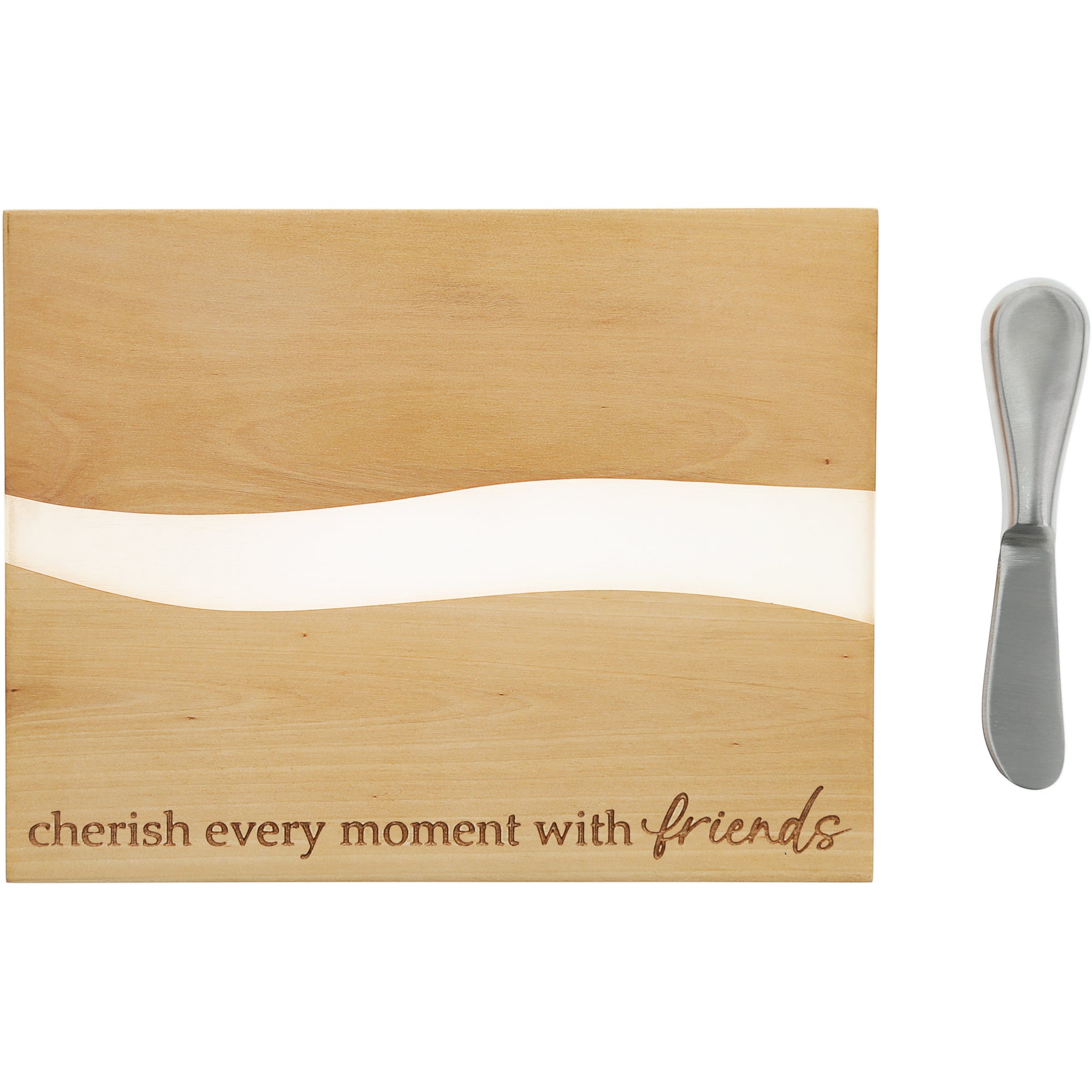 - IN-HOUSE DESIGN: "Cherish Every Moment With Friends" sentiment is engraved into the bottom of the tray. A stunning translucent white resin waved pattern reaches from one side of the board to the other in the center.
