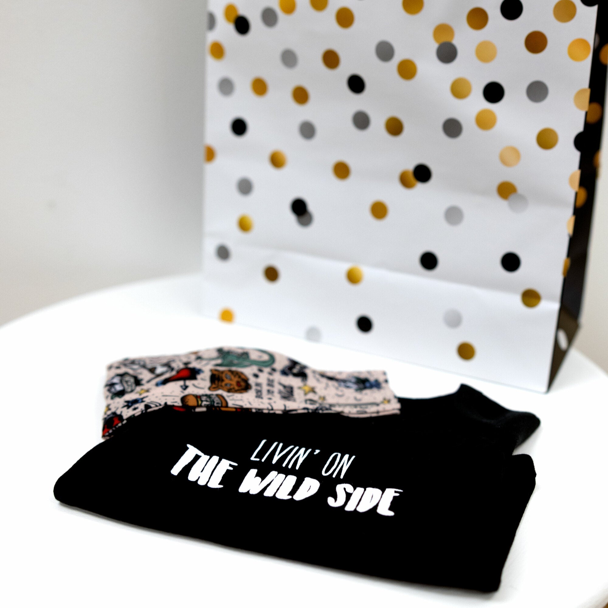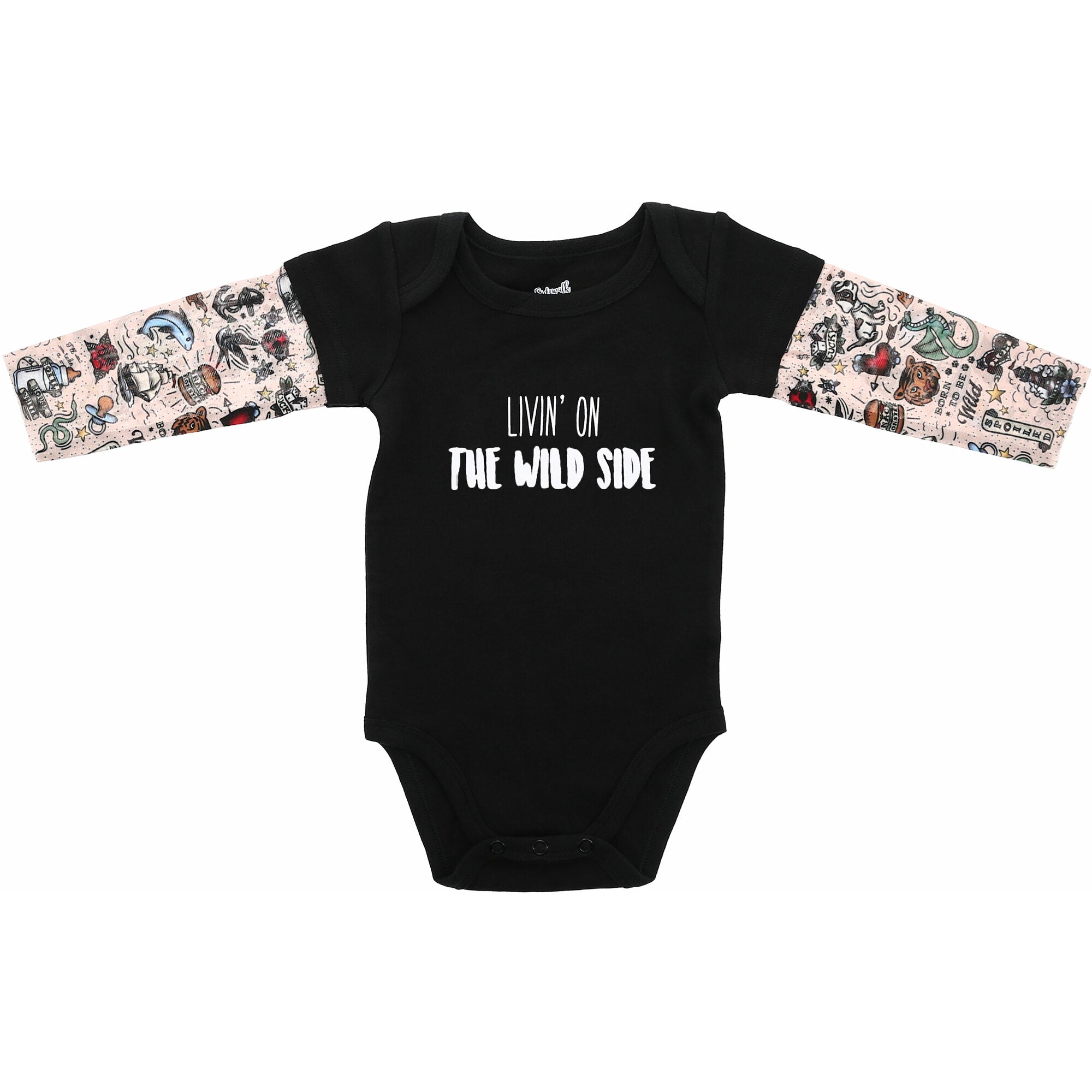 • IN-HOUSE DESIGN: The sleeves consist of new school-style inspired drawings, including puppies, pawprints, dice, hearts, stars, flowers, dragons, bottles, binkies, sailboats, waves, lighthouses, dolphins, tigers, birds, ladybugs, anchors, stars, snakes, polka dots, burgers, "Born To Be Wild," "Mom," "Spoiled," "I'll Take A Bottle Of House White," "Snack Monster," "Lucky," and more which all consist of the colors of the rainbow. The front chest center has a "Livin' On The Wild Side" sentiment.