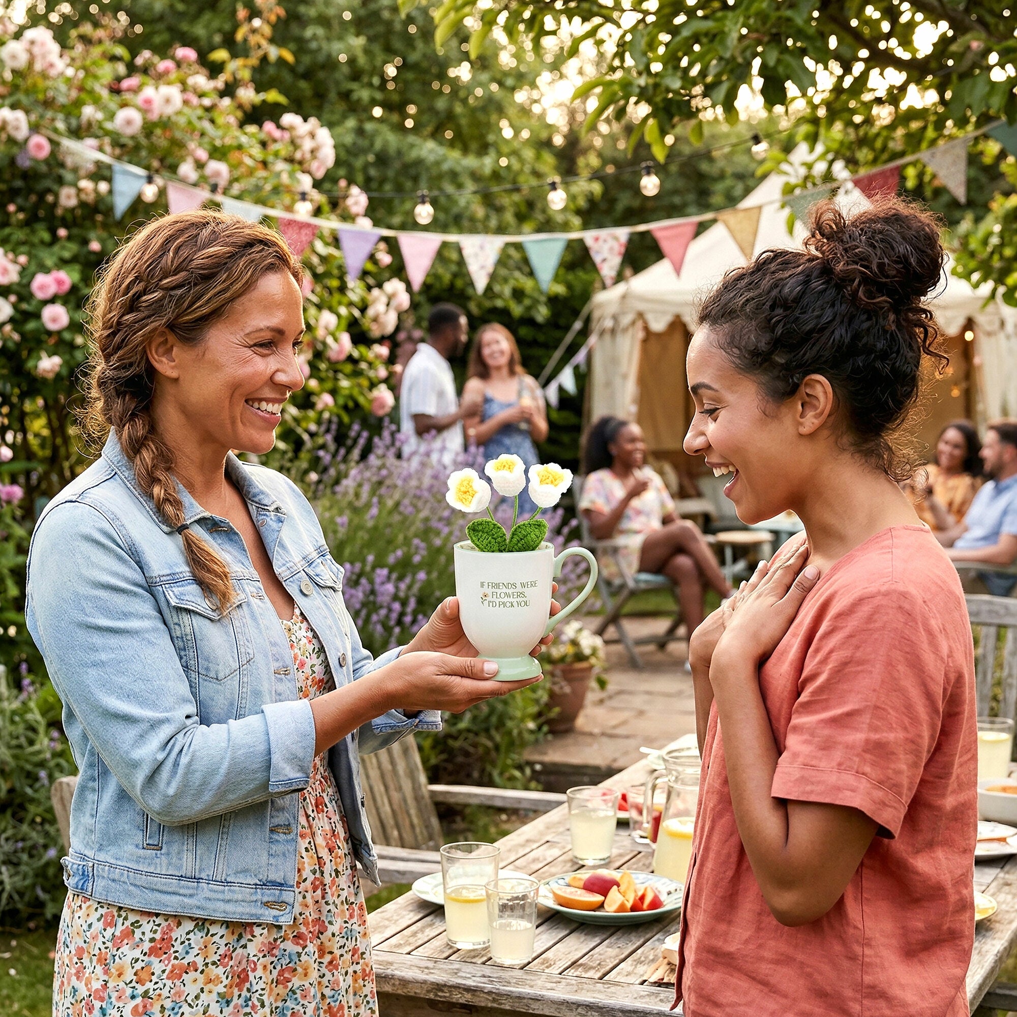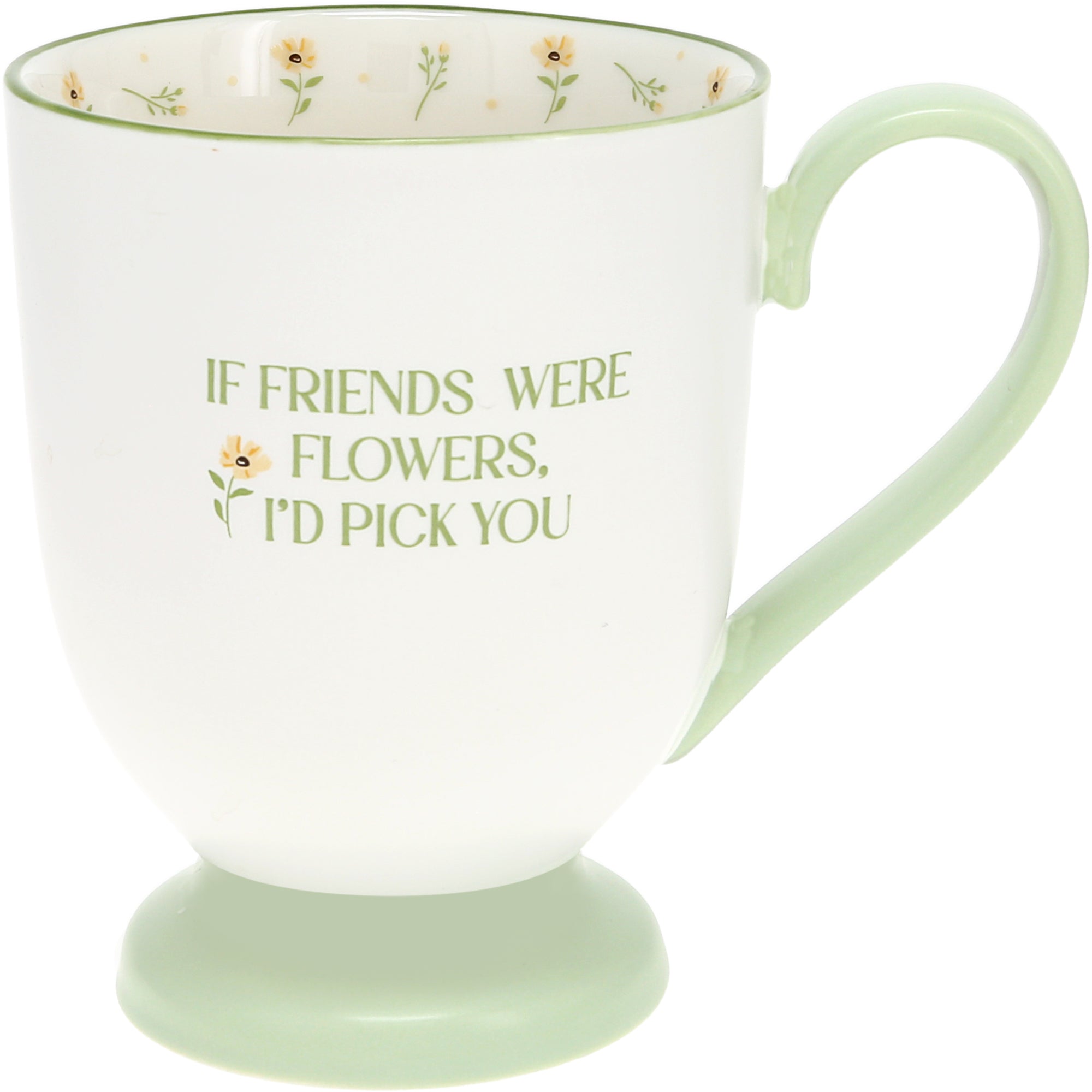 - PREMIUM QUALITY: This 12 oz stoneware mug combines matte sage green tones with a glossy white interior and raised glossy printed lettering that reads, “If Friends Were Flowers, I’d Pick You.” Included is a matching crochet flower bouquet in cream and yellow hues, handmade with care to brighten any space. Dishwasher and microwave safe, FDA/Prop 65 compliant, and crafted for durability and joy.