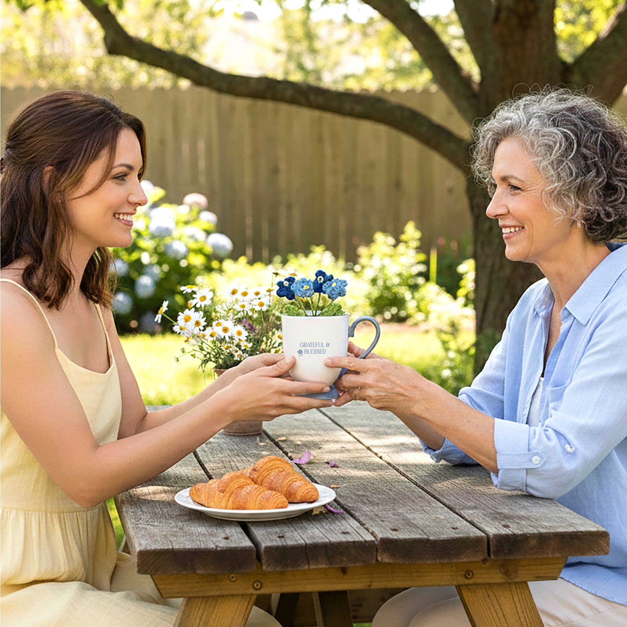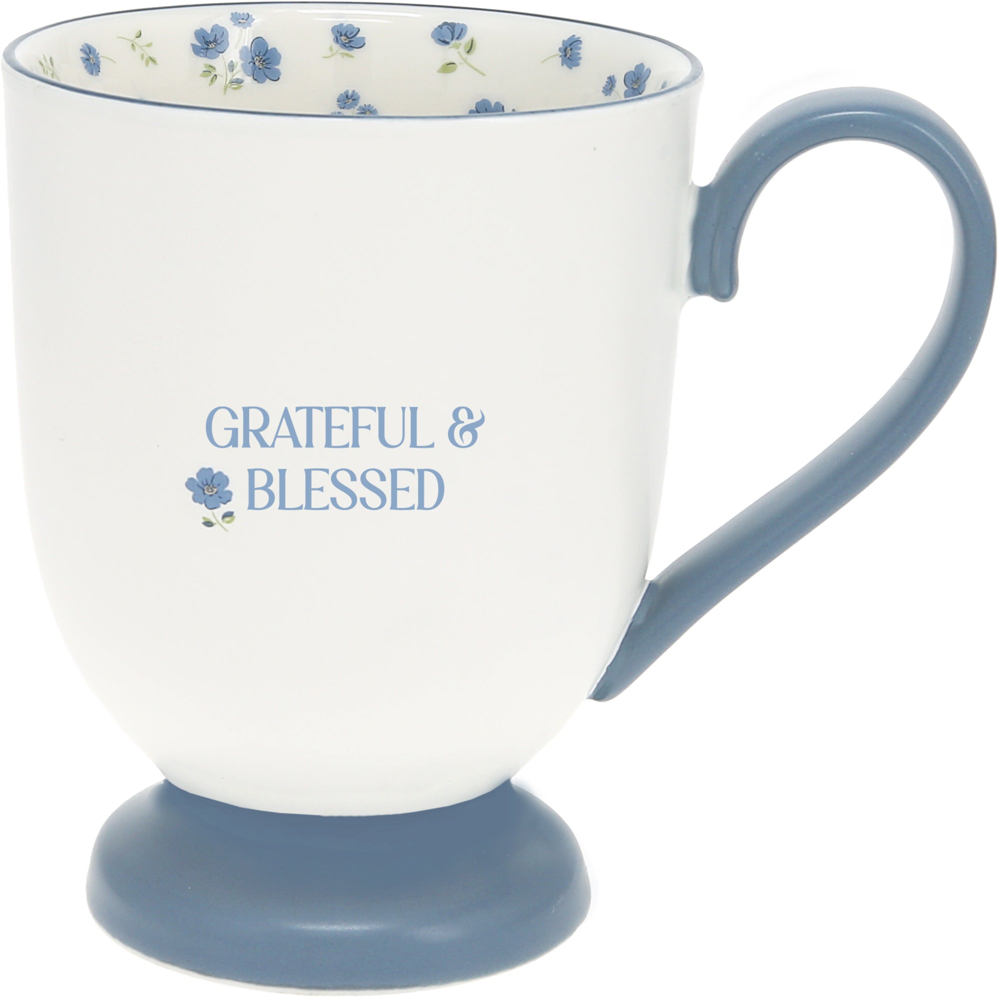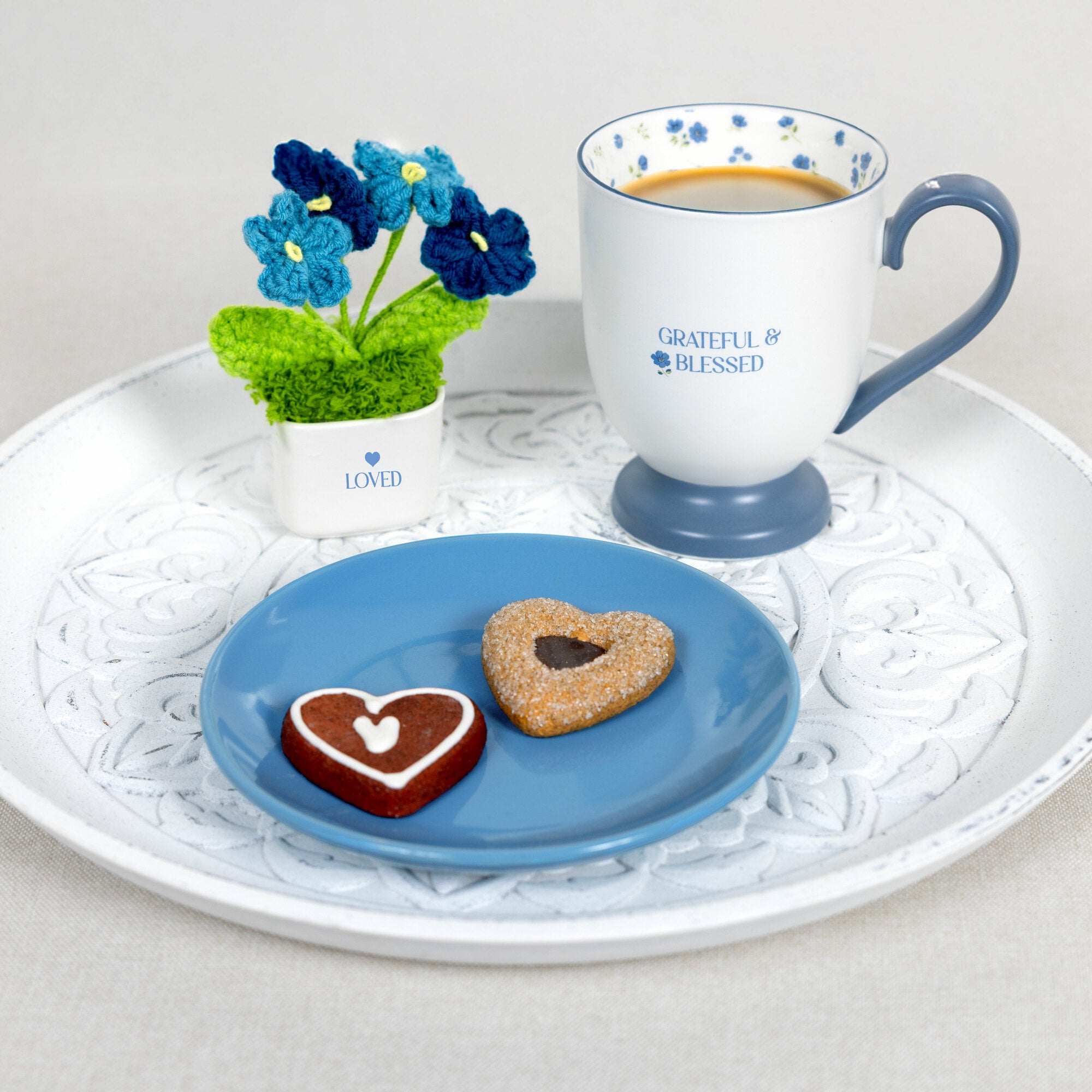 - PREMIUM QUALITY: This 12 oz mug is made from durable stoneware featuring a matte navy glaze with a glossy interior and embossed glossy printed artwork that reads, “Grateful & Blessed.” Each set includes a handmade crochet bouquet in complementary blue and white tones. Dishwasher and microwave safe, and fully Prop 65 compliant for peace of mind and long-lasting use.
