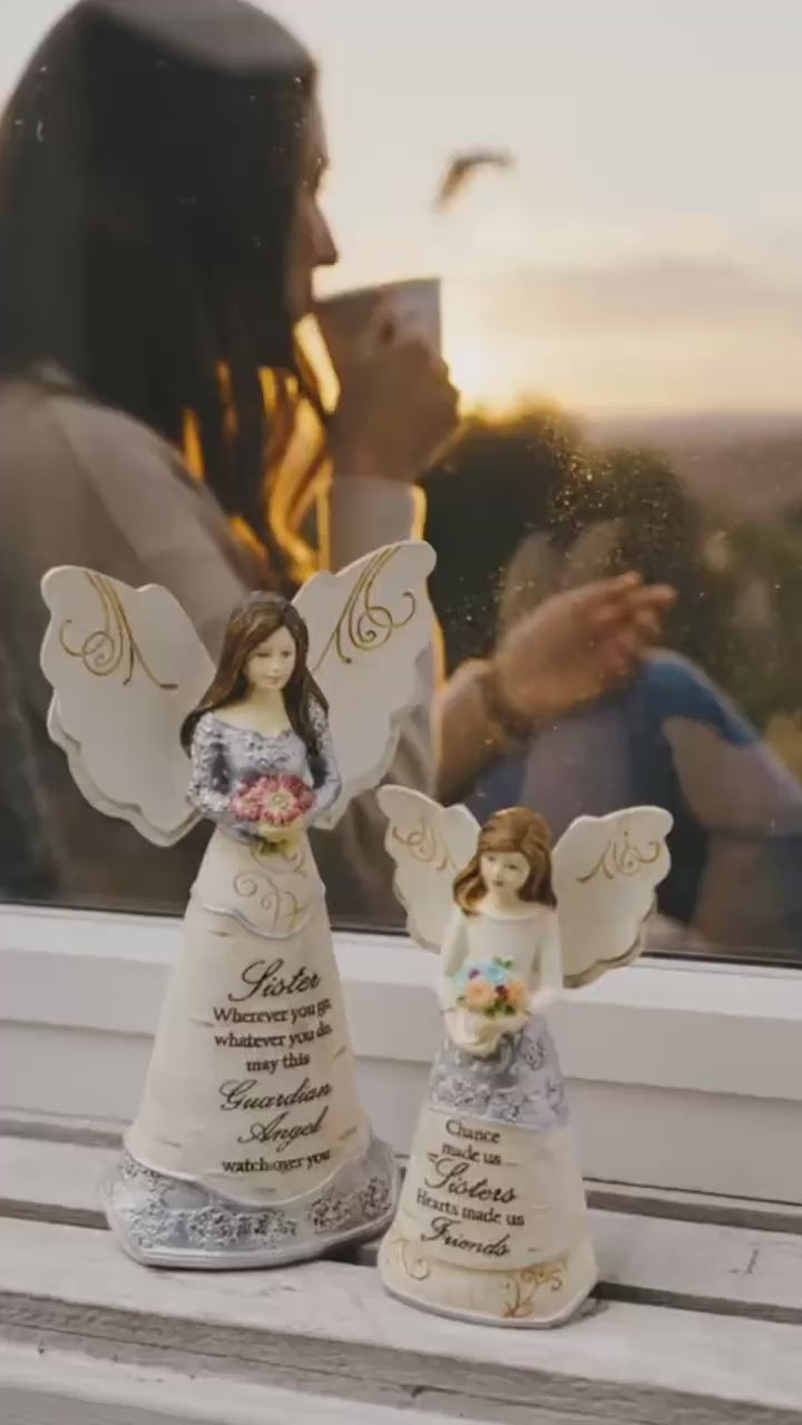 - IN-HOUSE DESIGN: "Sister Wherever You Go, Whatever You Do, May This Guardian Angel Watch Over You" text is debossed and painted onto the front of the angel, alongside an intricate silver design and flowers. The brown haired angel is holding a beautiful bouquet of pink flowers. There are foam pads on the bottom to prevent surfaces from being scratched.