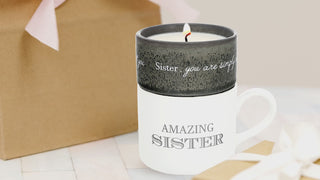 - IN-HOUSE DESIGN: Wrap-around white sentiment on the candle, "Sister, You Are Simply Amazing And I Could Not Imagine Life Without You." Gray mug sentiment "Amazing Sister" on the front side of the mug only. Faces towards you in the right hand or outward in the left hand.