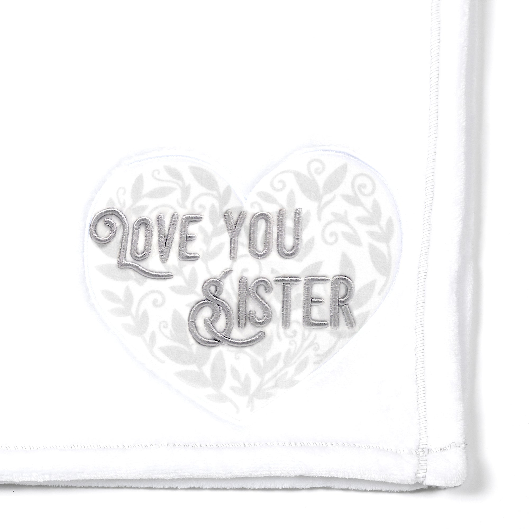 - IN-HOUSE DESIGN: The bottom right corner of the front of the white home décor blanket features an uplifting and comforting gray "Love You Sister" embroidered sentiment with gray stitched edges on a white heart with a gray vine-printed design embroidered edge patch.