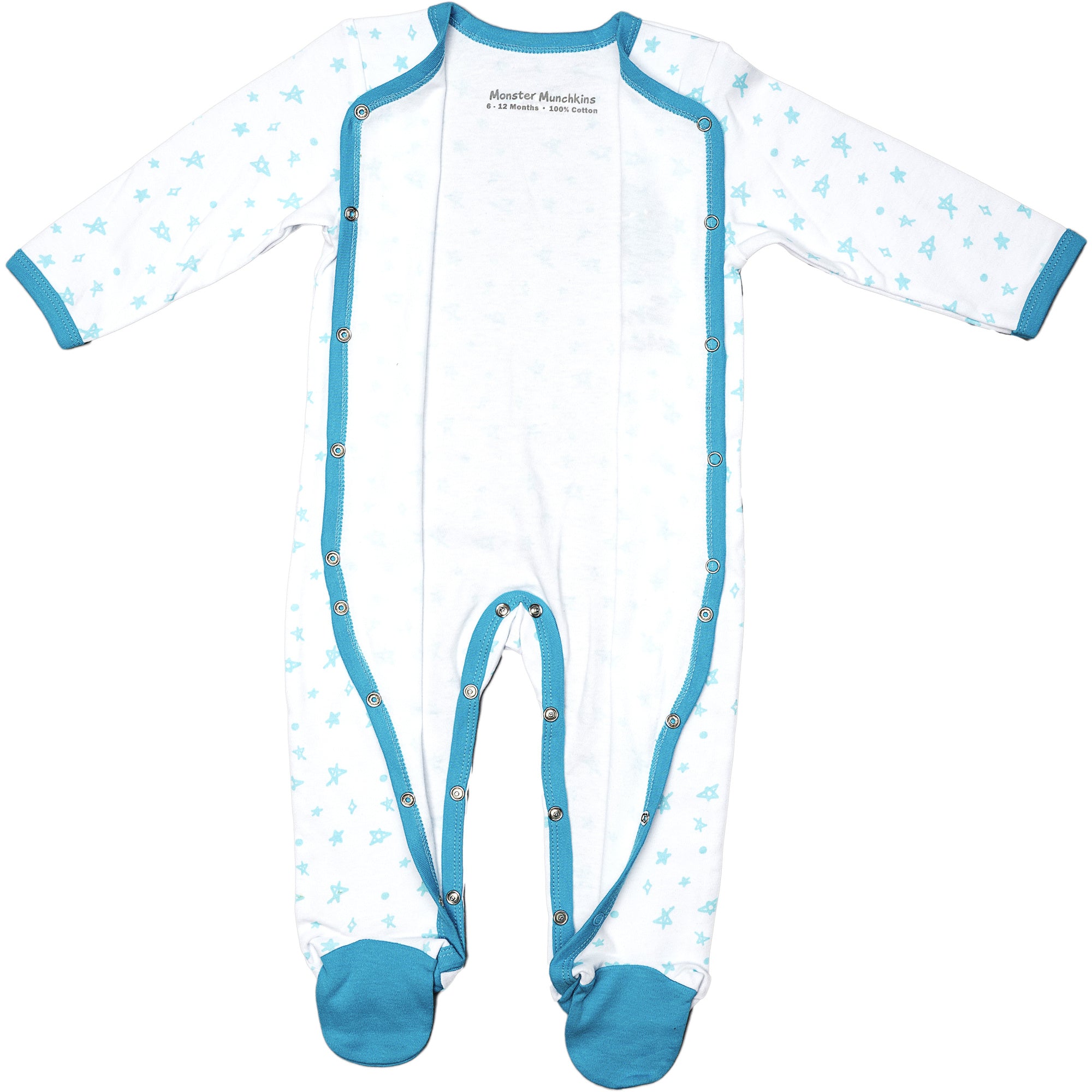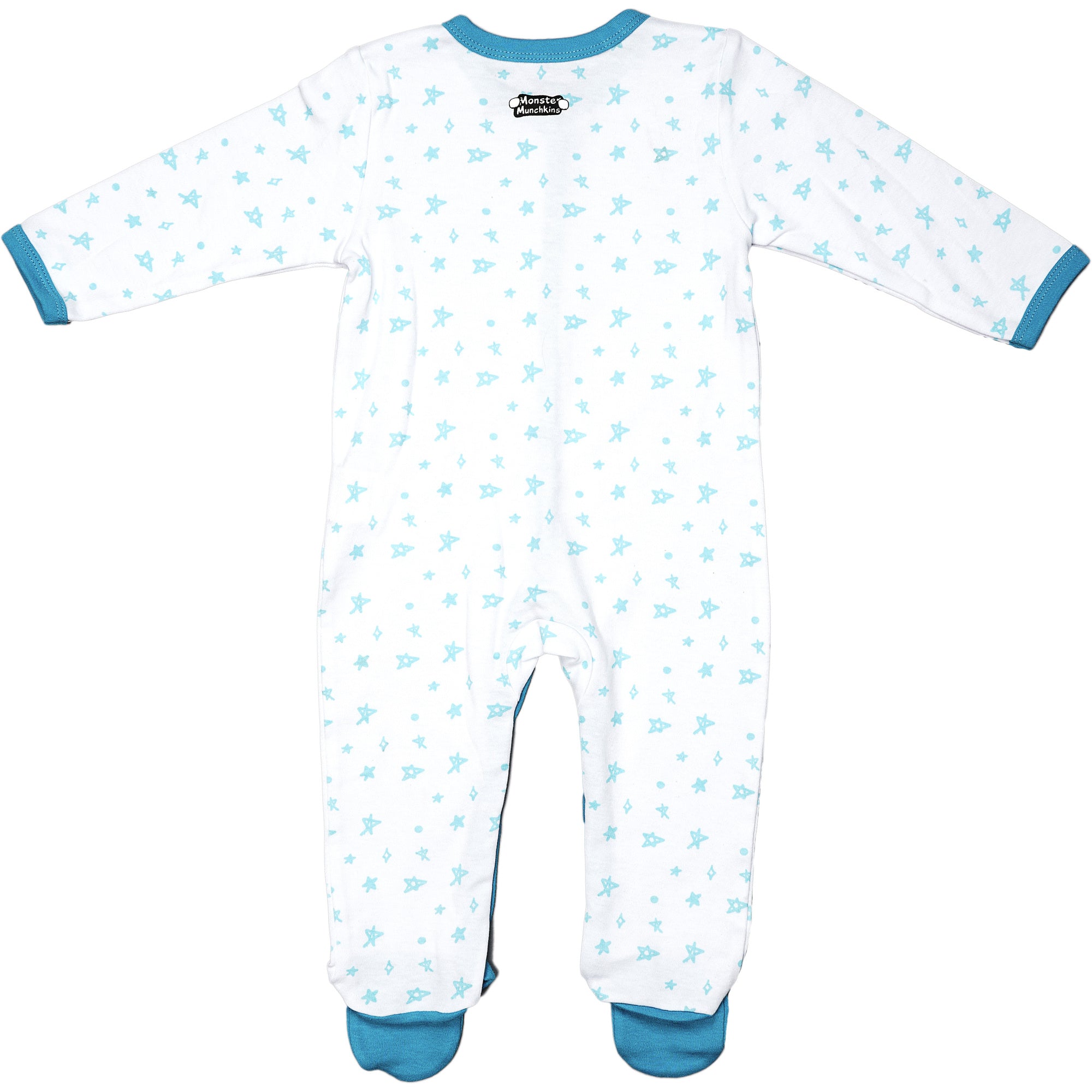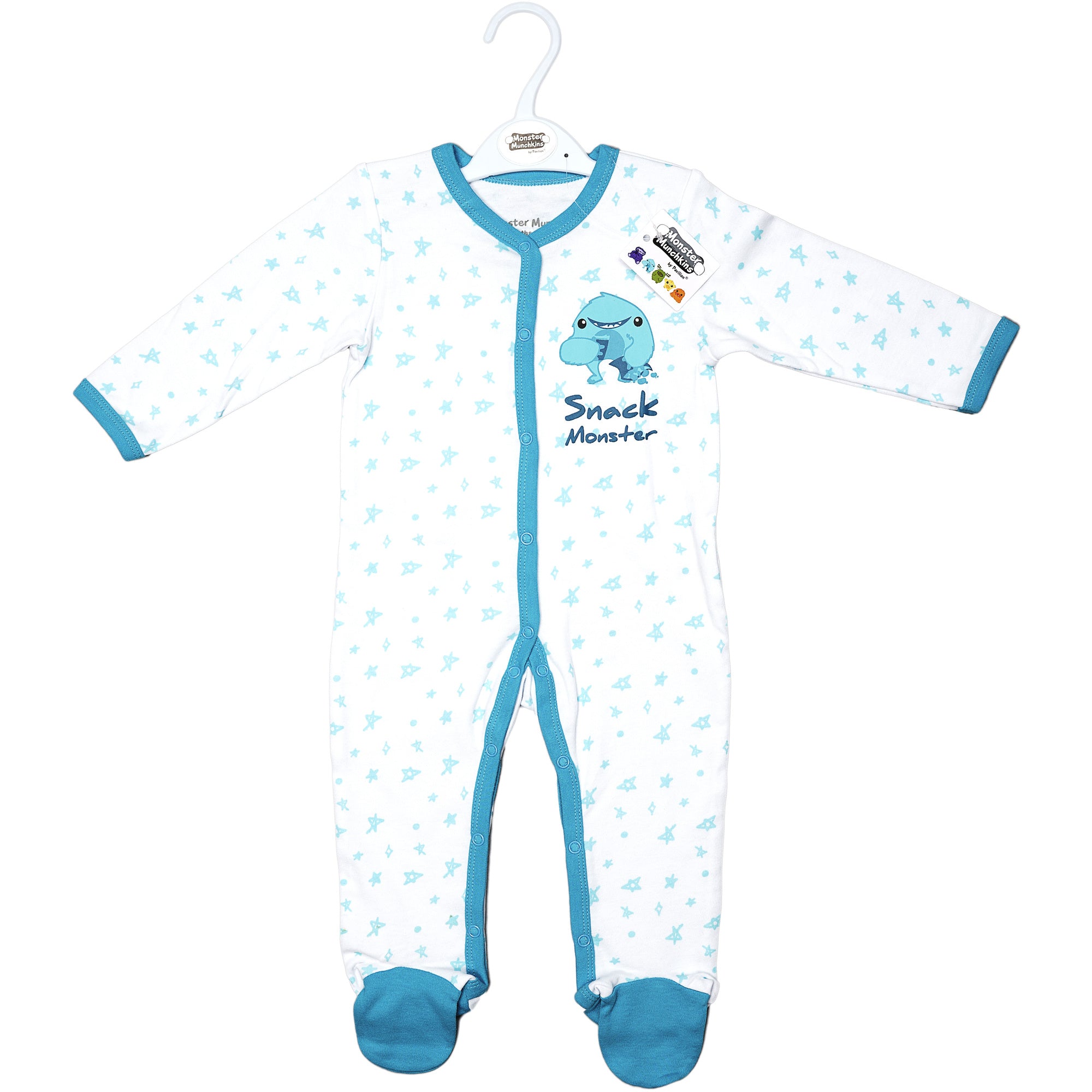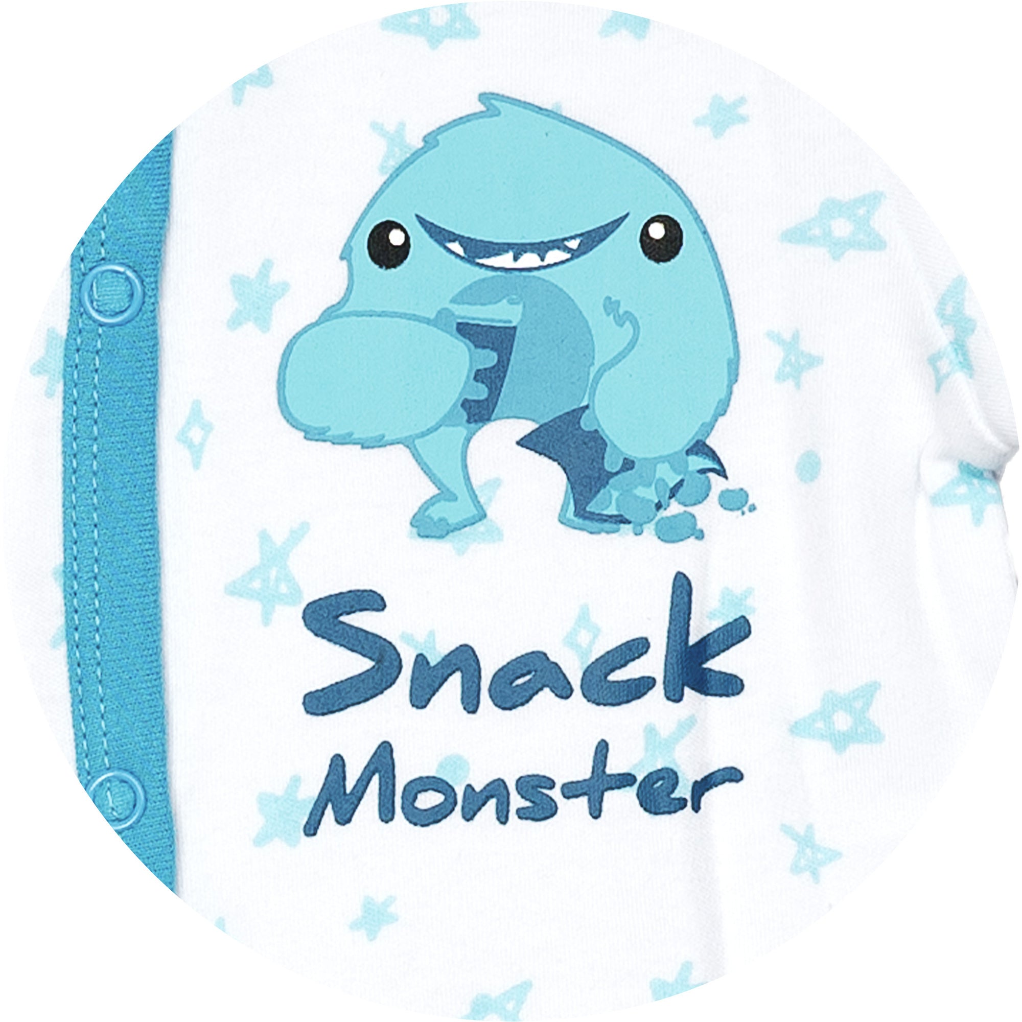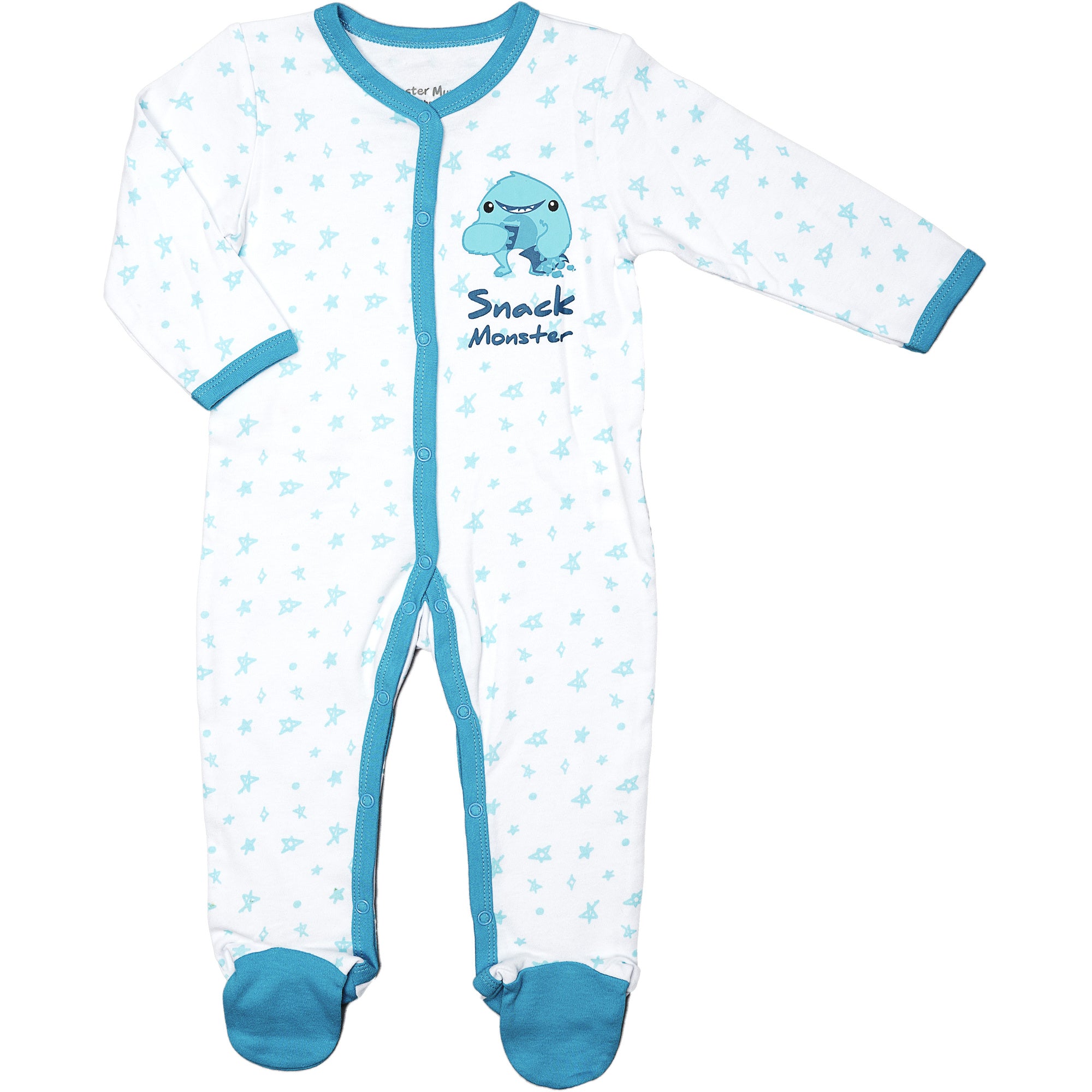 - IN-HOUSE DESIGN: Blue trimmed edges go around the neck, wrists, down the center, and the inside of the legs. Hand and feet covers are solid blue. The light blue messy hand-sketched star pattern covers the remainder of the exterior. The big fuzzy monster holds coffee and chips accompanied by "Snack Monster" screen-printed sentiment on the left chest area. Itch-free tagless sizing is printed on the interior collar.