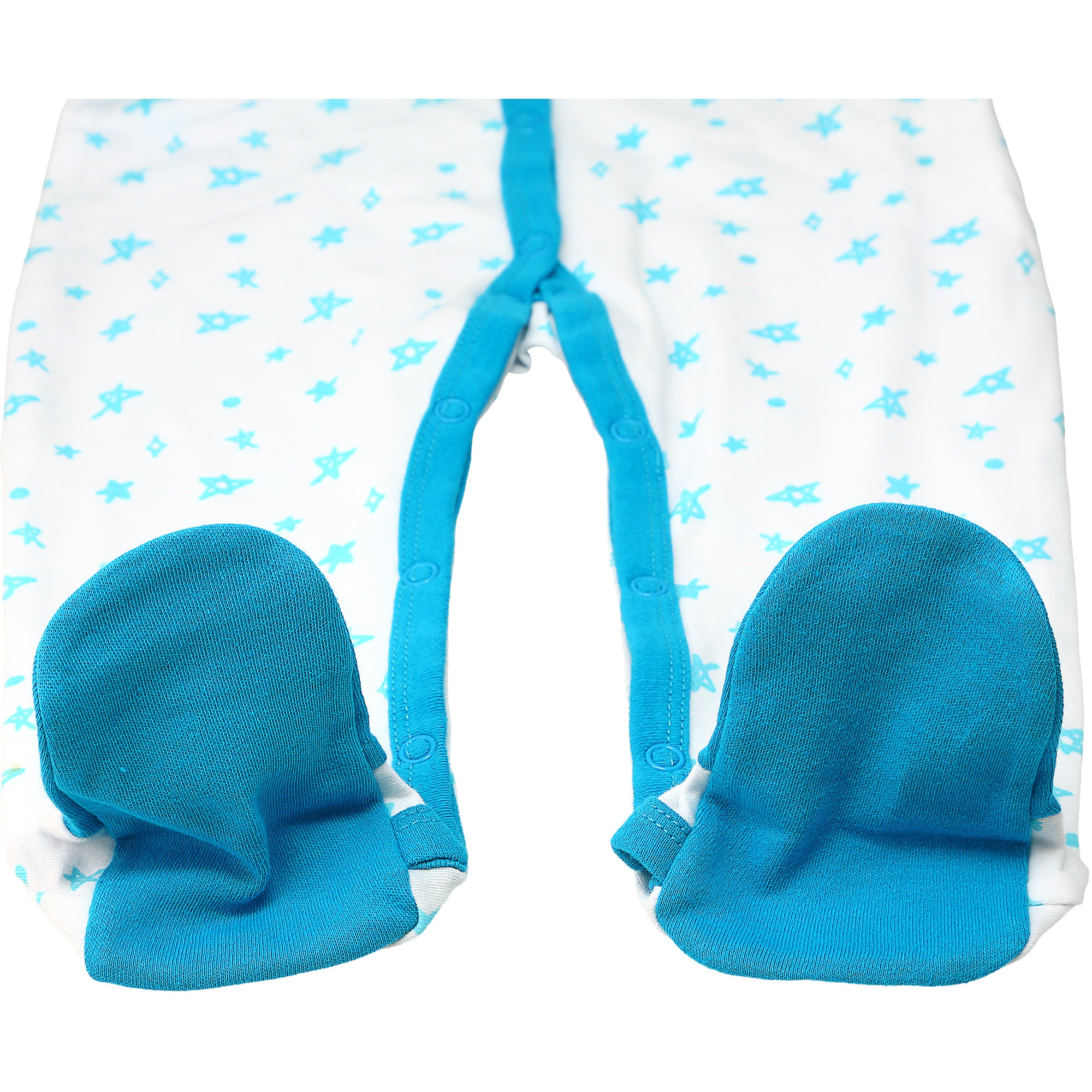 - PREMIUM QUALITY: 0-6 month, long-sleeved bodysuit sleeper is made from 100% cotton with close-toed built-in sock feet and fold-over hand mitts to protect your little one from scratching their face/eyes. 13 metal snap front closure. Also available in a 6-12 month size without the fold-over mitts. Packaged in a plastic polybag with hangtag and plastic hanger.