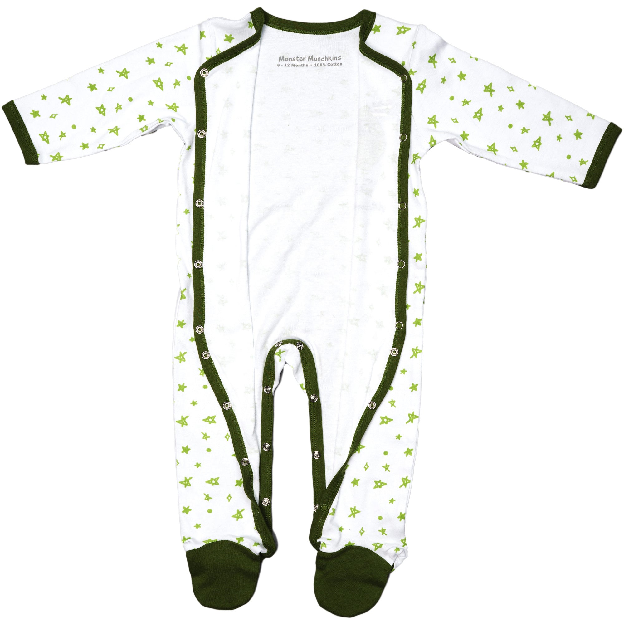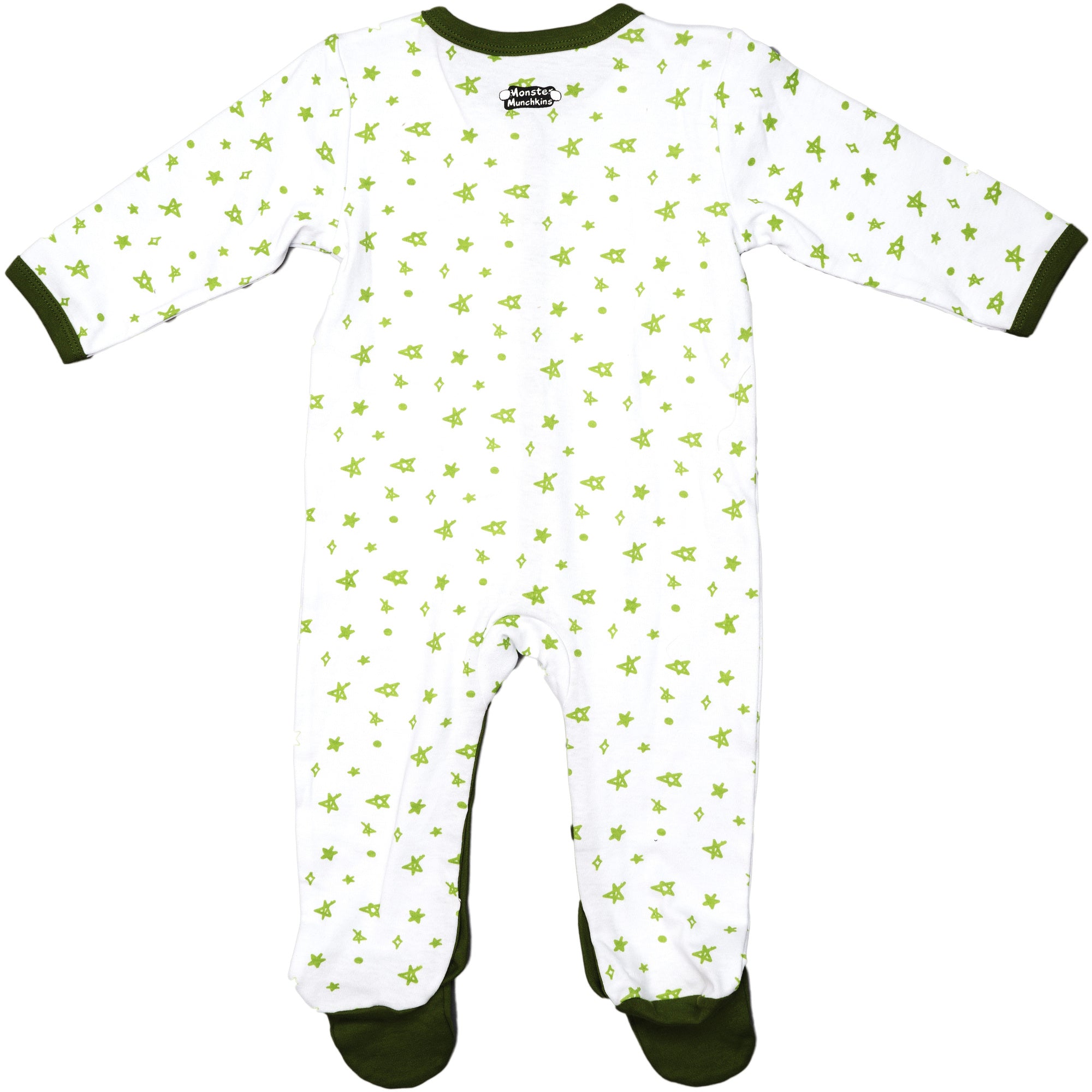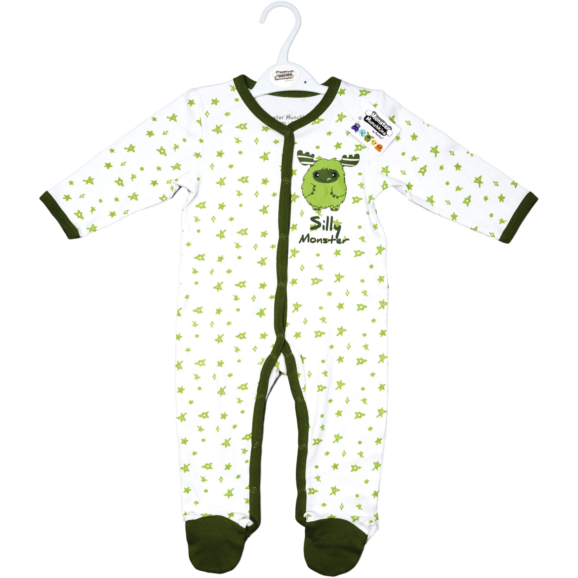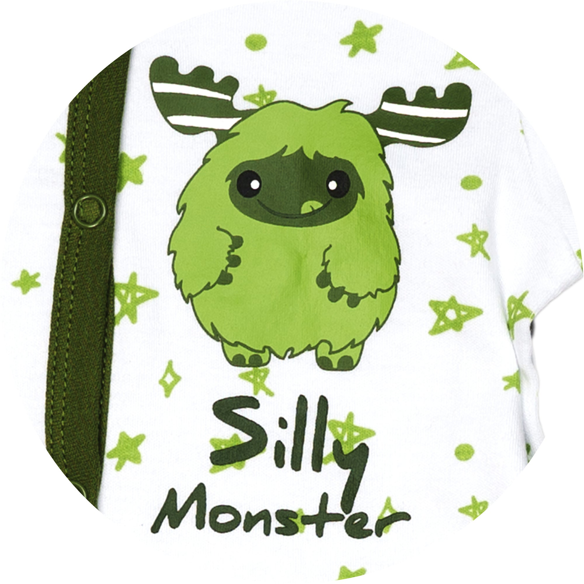 - IN-HOUSE DESIGN: Green trimmed edges go around the neck, wrists, down the center, and the inside of the legs. Hand and feet covers are solid green. The light green messy hand-sketched star pattern covers the remainder of the exterior. The big fuzzy moose antlered monster is sticking his tongue out and is accompanied by "Silly Monster" screen-printed sentiment on the left chest area. Itch-free tagless sizing is printed on the interior collar.