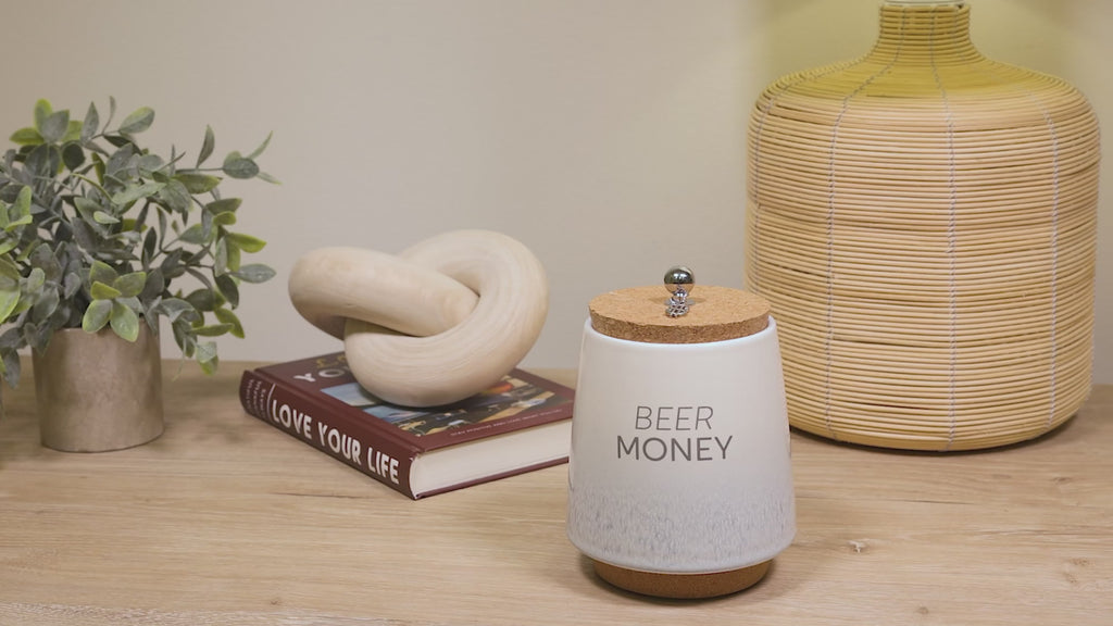 • IN-HOUSE DESIGN: The front side of the piggy bank has a simplistic "Beer Money" gray sentiment and an ombre glossy reactive dripped speckling glaze that fades from white at the top to gray at the bottom. The interior of the jar features fill lines accompanied by sentiments that are .75 inches from one another. The very bottom line "Not Enough Fund$" goes up to 1.5 inches from the base, followed by "Getting There," leading to "So Much Fund$" with "Fully Funded" at the top.