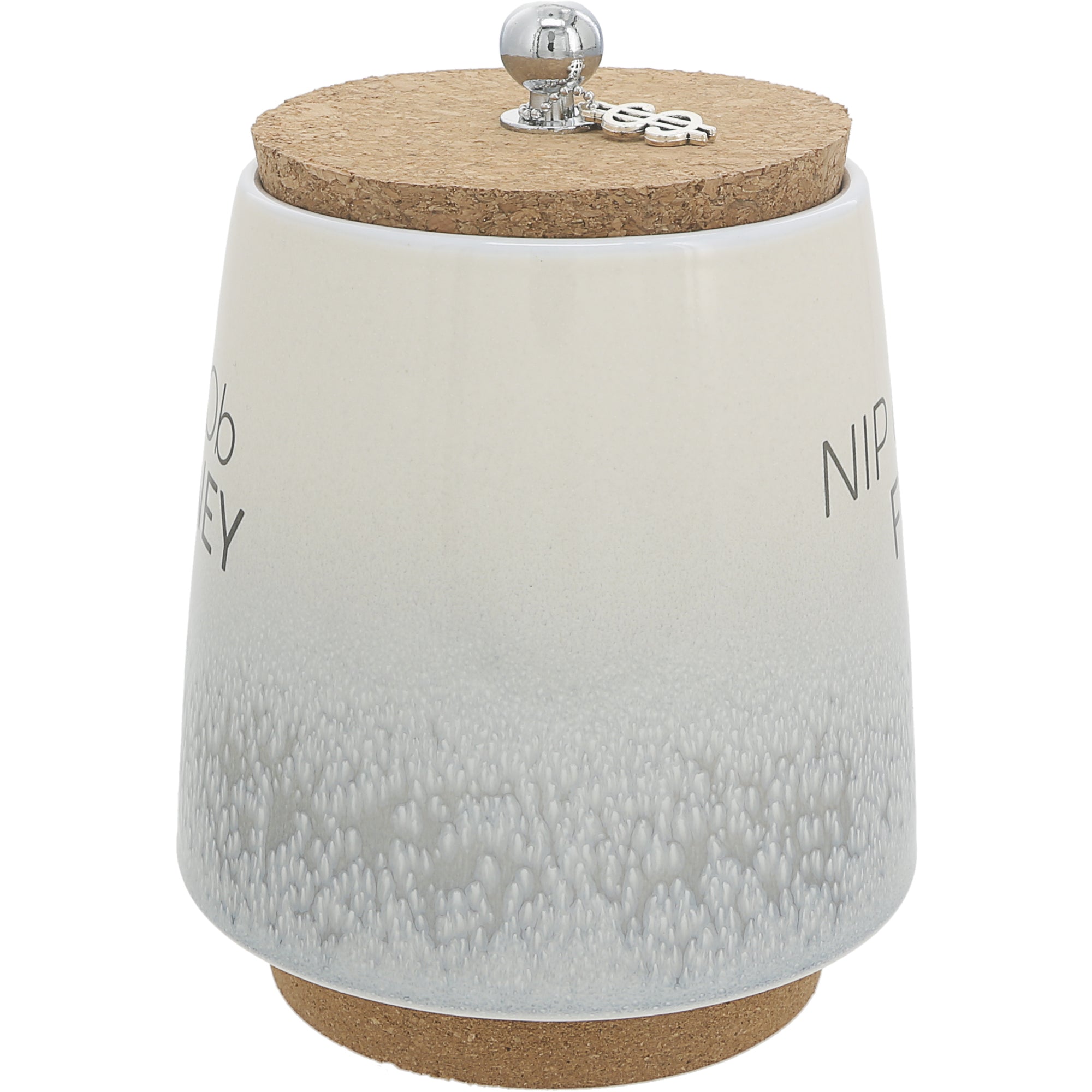 - PREMIUM QUALITY: This incredible money-holding jar is 6.5" tall. The base of the stoneware vessel is 4.5" wide, tapering to 3.5" wide towards the top, where the cork lid narrows from top to bottom to fit snuggly inside the lip of the container. A 1.75" length metal chain holds a removable $ icon keychain that can be added to your keys or left connected to the .5" wide x .75" tall rounded metal ball handle. The base is made from cork to prevent surfaces from scratching and provides an easier grip to pick up the canister.