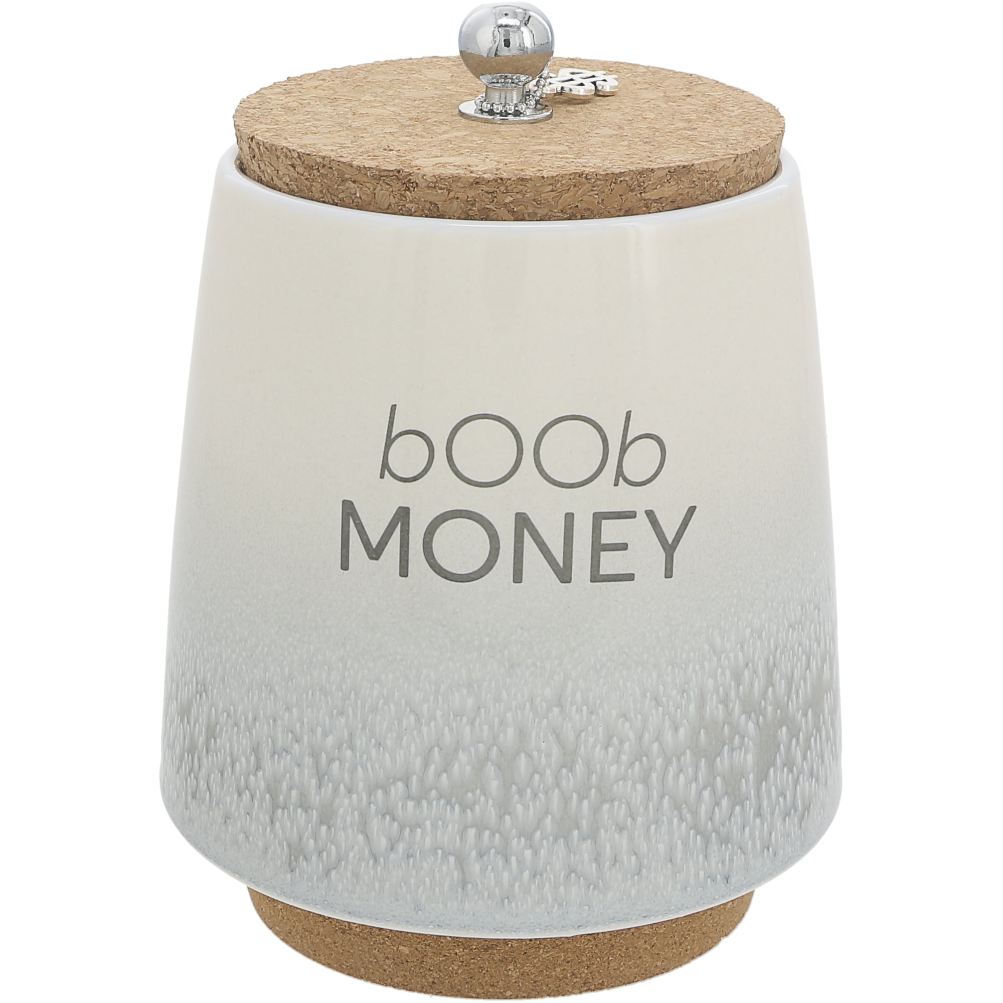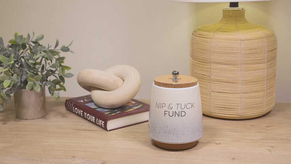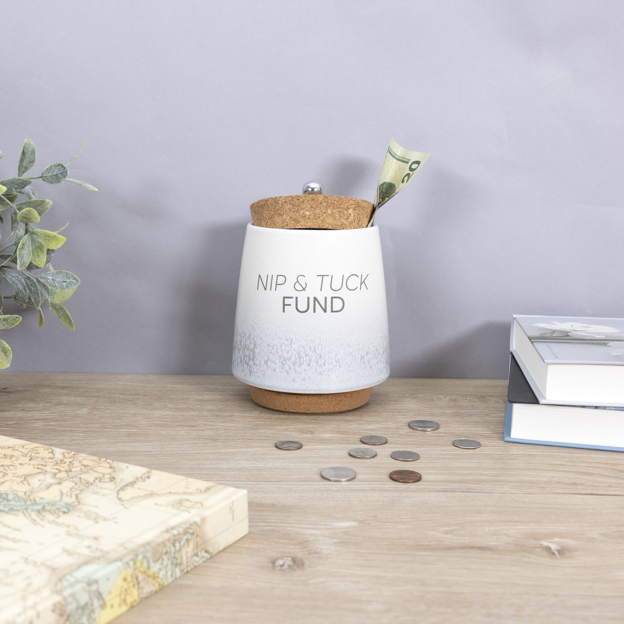 - IN-HOUSE DESIGN: The front side of the piggy bank has a simplistic "Nip & Tuck Fund/bOOb Money" gray sentiment and an ombre glossy reactive dripped speckling glaze that fades from white at the top to gray at the bottom. The interior of the jar features fill lines accompanied by sentiments that are .75 inches from one another. The very bottom line "Not Enough Fund$" goes up to 1.5 inches from the base, followed by "Getting There," leading to "So Much Fund$" with "Fully Funded" at the top.