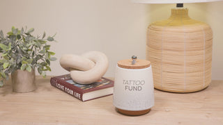 - IN-HOUSE DESIGN: The front side of the piggy bank has a simplistic "Tattoo Fund" gray sentiment and an ombre glossy reactive dripped speckling glaze that fades from white at the top to gray at the bottom. The interior of the jar features fill lines accompanied by sentiments that are .75 inches from one another. The very bottom line "Not Enough Fund$" goes up to 1.5 inches from the base, followed by "Getting There," leading to "So Much Fund$" with "Fully Funded" at the top.