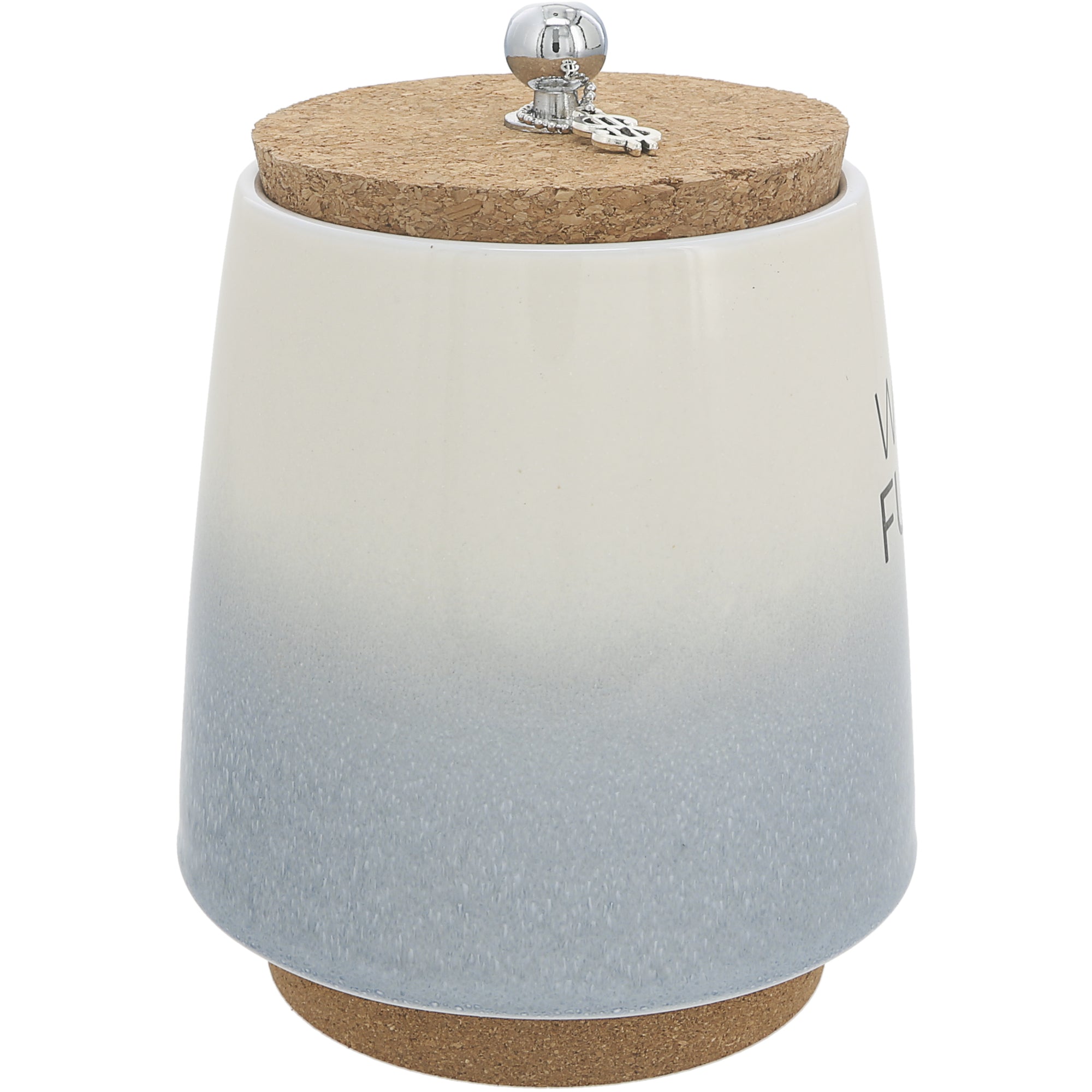 - PREMIUM QUALITY: This incredible money-holding jar is 6.5" tall. The base of the stoneware vessel is 4.5" wide, tapering to 3.5" wide towards the top, where the cork lid narrows from top to bottom to fit snuggly inside the lip of the container. A 1.75" length metal chain holds a removable $ icon keychain that can be added to your keys or left connected to the .5" wide x .75" tall rounded metal ball handle. The base is made from cork to prevent surfaces from scratching and provides an easier grip to pick up the canister.