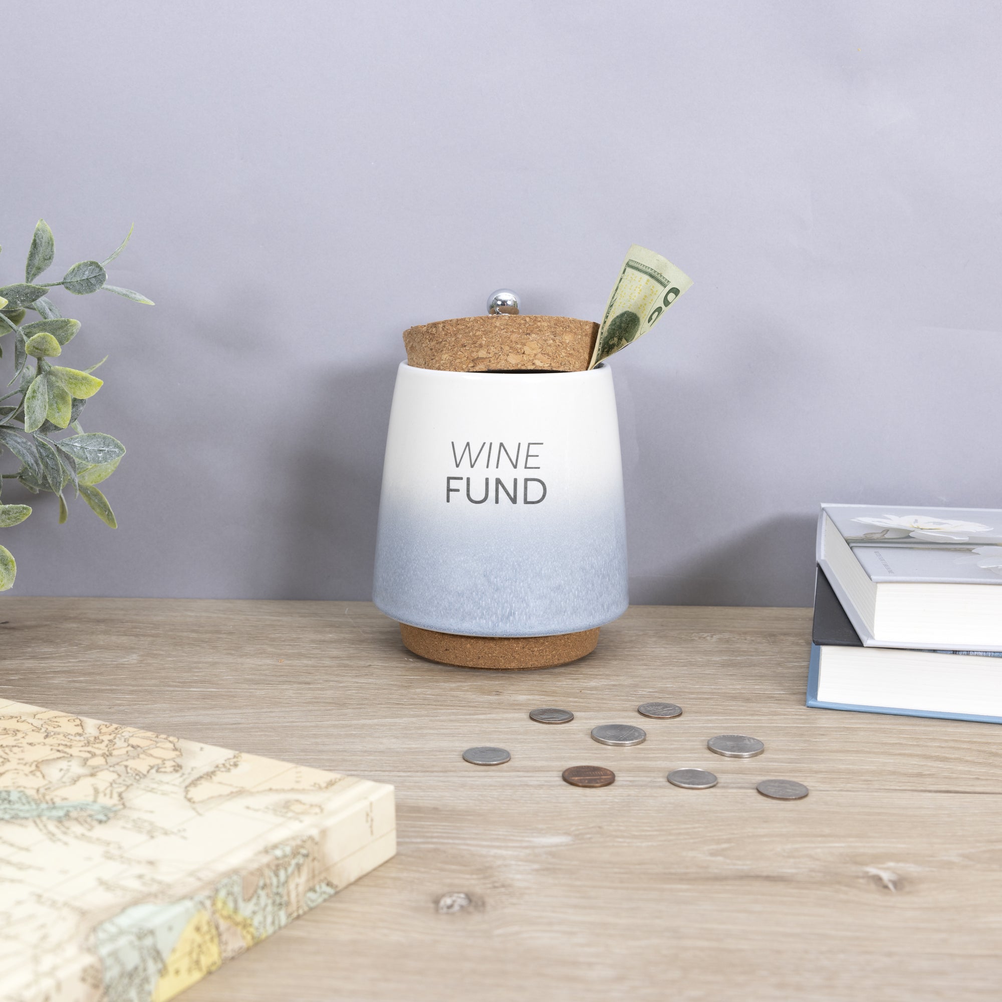 - IN-HOUSE DESIGN: The front side of the piggy bank has a simplistic "Wine Fund" gray sentiment and an ombre glossy reactive dripped speckling glaze that fades from white at the top to blue at the bottom. The interior of the jar features fill lines accompanied by sentiments that are .75 inches from one another. The very bottom line "Not Enough Fund$" goes up to 1.5 inches from the base, followed by "Getting There," leading to "So Much Fund$" with "Fully Funded" at the top.