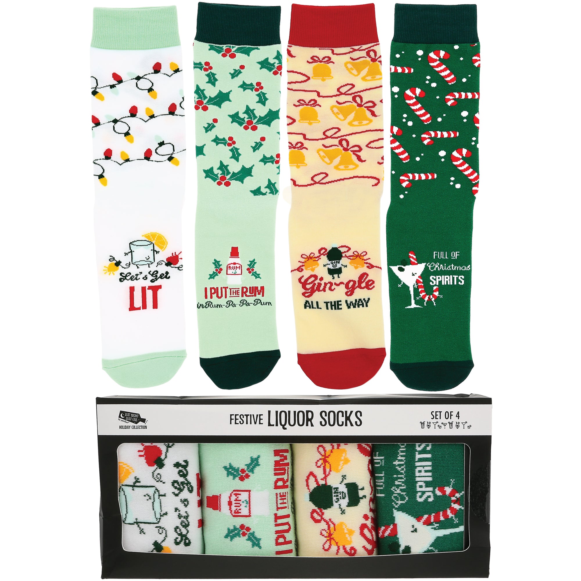 - IN-HOUSE DESIGN: The second pair is green, including a red mistletoe wrap-around design; the top of the socks has a smiling rum bottle and an "I Put The Rum in Rum-Pa-Pa-Pum" sentiment. The third pair is yellow & red, including a bell and ribbon wrap-around design; the top of the socks has a smiling gin bottle and a "Gin-gle All The Way" sentiment. The fourth pair is green with a wrap-around candy cane design; the top of the socks has a smiling martini glass with a "Full Of Christmas Spirits" sentiment.