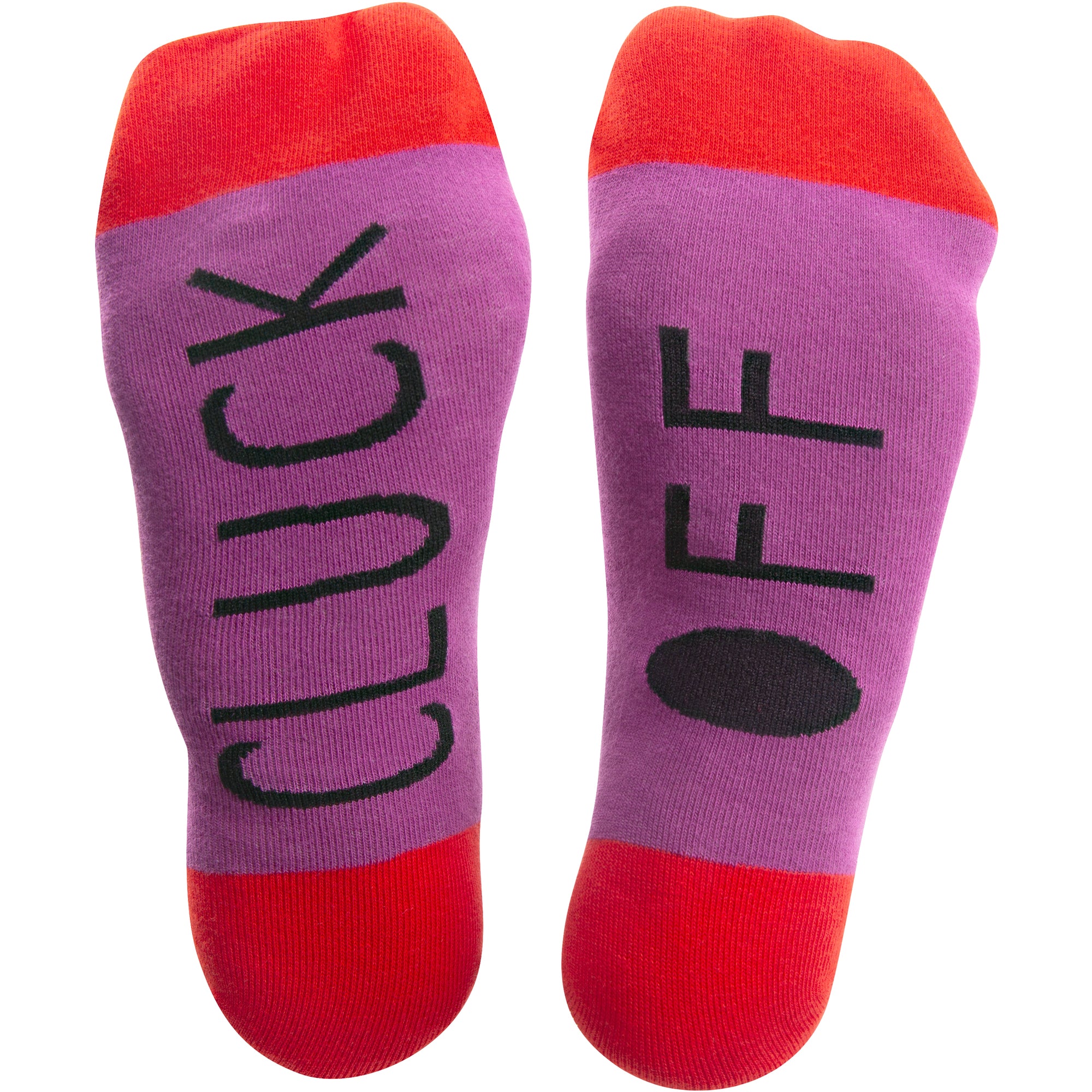 - IN-HOUSE DESIGN: "Cluck Off" text is sewn into the base of the socks and is accompanied by a chicken pattern with "WTF" text.