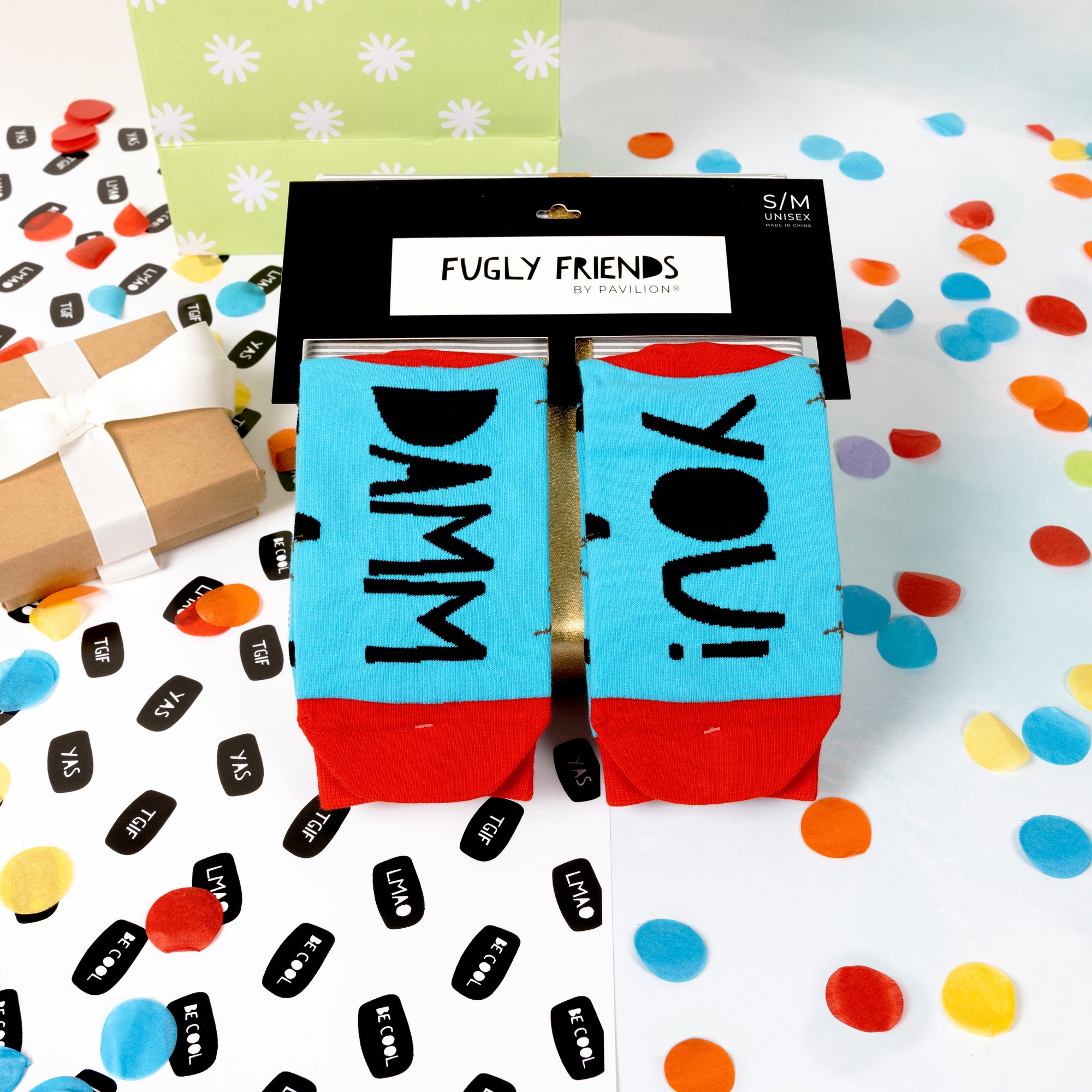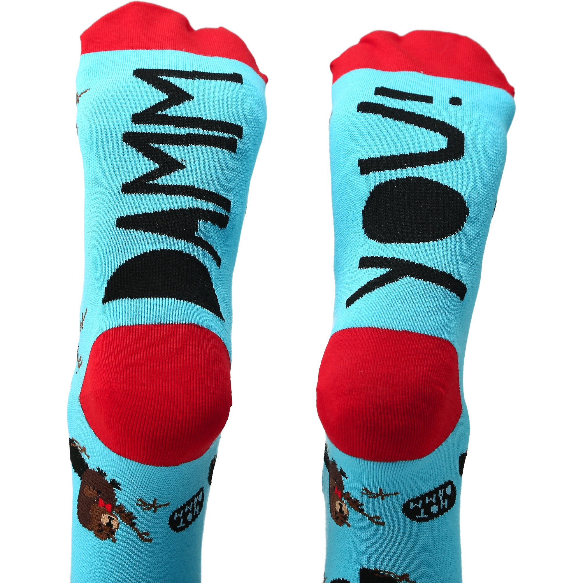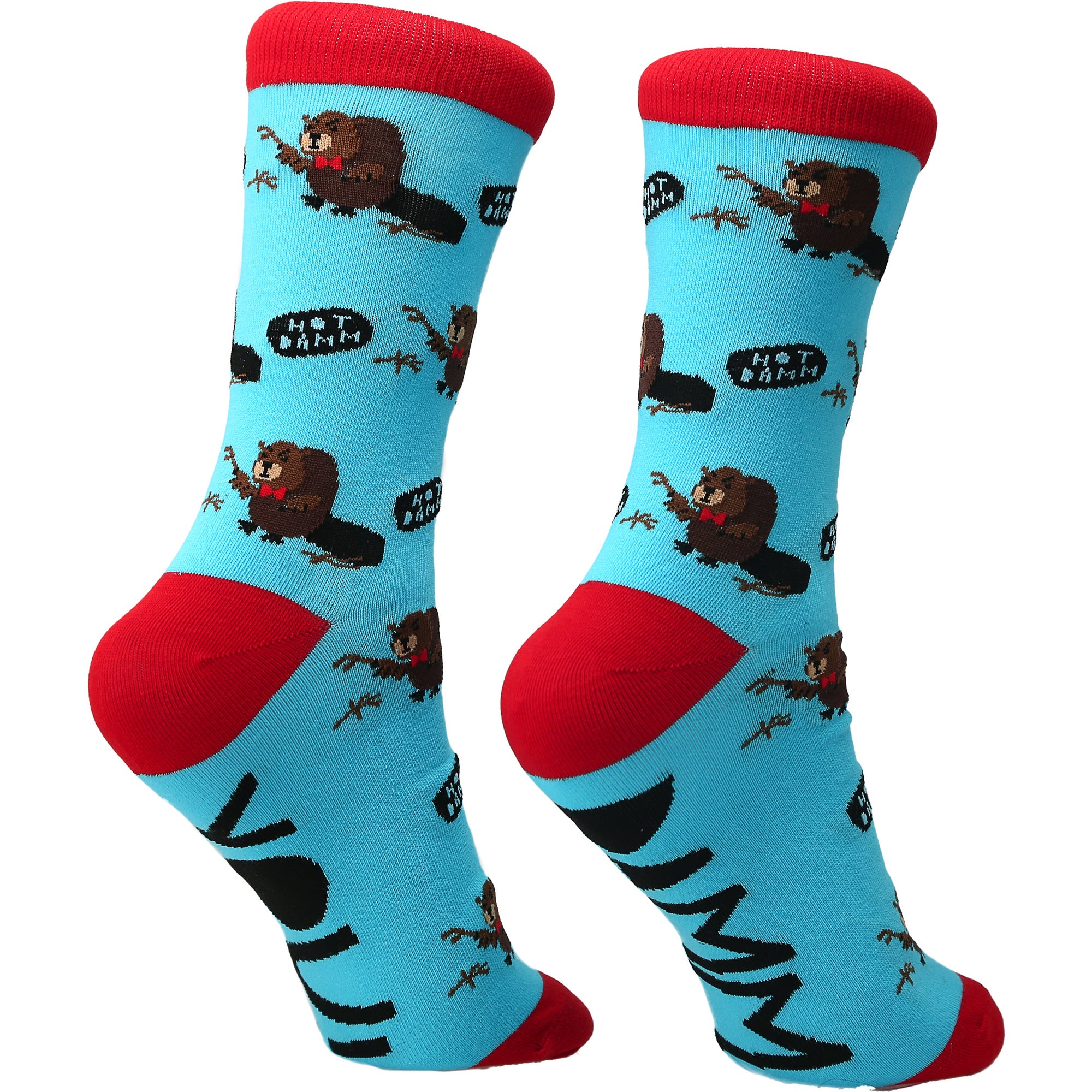 - IN-HOUSE DESIGN: Red ankle, heel, and toes are attached to an overall blue body. The angry beaver characters are wearing red bow ties and holding brown logs—repetitive black speech bubbles with "HOT DAMM" in blue font. One sock bottom has "DAMM" sentiment while the opposite sock has "YOU!" sentiment in black.