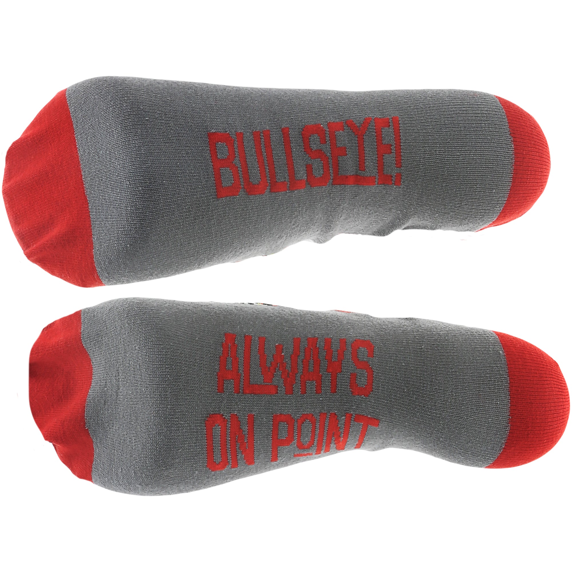 - IN-HOUSE DESIGN: The ankle, heel & toe are red, whereas the center portion is gray with happy and celebratory dancing black, white, green, yellow, and red darts/dartboards/stars neatly spread in a repetitive pattern surrounding the ankle and the top portion of the foot. The sole of each sock features a different sentiment, "BullsEye!" and "Always On Point" in an all-caps red sans serif font.