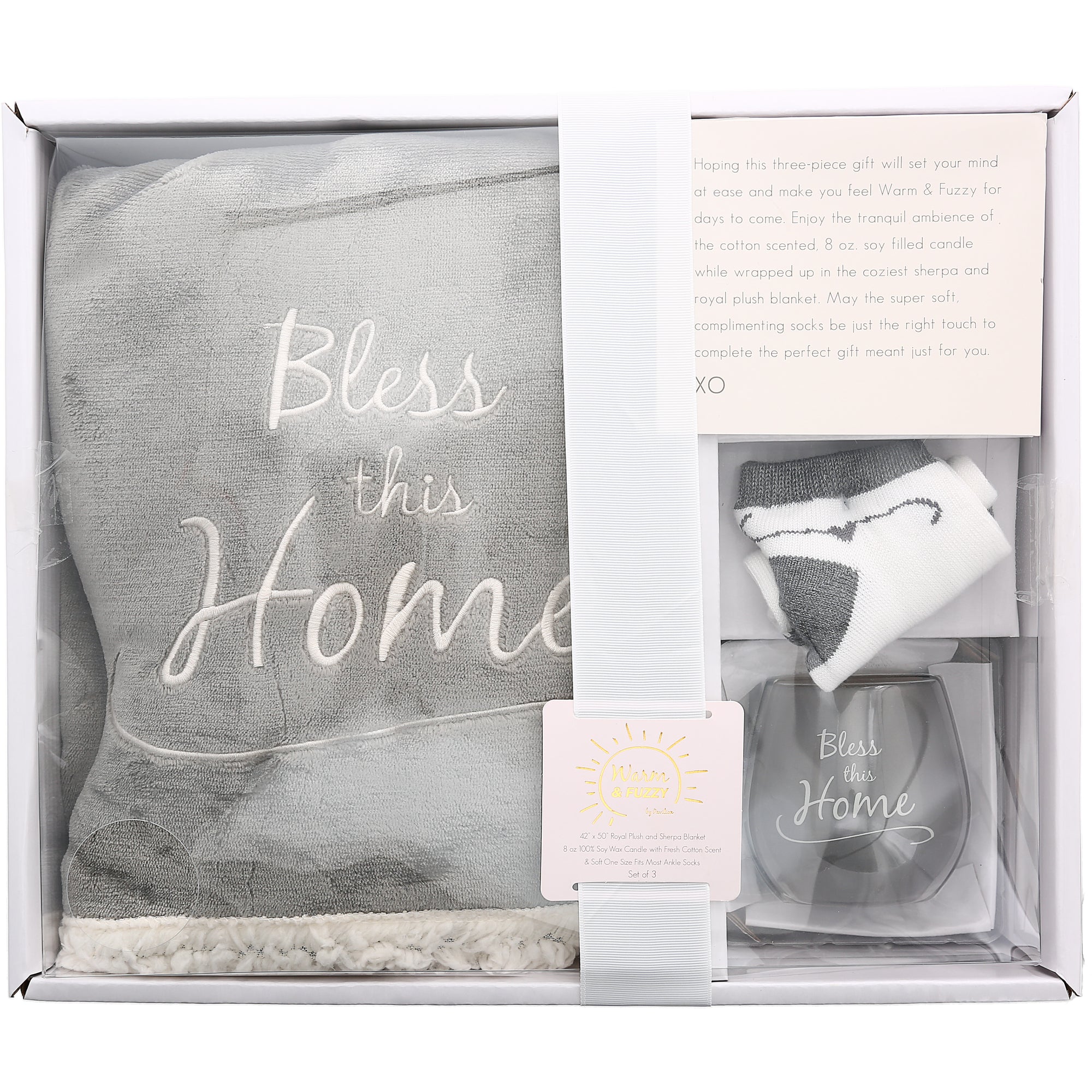 - IN-HOUSE DESIGN: The double-sided blanket has a debossed white embroidered "bless this home" sentiment matched by a scroll pattern on the gray plush side of the blanket. The aromatherapeutic candle has a white "bless this home" sentiment and scroll design. Socks have a gray ankle, heel, and toe accompanied by a heart and swirl design on a white sock base.
