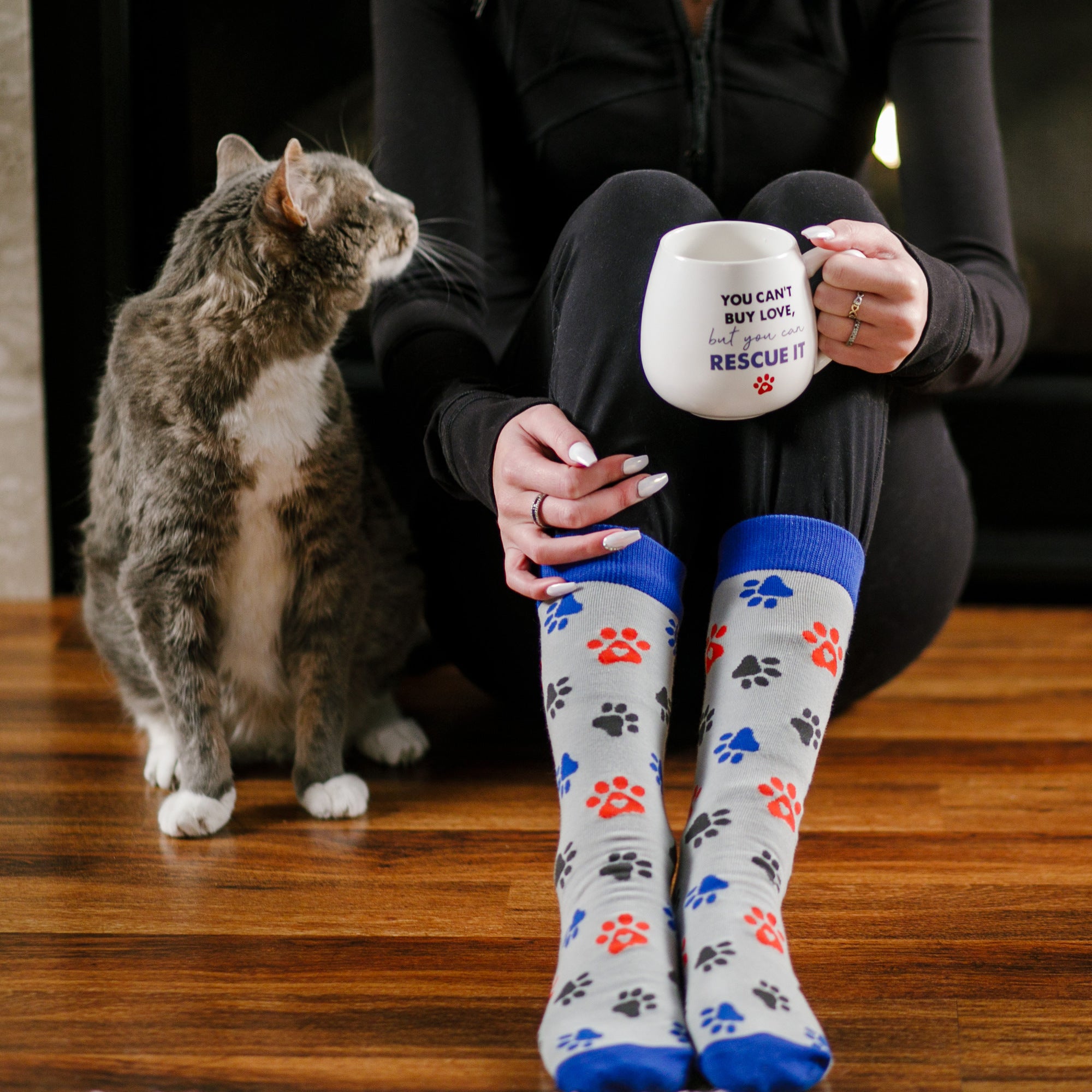 - IN-HOUSE DESIGN: Socks feature blue, red and black paw print pattern on a gray background. The heals, toes, and ankles are solid blue. The mug has blue and black "You Can't Buy Love, But You Can Rescue It" text and a red paw print with a heart center decal is printed onto one side of the mug.