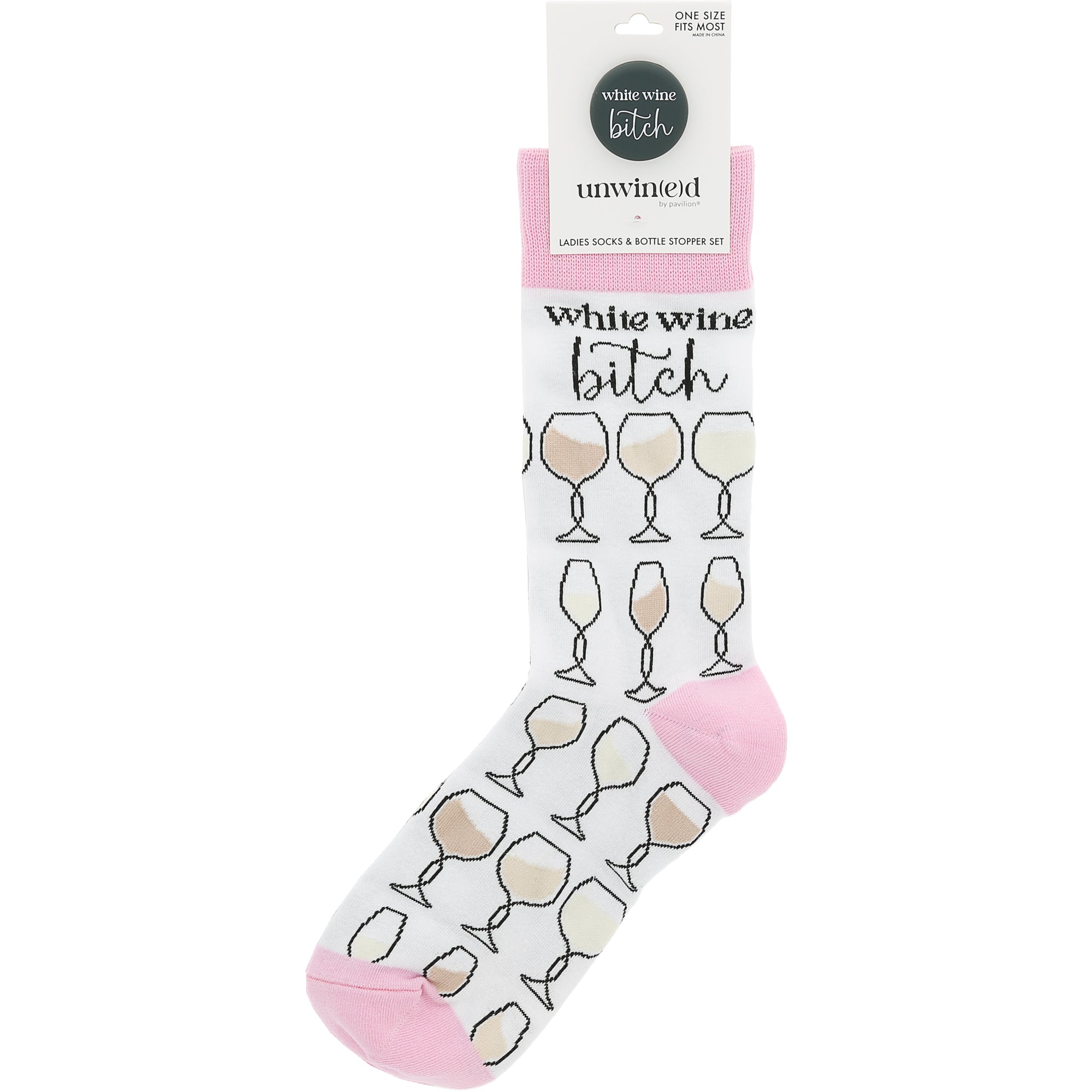 - IN-HOUSE DESIGN: With an all-over design featuring delicate white wine glasses, these socks are both fun and stylish. The sentiment "White Wine Bitch" adds a cheeky touch, while the light pink accents on the heel, toe, and cuff bring out the design’s playful vibe. The detailed artwork and thoughtful color scheme make these socks a great match for any wine enthusiast’s wardrobe.