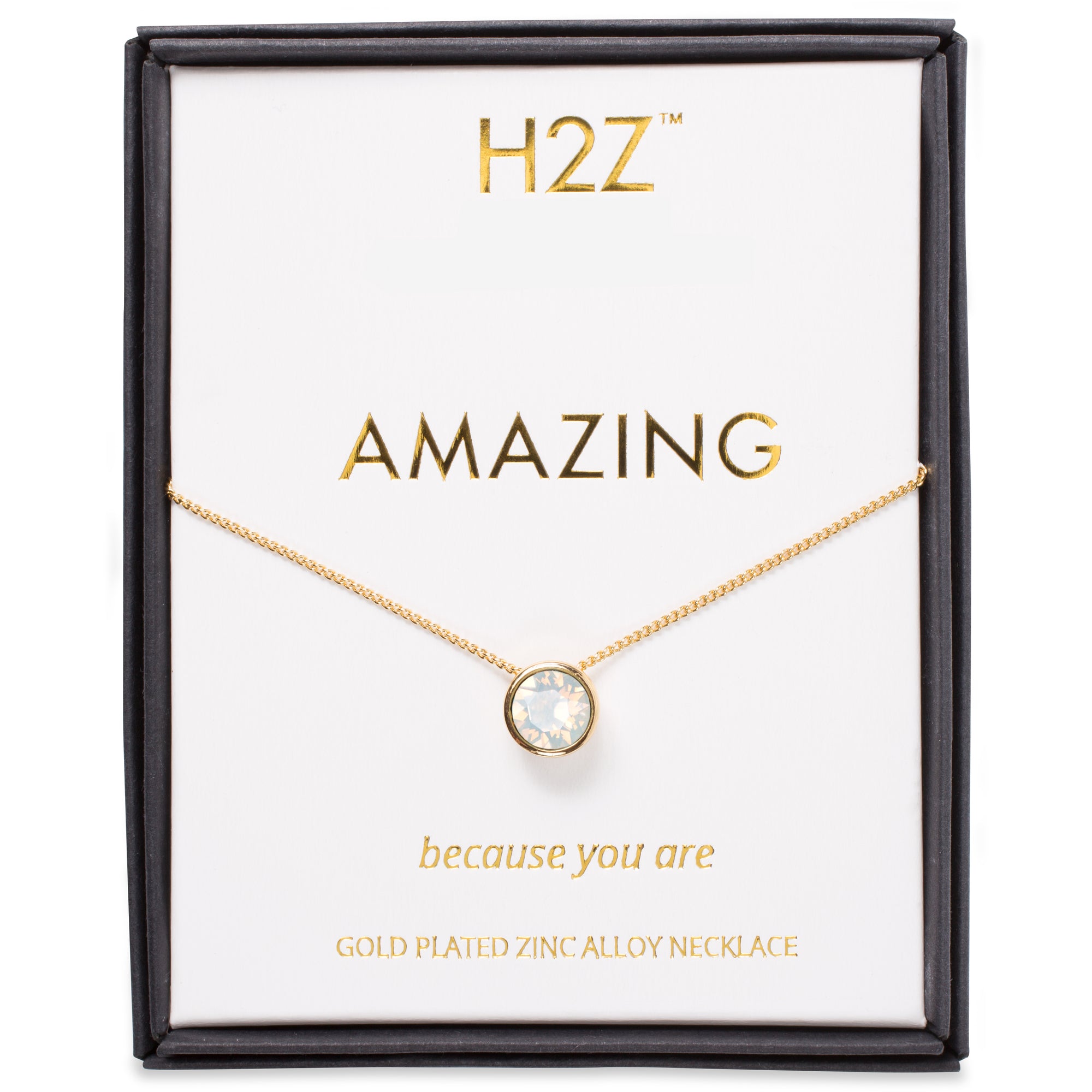 - IN-HOUSE DESIGN: Necklace contains one light gray opal crystal. "Amazing; Because You Are" text is printed onto the interior of the box.