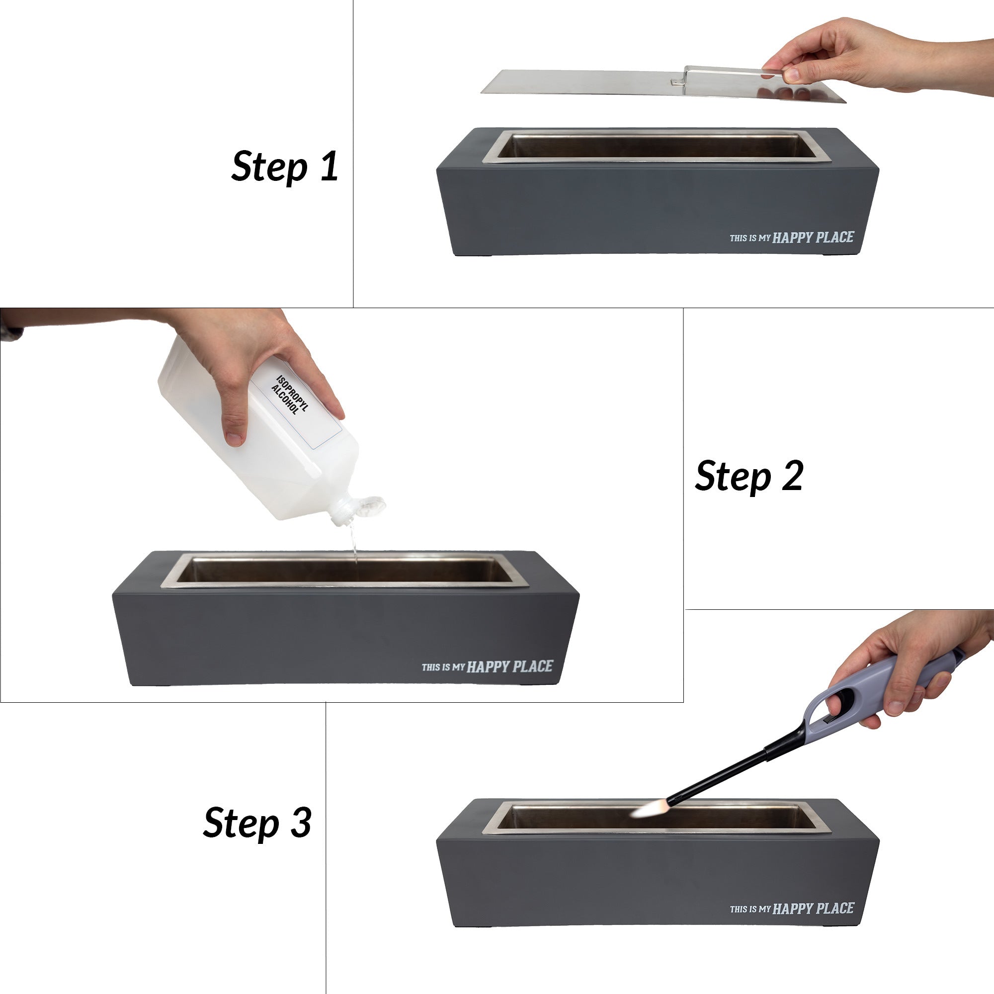 - CARE INSTRUCTIONS: Always read the entire manual before using. Never leave the pit unattended. Please keep the product away from flammable objects and keep the pit in a well-ventilated room when using it indoors. Keep out of reach of children and pets. Don't overfill with fuel ignitor - only soak a little above the cotton pad. Always use a long lighter. Only use with 95% rubbing alcohol, bioethanol, or isopropyl alcohol; not included.