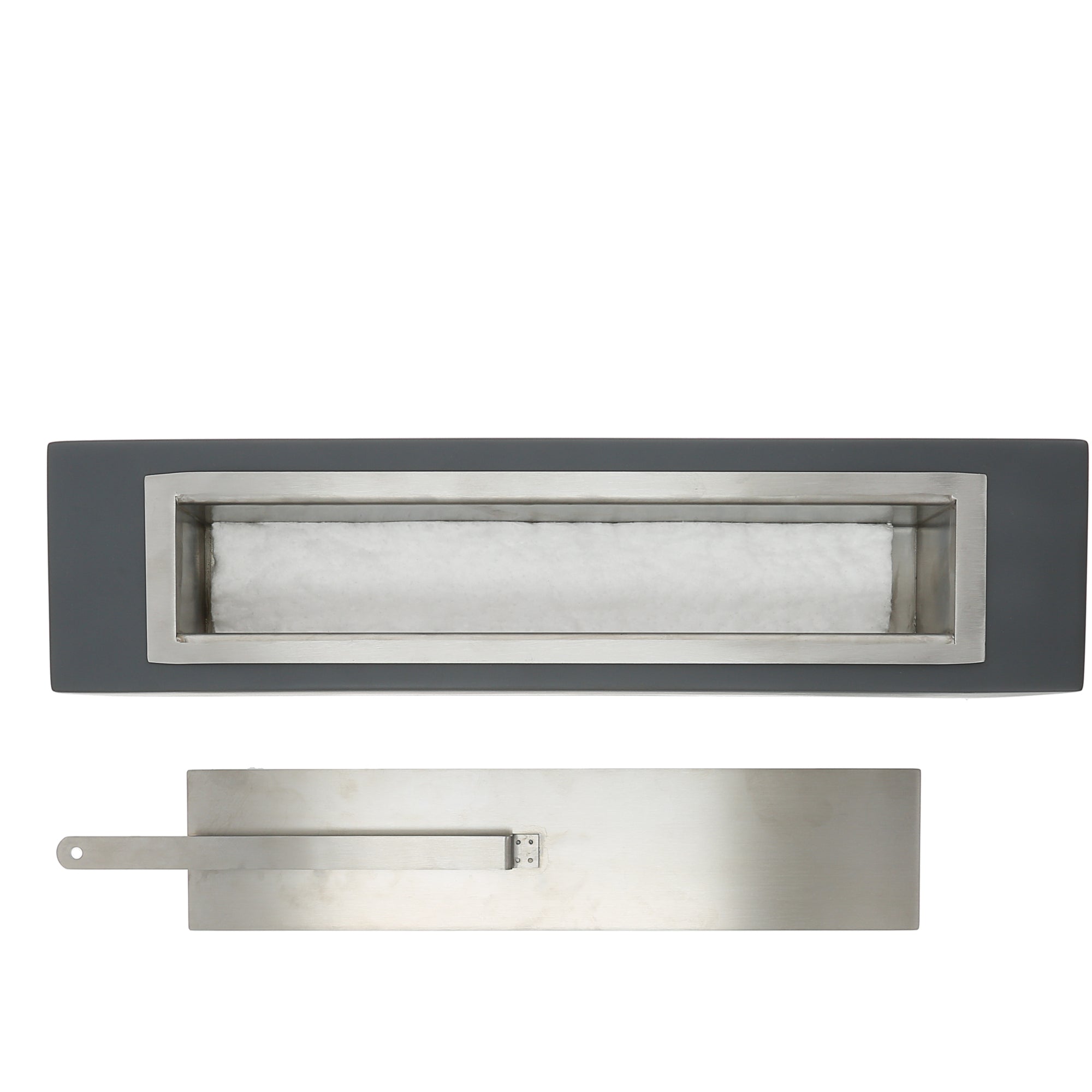 - PREMIUM QUALITY: This 15.75" long x 3.75" tall and wide tabletop firepit is made from concrete with four 1.5" L-shaped black foam pads on each of the bottom corners, protect tabletop surfaces from being scratched. The top center has 3.25" deep, 12.5" long, and 2.5" wide hole for housing the 11.75" x 2" wide x 3" deep stainless steel burn chamber. The .5" lip helps the pit sit inside the hole. The 12.75" x 3" wide stuffer has an 8.5" long x .75" wide handle. A single re-usable 11.25" long x 2" wide wool pad is included - be sure to replace the padding periodically. Continuous burn times vary between 30 to 60 minutes.