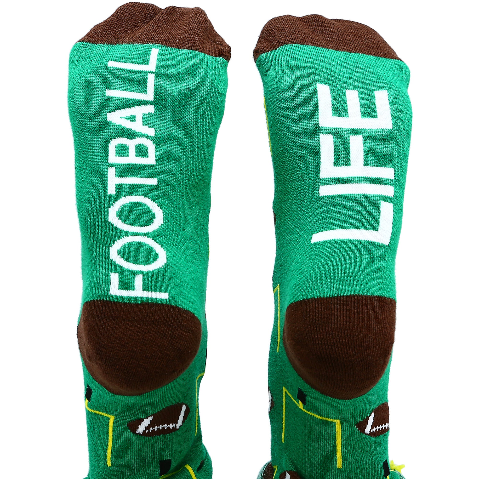 - IN-HOUSE DESIGN: "Football Life" text is sewn into the base of the socks while a football and field goal post pattern covers the rest.