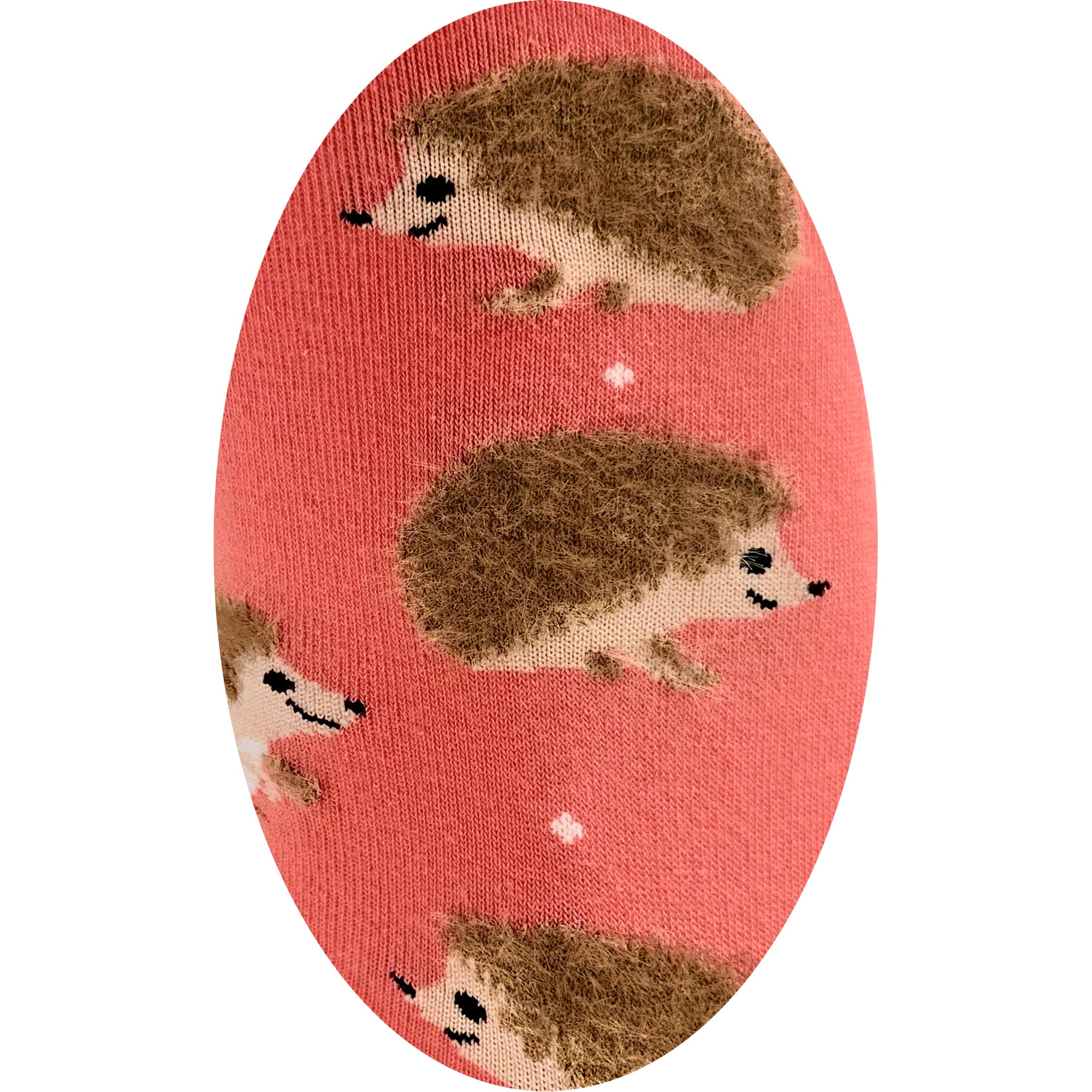- IN-HOUSE DESIGN: These pastel coral-pink socks are dotted with irresistibly cute illustrated hedgehogs, each in a slightly different pose—some curled up, others waddling around. Set against a soft pink background, the cozy blue toe and heel add contrast and enhance the overall playfulness of the design, making these socks both adorable and eye-catching.