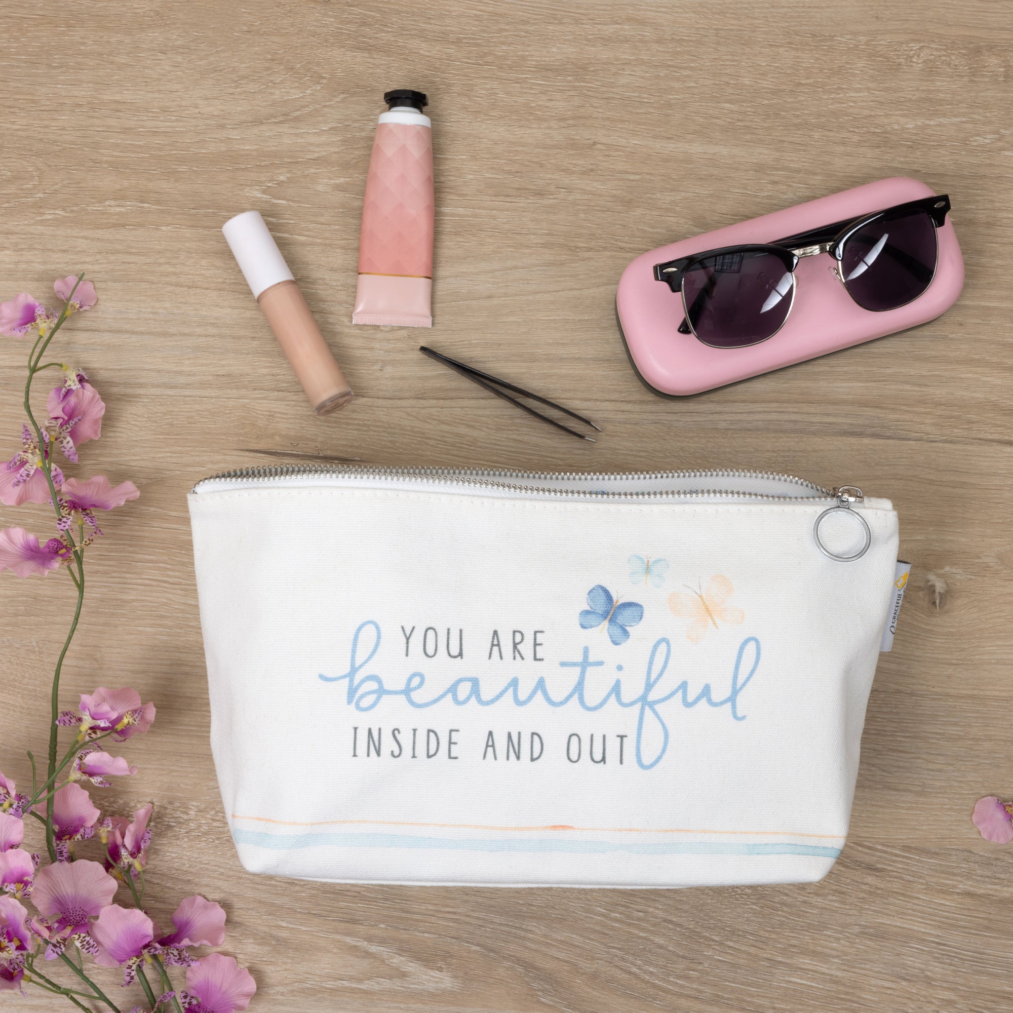 - IN-HOUSE DESIGN: Featuring the inspiring message "You Are Beautiful Inside and Out" in a gentle blue script, this pouch is adorned with delicate butterfly accents, adding a whimsical and positive touch. The interior lining showcases a matching butterfly pattern that enhances the overall design, creating a cohesive look that’s both stylish and uplifting. This thoughtful design makes it a unique accessory for everyday use.