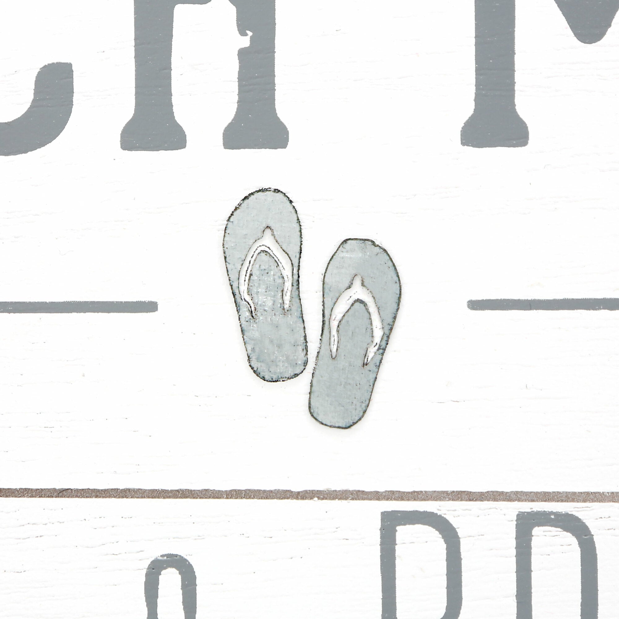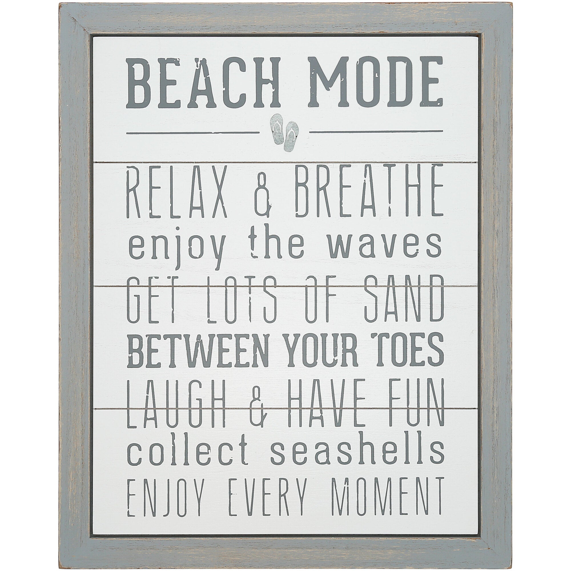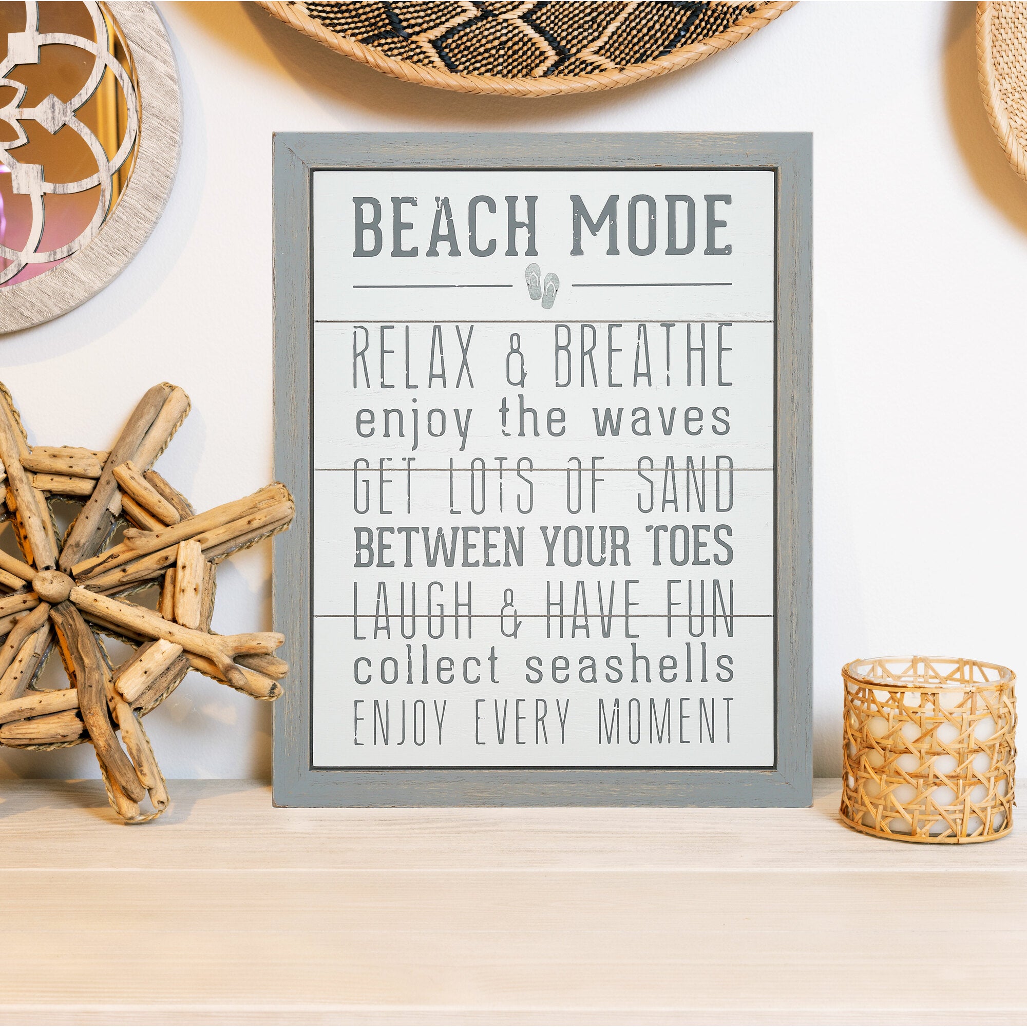 • IN-HOUSE DESIGN: The outer edges of the plaque are a gray whitewashed wood veneer. An inner layer shiplap-like pattern is white with a galvanized metal flip-flops icon. "Beach Mode" & "Relax & Breath Enjoy The Waves Get Lots Of Sand Between Your Toes Laugh & Have Fun Collect Seashells Enjoy Every Moment" sentiment has a rustic look in serif gray font.