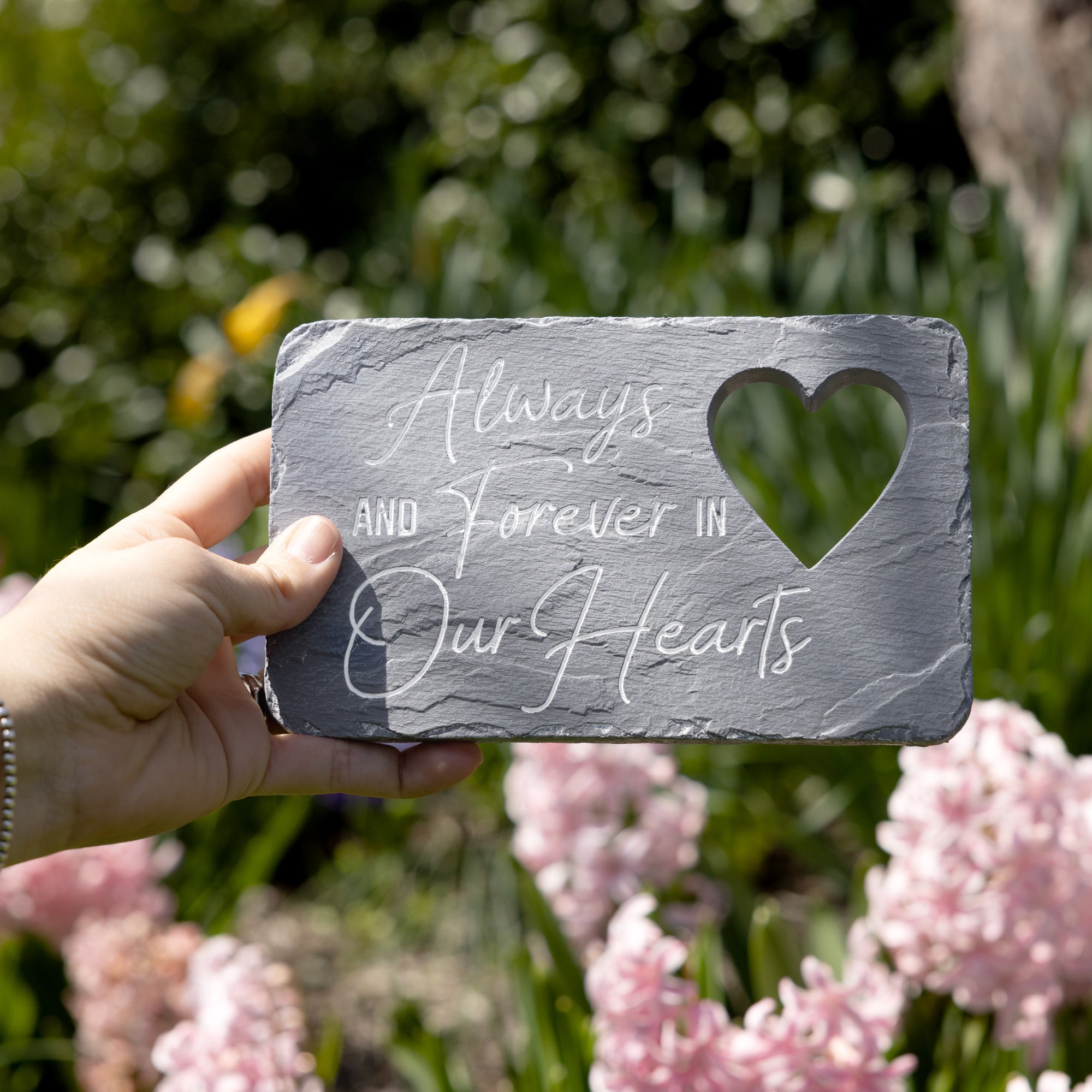 - IN-HOUSE DESIGN: This gray garden stone has a textured surface and rounded edges. It features a cut-out heart and the sentiment "Always And Forever In Our Hearts." This charming stone adds a touch of warmth and love to any outdoor or indoor space, serving as a meaningful reminder of the welcoming atmosphere within your home.