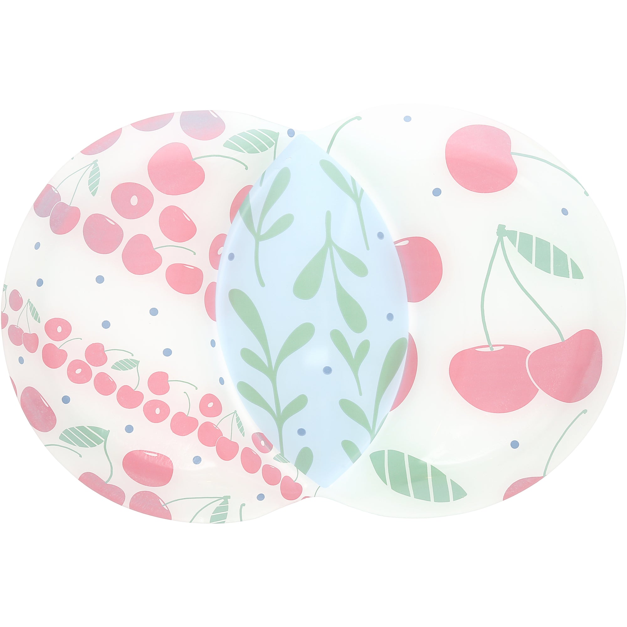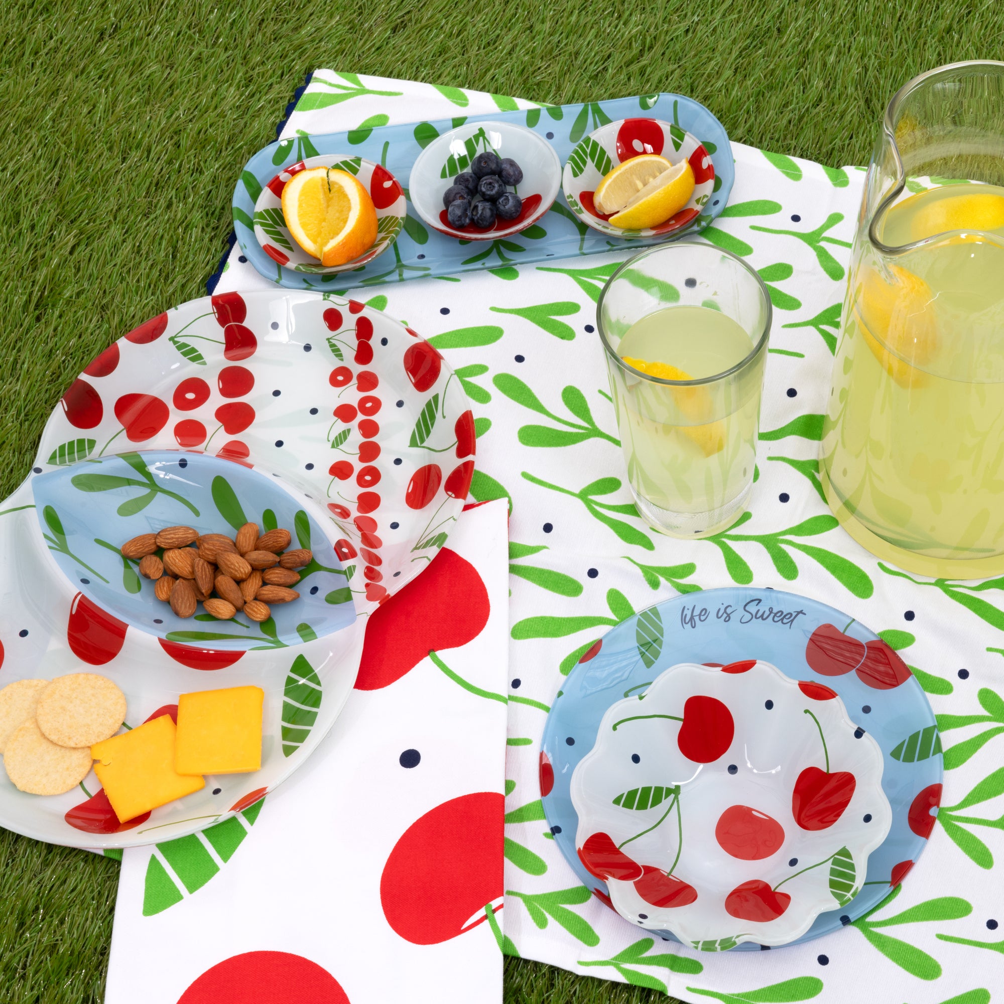 - IN-HOUSE DESIGN: The left section has some large cherries and blue polka dots above and below on a white background. The center section has a blue background with greenery leaves and blue polka dots. The right section has a combination of greenery, polka dots, and small/medium-sized cherries on a white background.