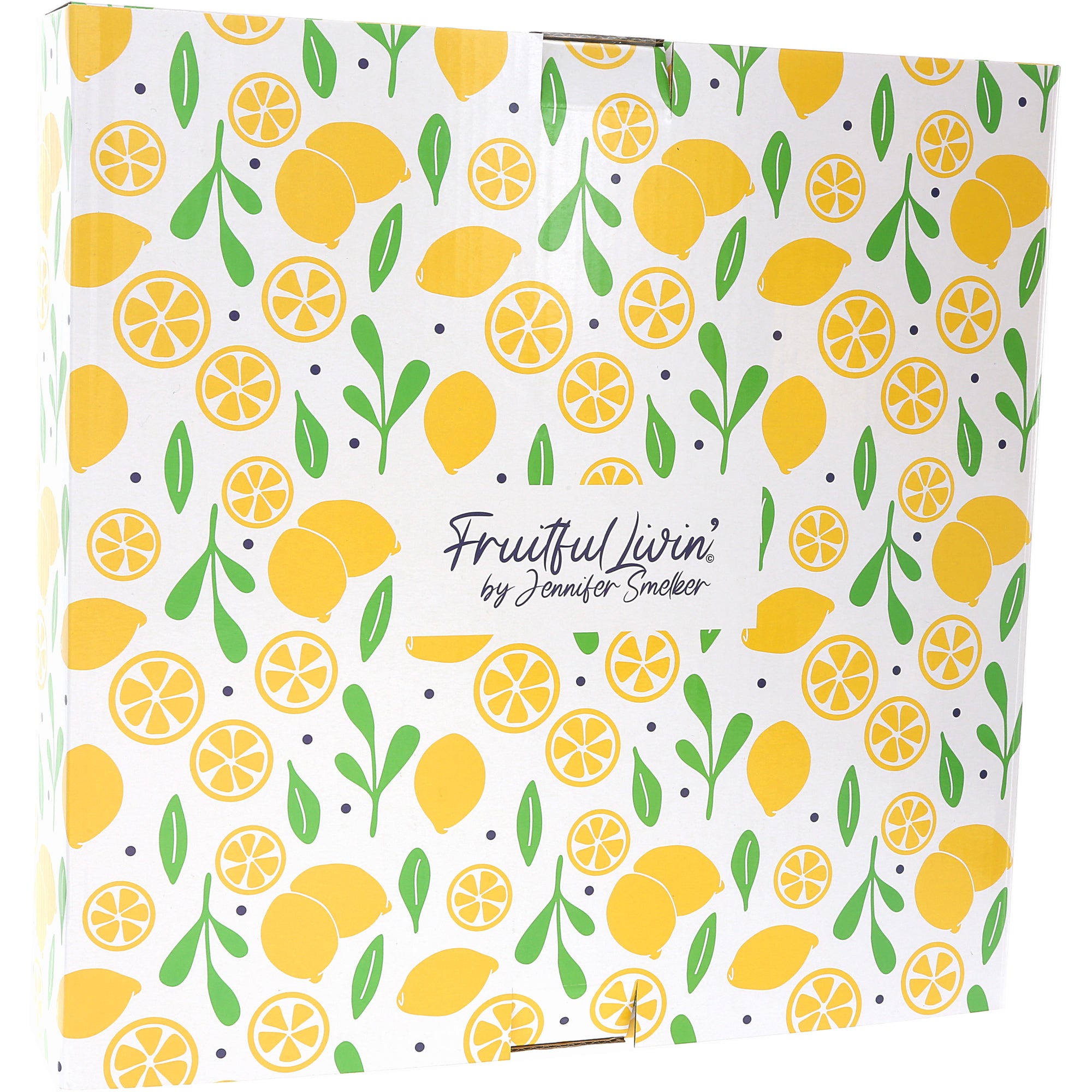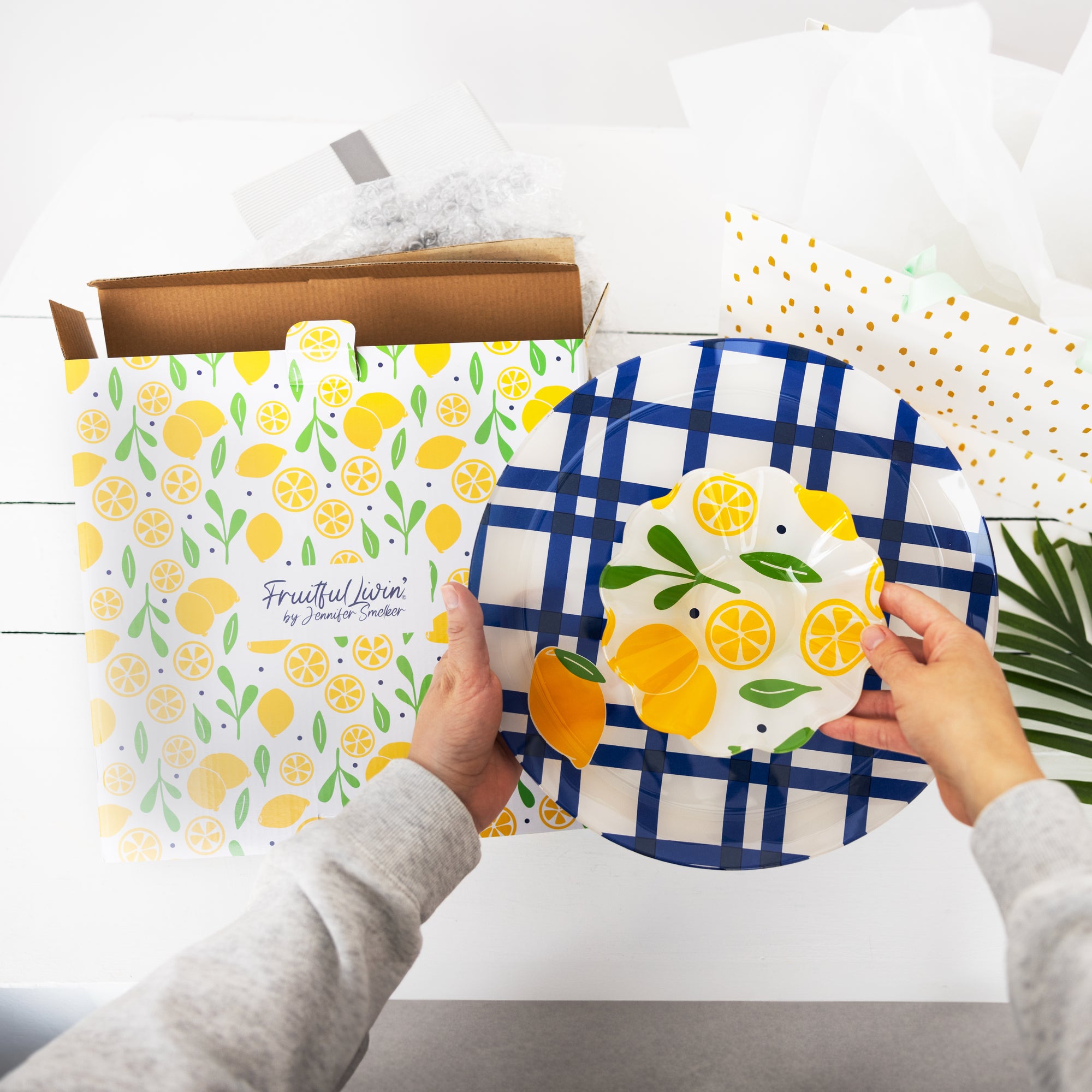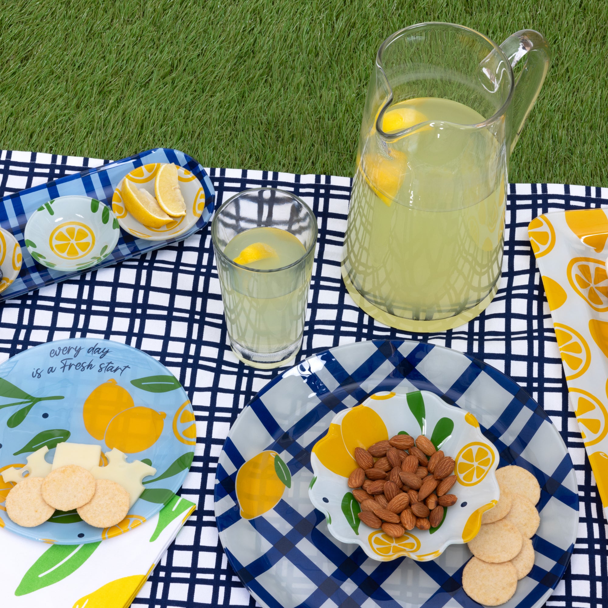 - IN-HOUSE DESIGN: The 6" bowl has large bold whole and halved lemons are accompanied by greenery and blue polka dots on a white background. The tray has a white background with blue plaid and a whole lemon.