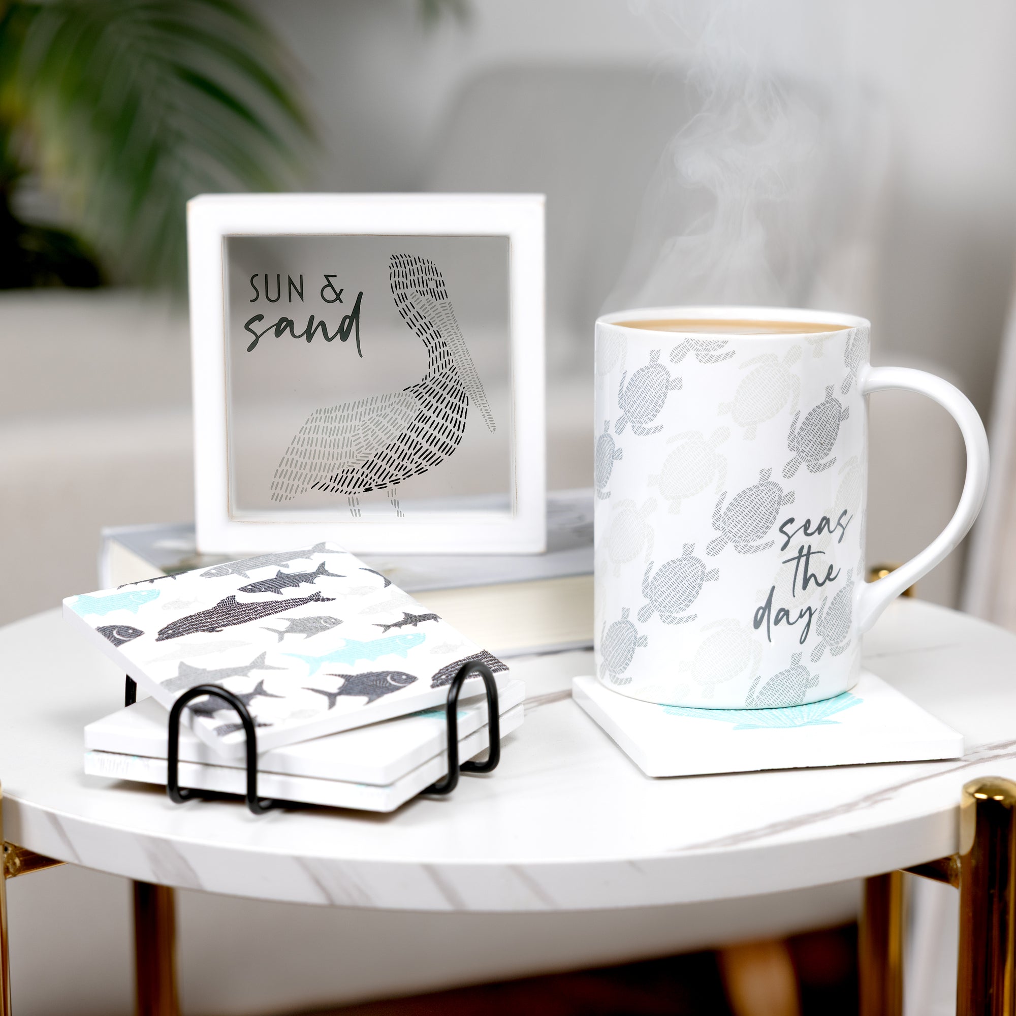 - IN-HOUSE DESIGN: Featuring an artistic sea turtle pattern in gentle gray tones, this mug offers a coastal charm perfect for beach lovers. The uplifting "Seas The Day" message encourages positivity, making each sip an inspiring moment.