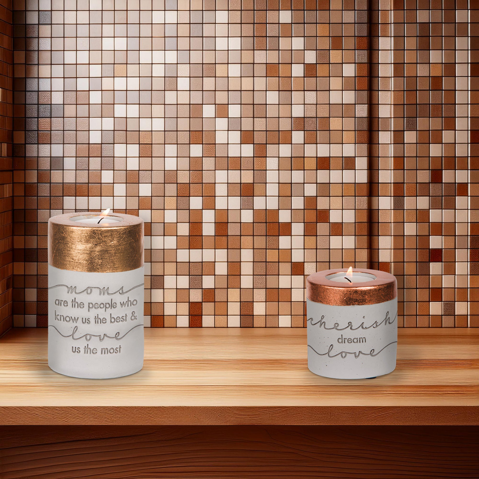 - PREMIUM QUALITY: This 4.75-inch candle holder is expertly crafted from durable cement and adorned with an elegant copper foil top. It comes securely packaged in a printed open-faced box and includes one regular tealight, making it ready for immediate use or gifting.