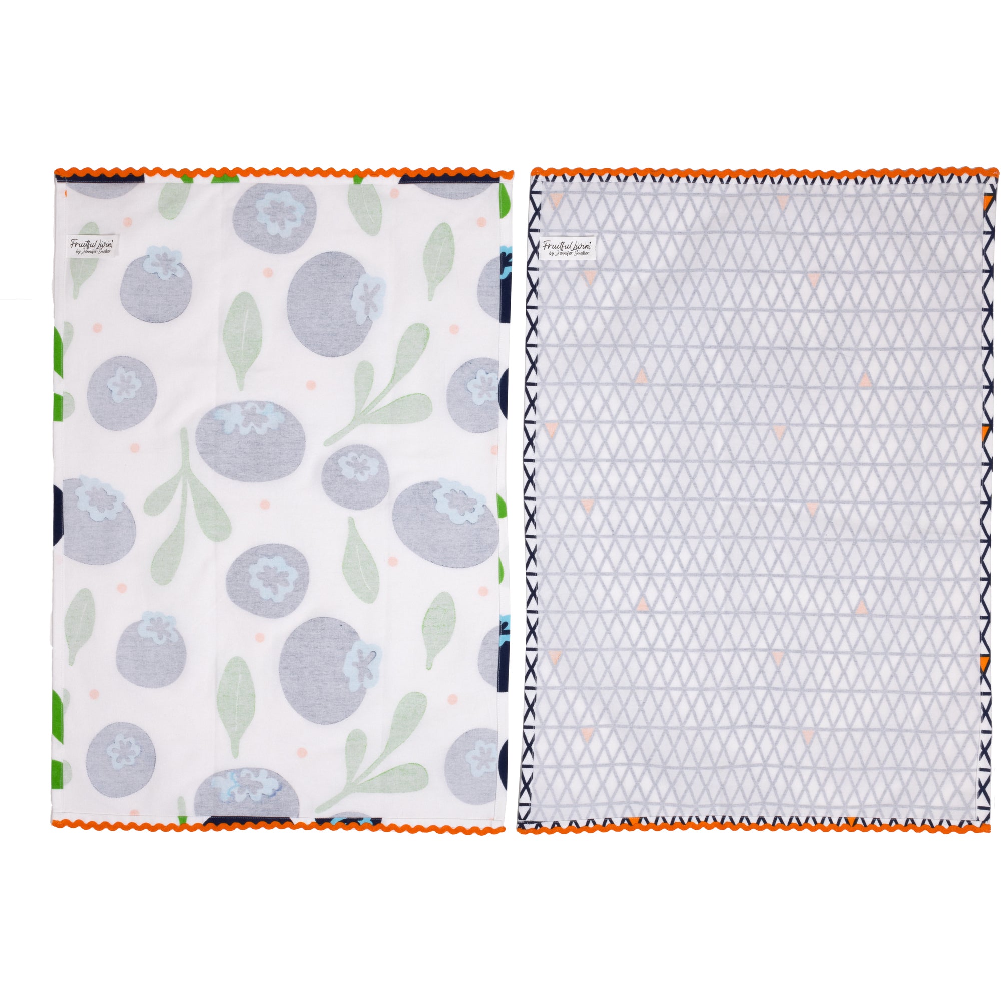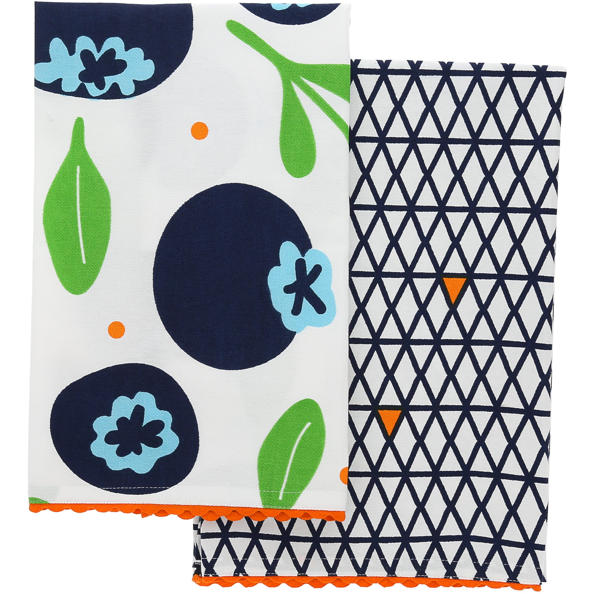 - IN-HOUSE DESIGN: Each towel bears its own design. One with large blueberries with green stems, orange polka dots, and orange wavy trim on a white background. The second towel features a navy blue and orange triangle pattern on a white background and orange wavy trim.