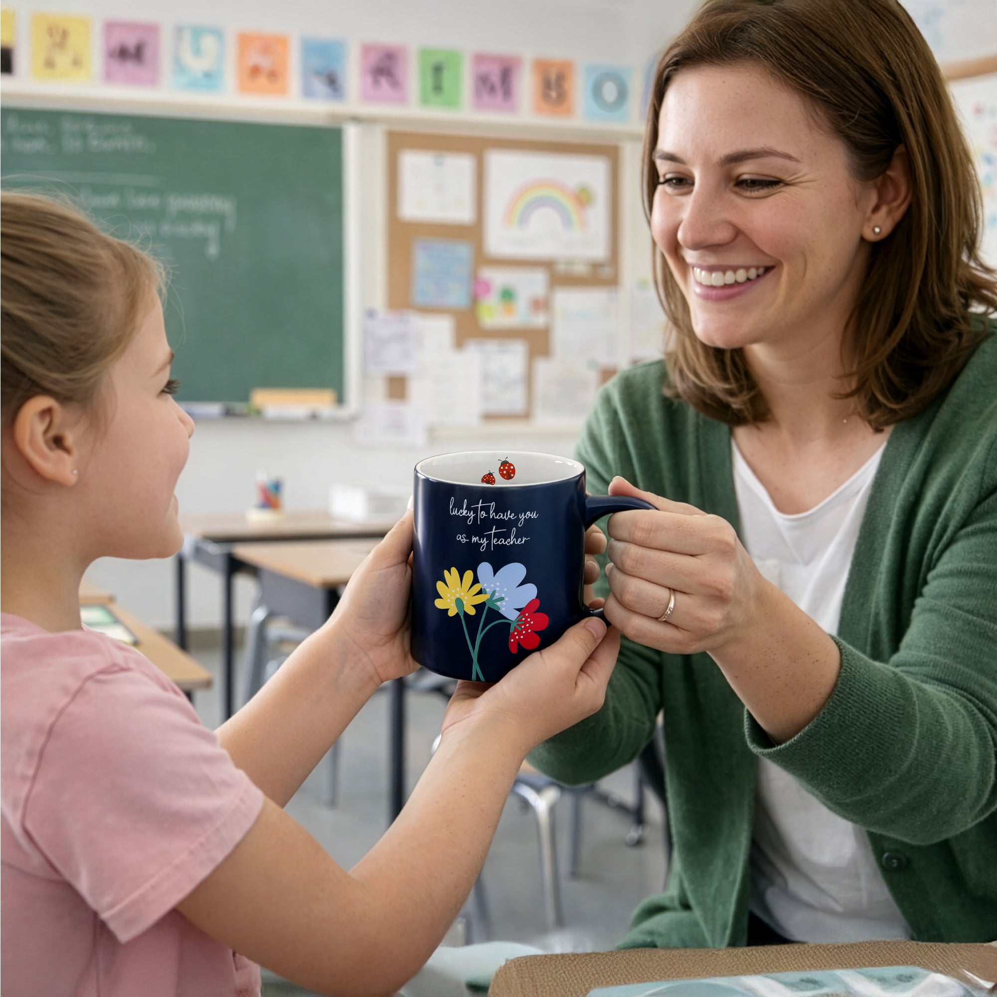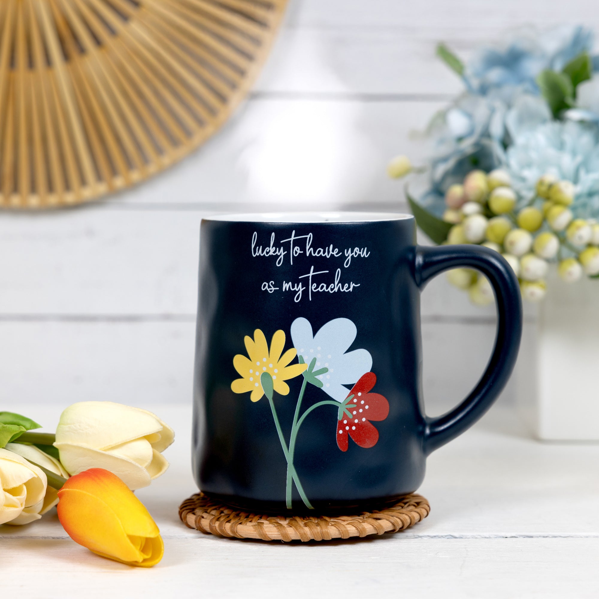 - IN-HOUSE DESIGN: Features a navy background adorned with colorful floral illustrations and the handwritten sentiment “lucky to have you as my teacher.” The interior rim includes a tiny ladybug decal—a playful hidden detail that makes each use feel special. Bright, uplifting, and garden-inspired, the design pairs modern floral artwork with heartfelt gratitude.