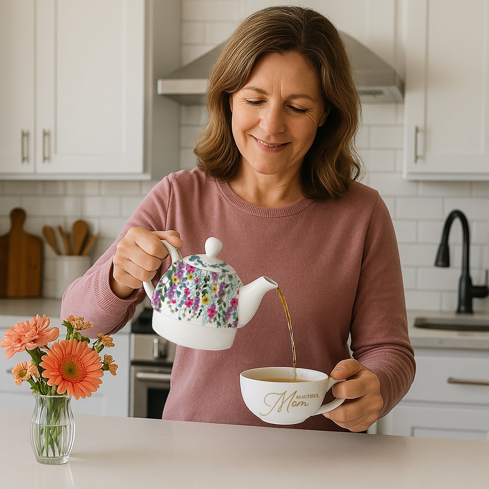 - IN-HOUSE DESIGN: The design boasts a beautiful full-wrap floral motif inspired by classic garden blooms, wrapping around both the teapot and teacup (excluding the handle and interior). The cup features a golden "Beautiful Mom" decal in a delicate, cursive font, giving a touch of elegance to the set. The lid completes the look with a glossy white finish, blending seamlessly with the teacup and teapot for a cohesive design.