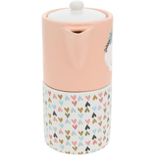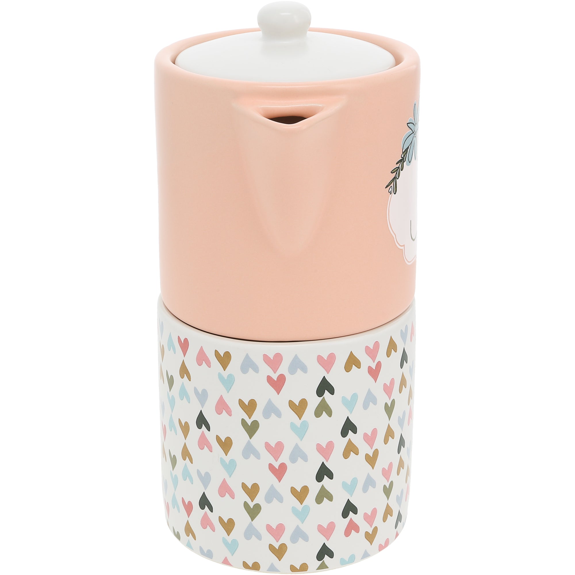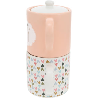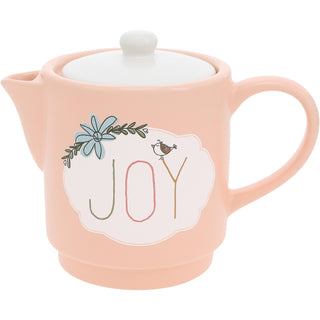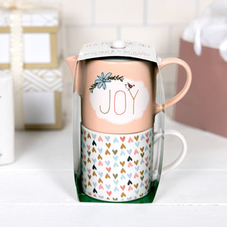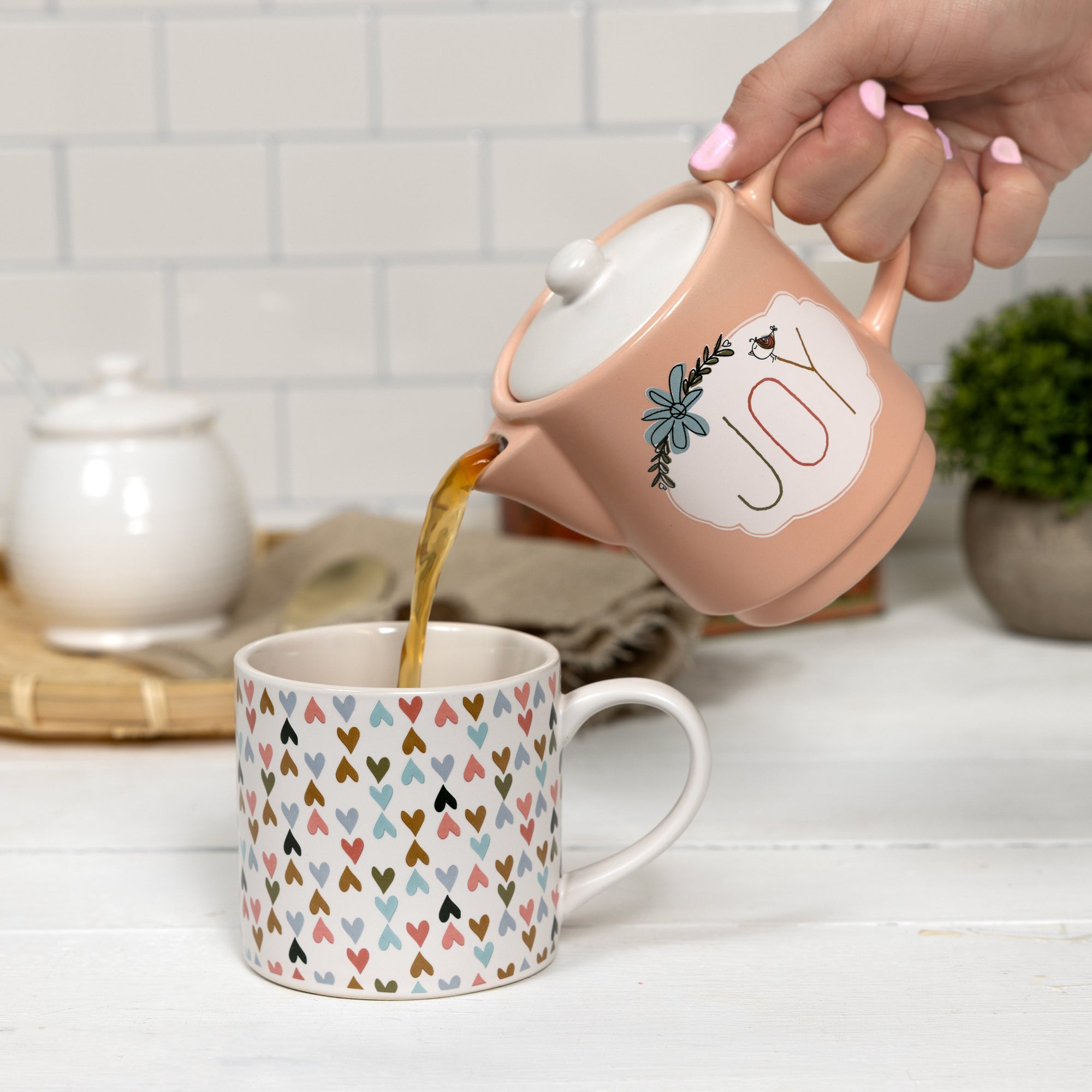 • IN-HOUSE DESIGN: The soft peachy-pink teapot features an uplifting "JOY" sentiment framed in floral hand-drawn details. The coordinating mug below showcases a pattern of multi-colored hearts and whimsical floral accents, creating a warm, inviting, and cheerful design. The soft pastel hues and delicate artistic details make this set an eye-catching and meaningful piece for any tea lover.